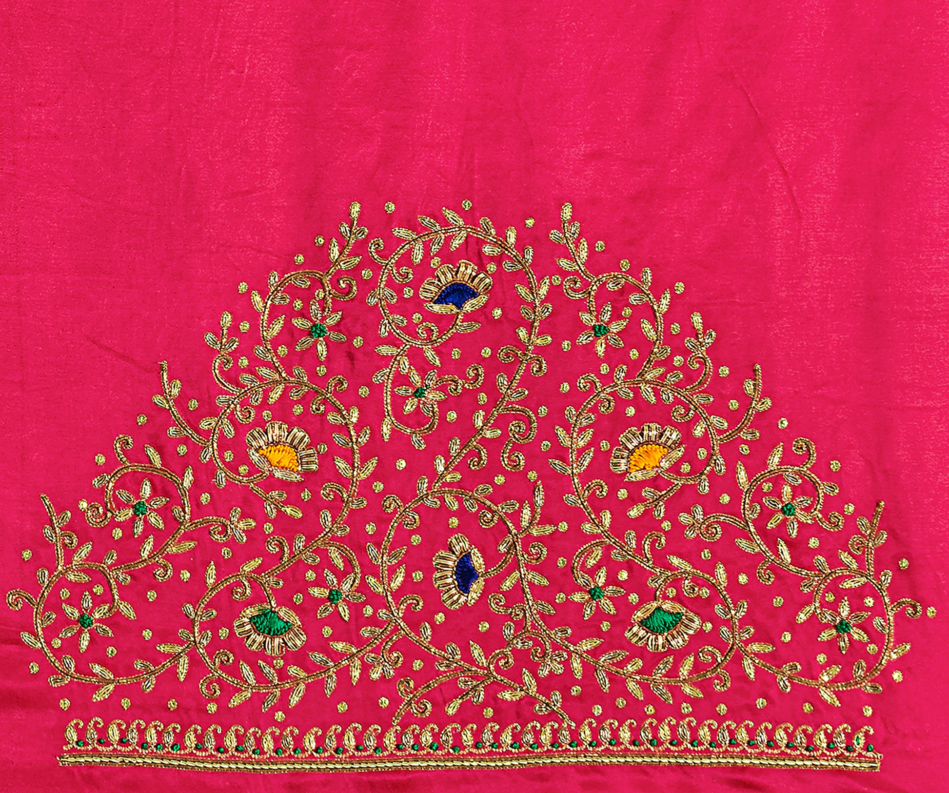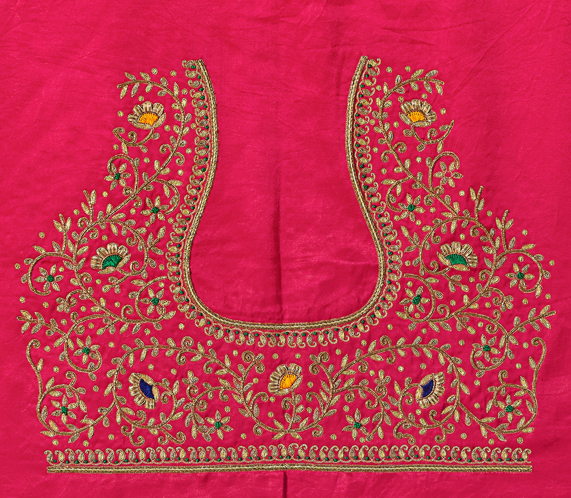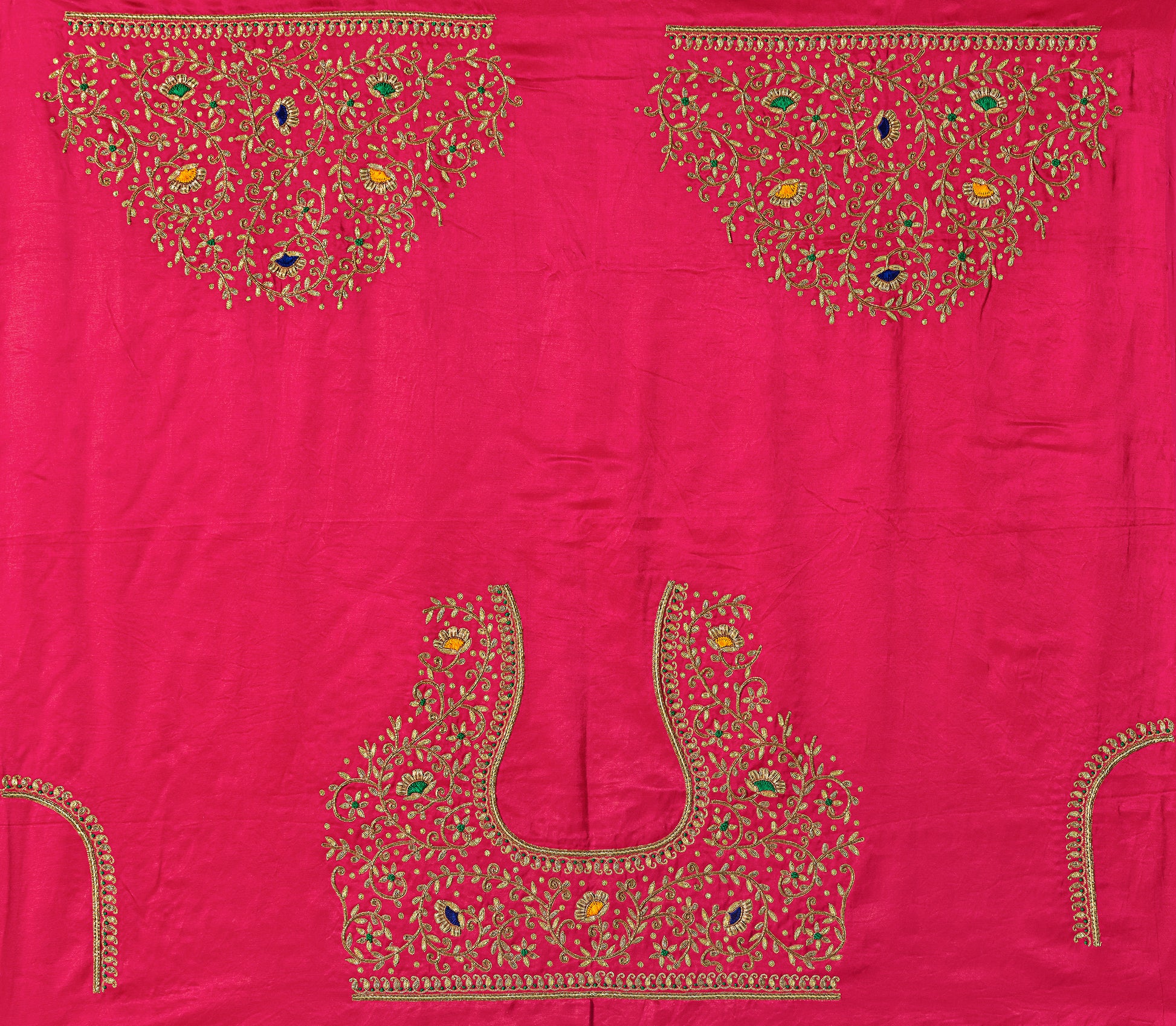 Crafted from luxurious Gaji silk, this designer blouse features intricate Jaal Zardozi work that exudes elegance and tradition. The rich hand embroidery adds depth and charm, making it ideal for weddings, festive events, or special occasions. Pair it with classic drapes to create a timeless and regal ethnic ensemble.