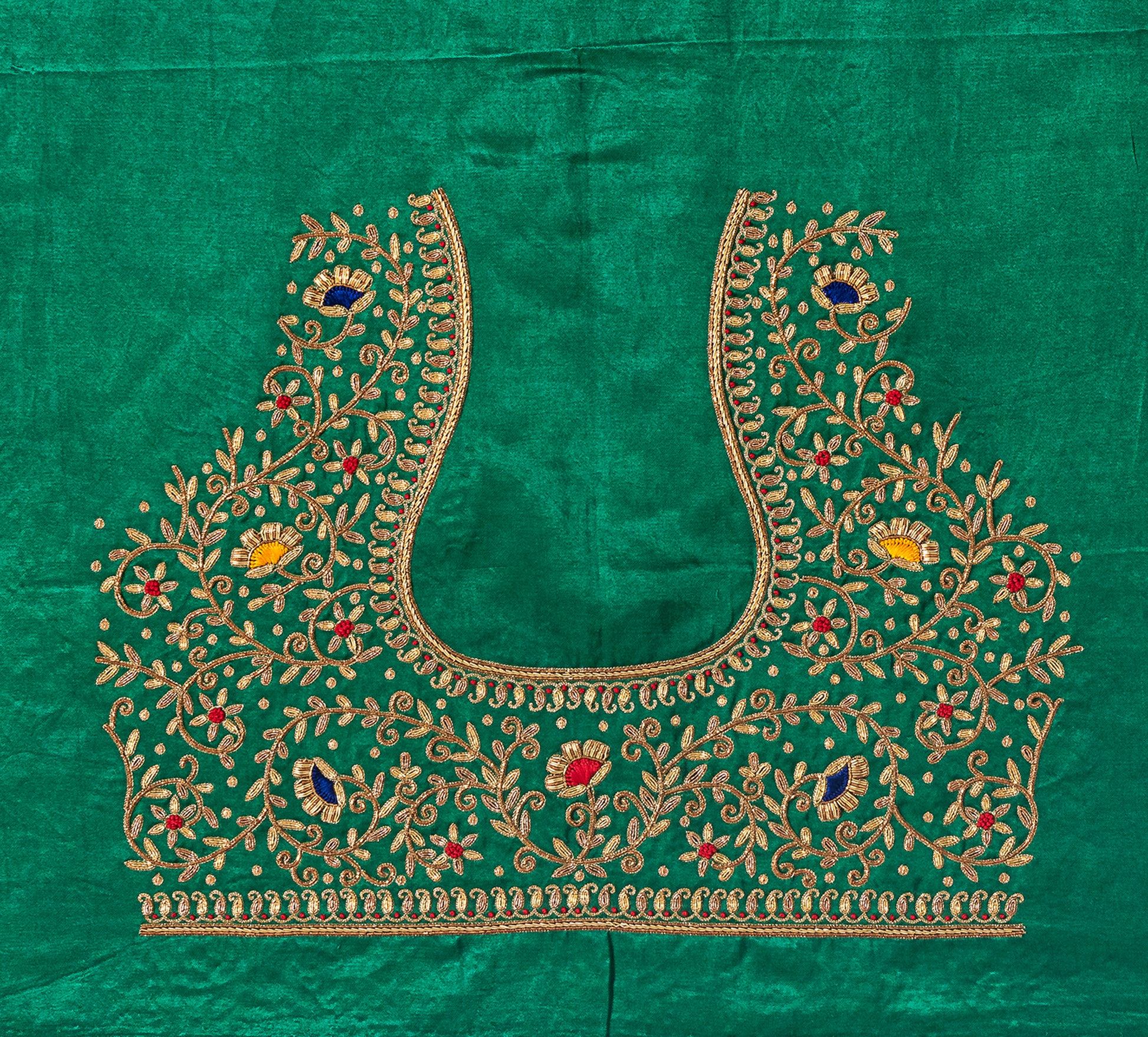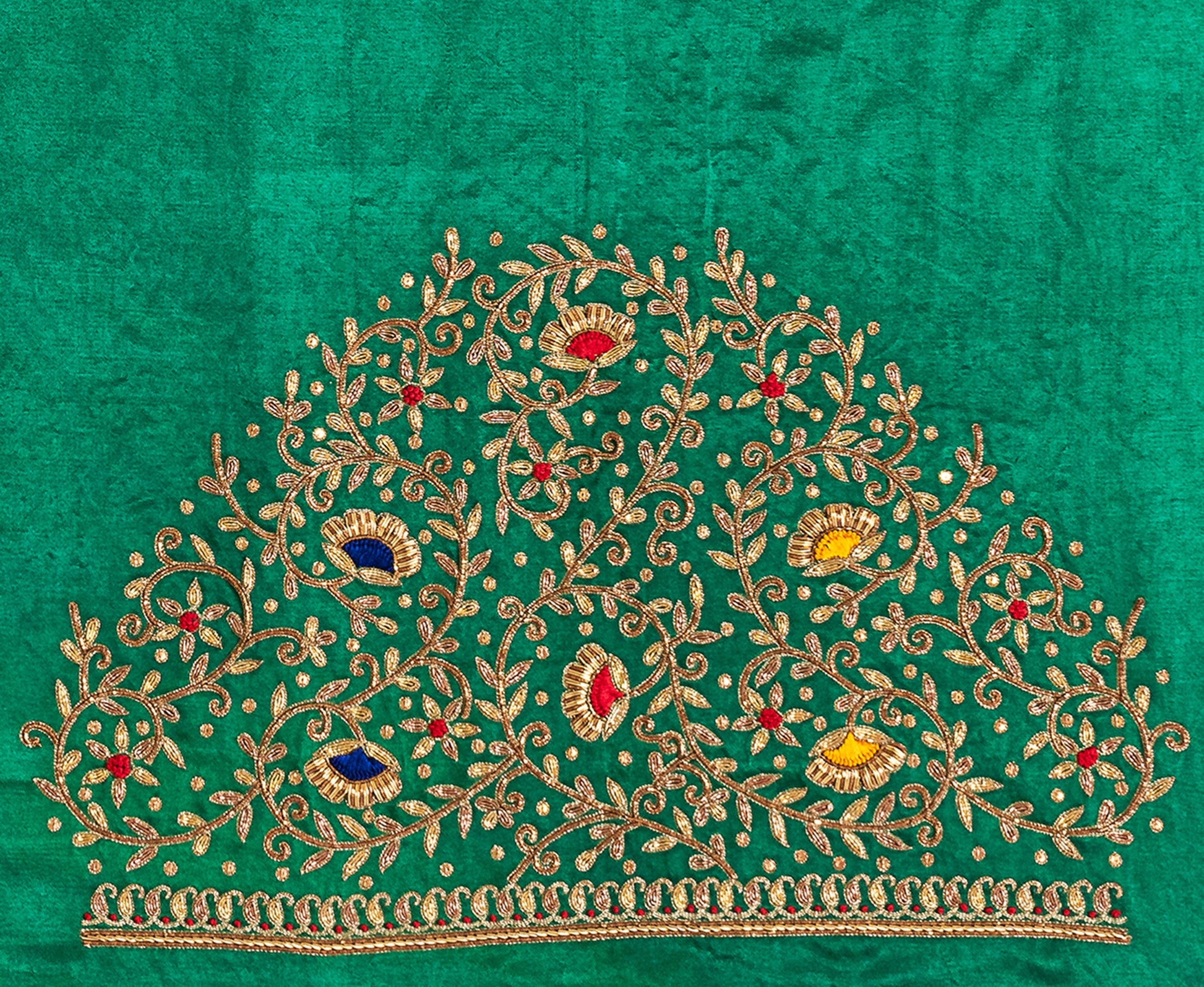 Crafted from luxurious Gaji silk, this designer blouse features intricate Jaal Zardozi work that exudes elegance and tradition. The rich hand embroidery adds depth and charm, making it ideal for weddings, festive events, or special occasions. Pair it with classic drapes to create a timeless and regal ethnic ensemble.