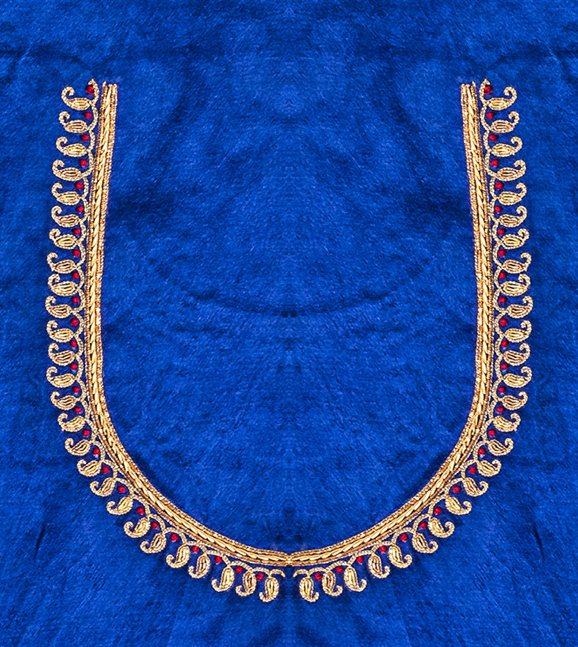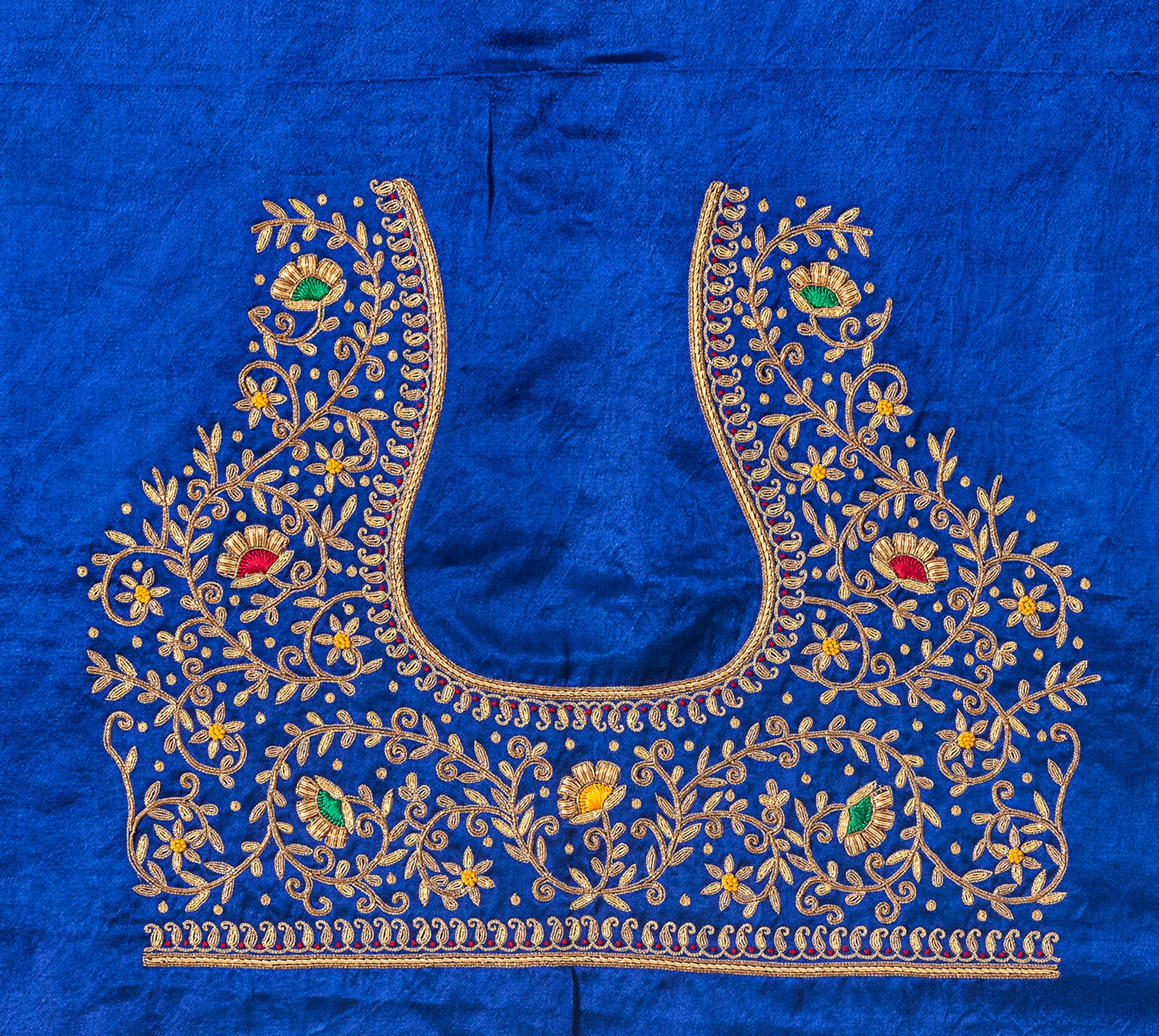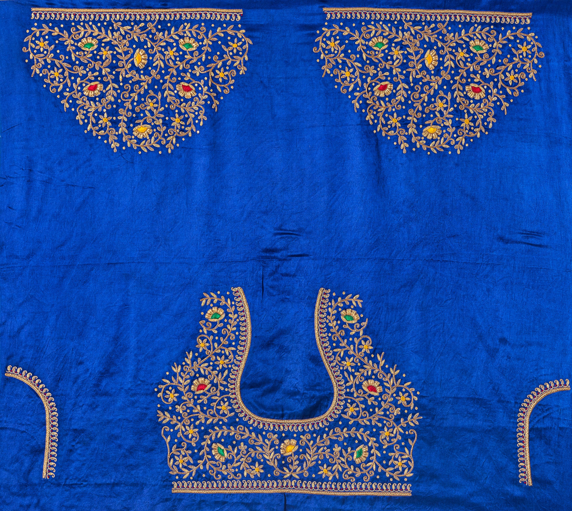 Crafted from luxurious Gaji silk, this designer blouse features intricate Jaal Zardozi work that exudes elegance and tradition. The rich hand embroidery adds depth and charm, making it ideal for weddings, festive events, or special occasions. Pair it with classic drapes to create a timeless and regal ethnic ensemble.