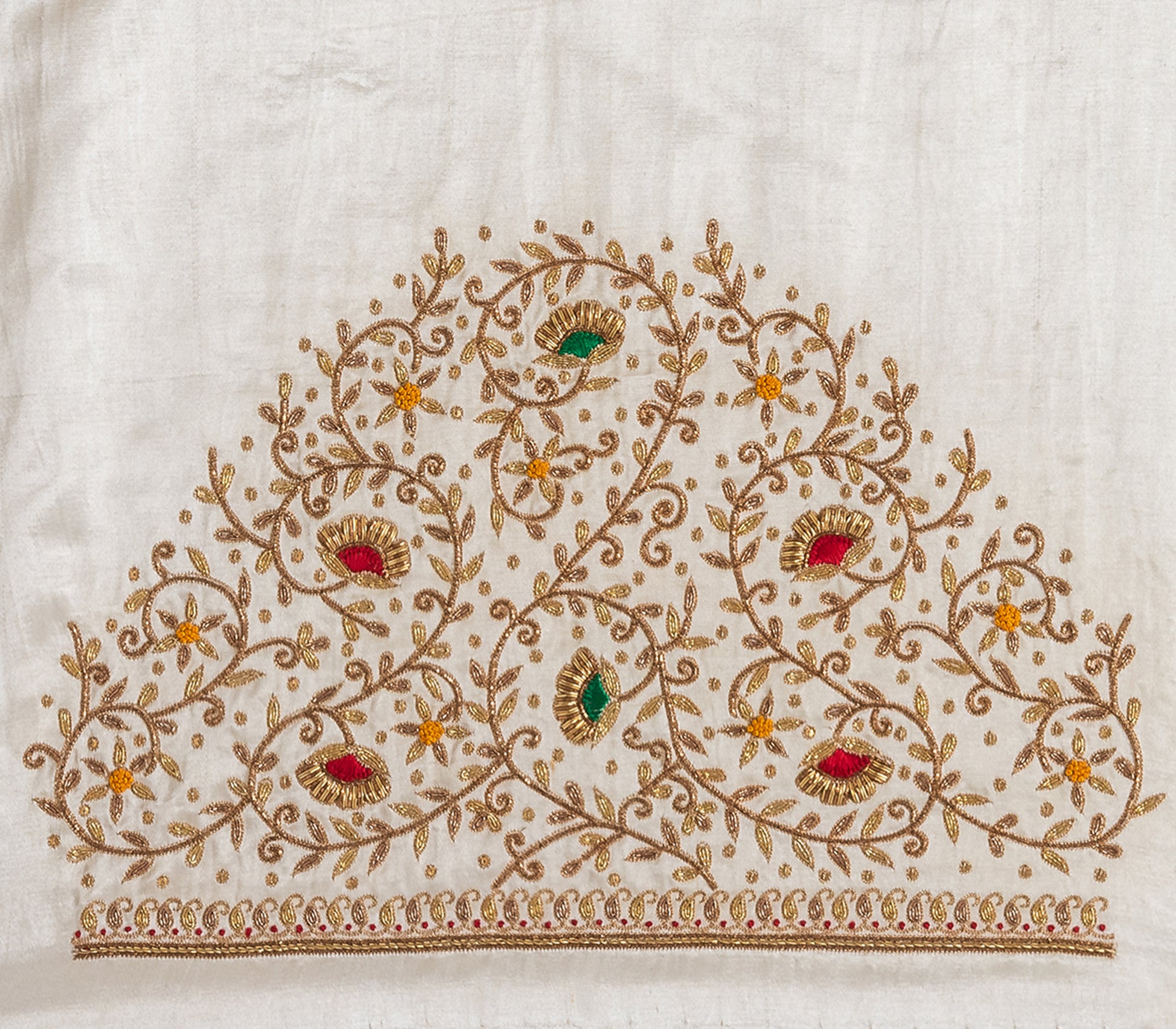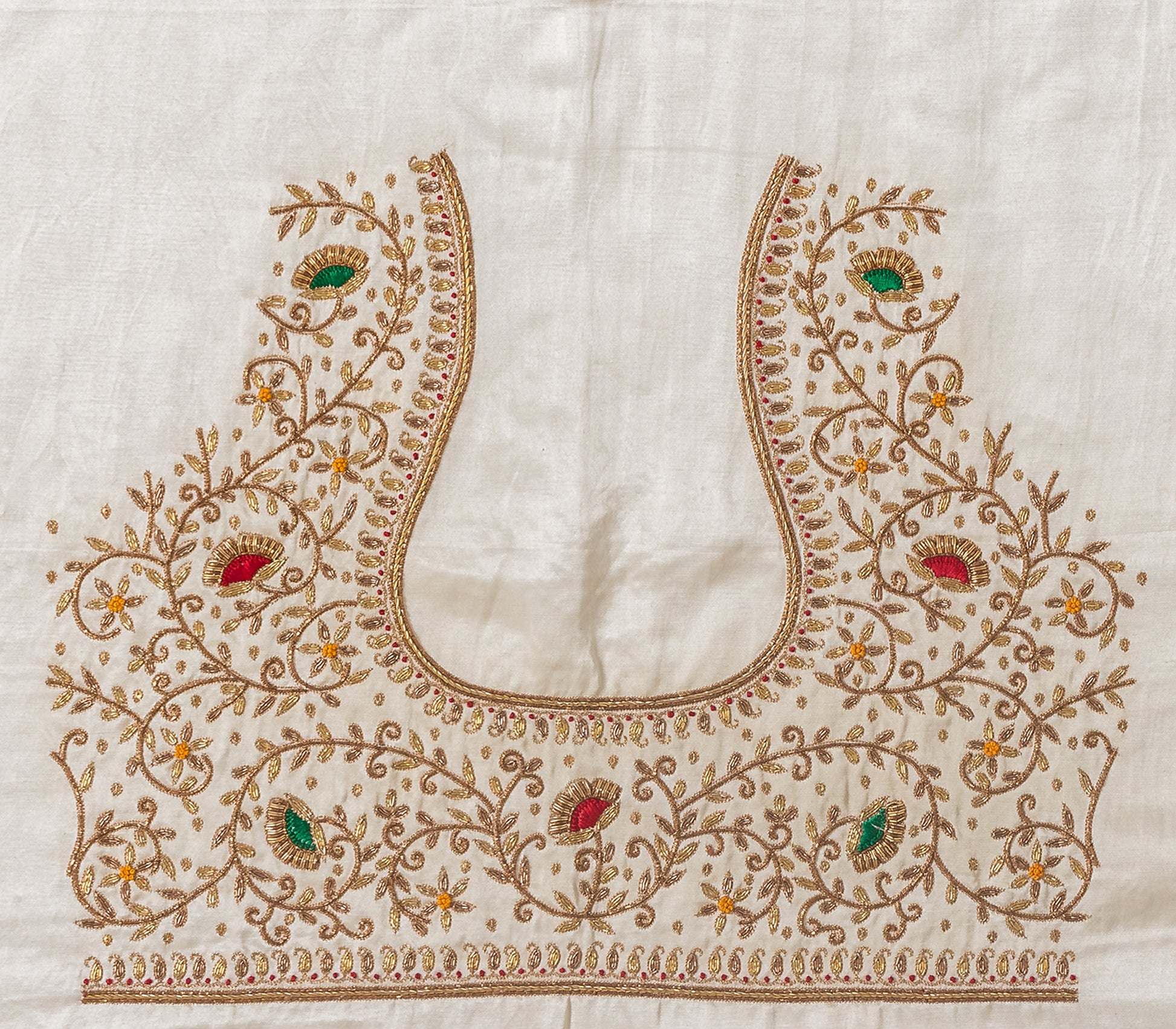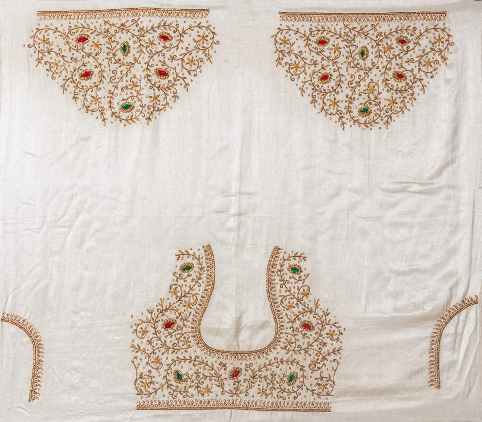 Crafted from luxurious Gaji silk, this designer blouse features intricate Jaal Zardozi work that exudes elegance and tradition. The rich hand embroidery adds depth and charm, making it ideal for weddings, festive events, or special occasions. Pair it with classic drapes to create a timeless and regal ethnic ensemble.