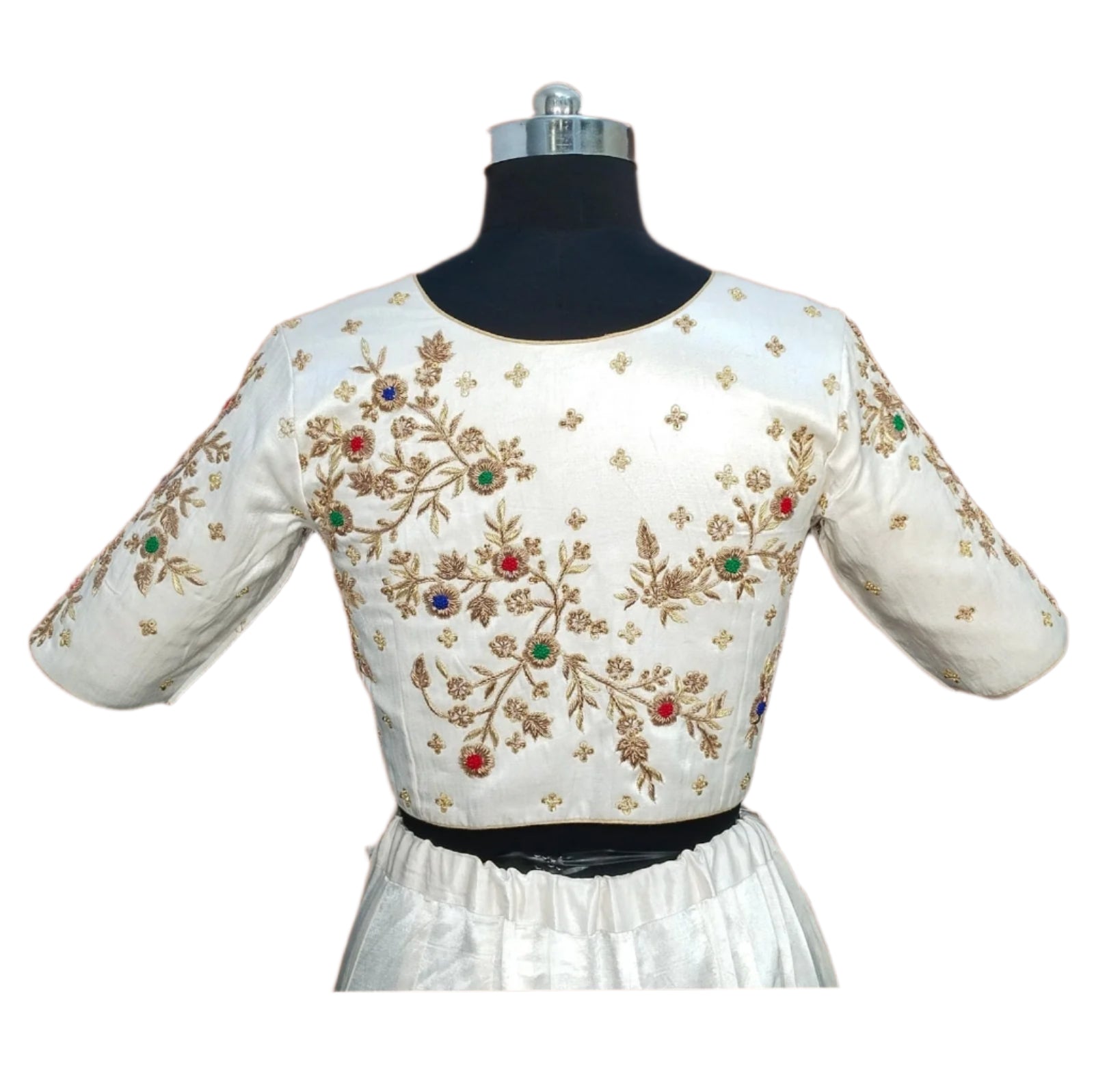 Turn heads with the Asymmetric Zardozi Art Blouse, featuring bold, uneven motifs handcrafted with intricate zardozi embroidery. This designer piece blends traditional artistry with a modern, asymmetric twist, making it perfect for festive occasions and stylish ethnic looks. Pair it with sarees or skirts for a statement-making ensemble.