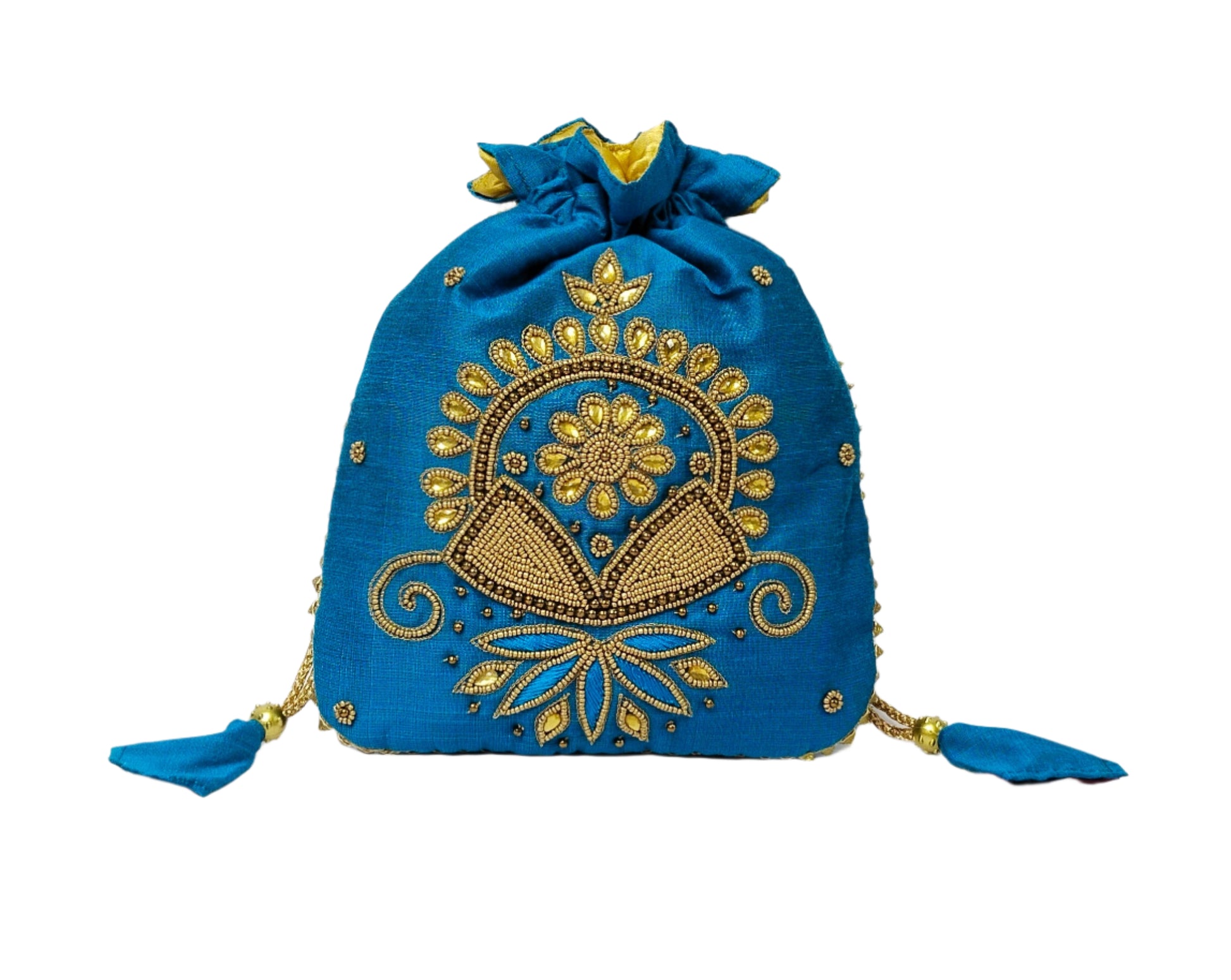 A beautiful beads work potli batwa, intricately hand-embroidered using fine metallic threads in traditional Zardozi style. Crafted from luxurious semi-raw silk, it radiates royal elegance. Perfect for queens at heart, its freehand design and detailed motifs make it an ideal statement piece for weddings, festivities, or grand celebrations.