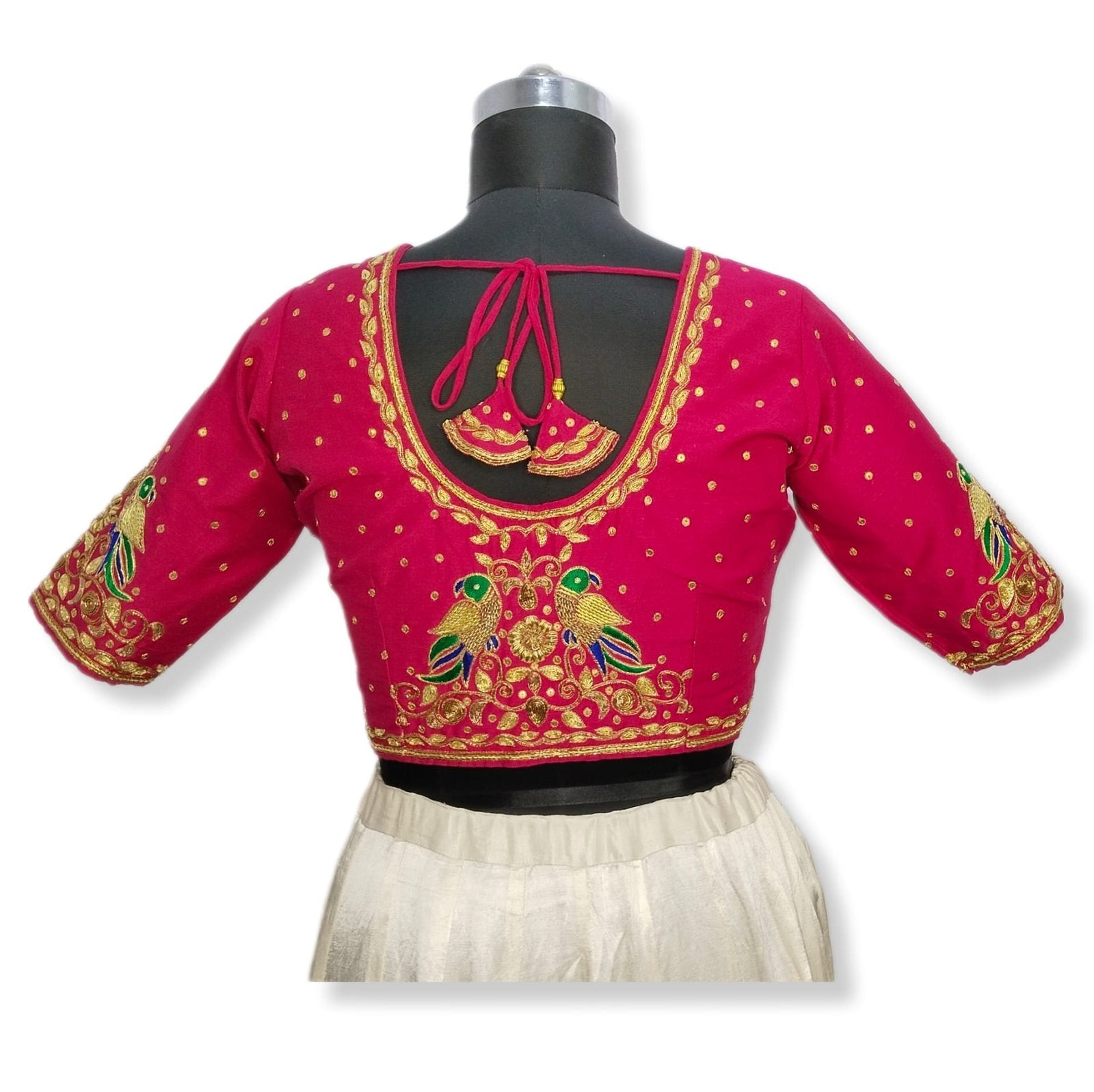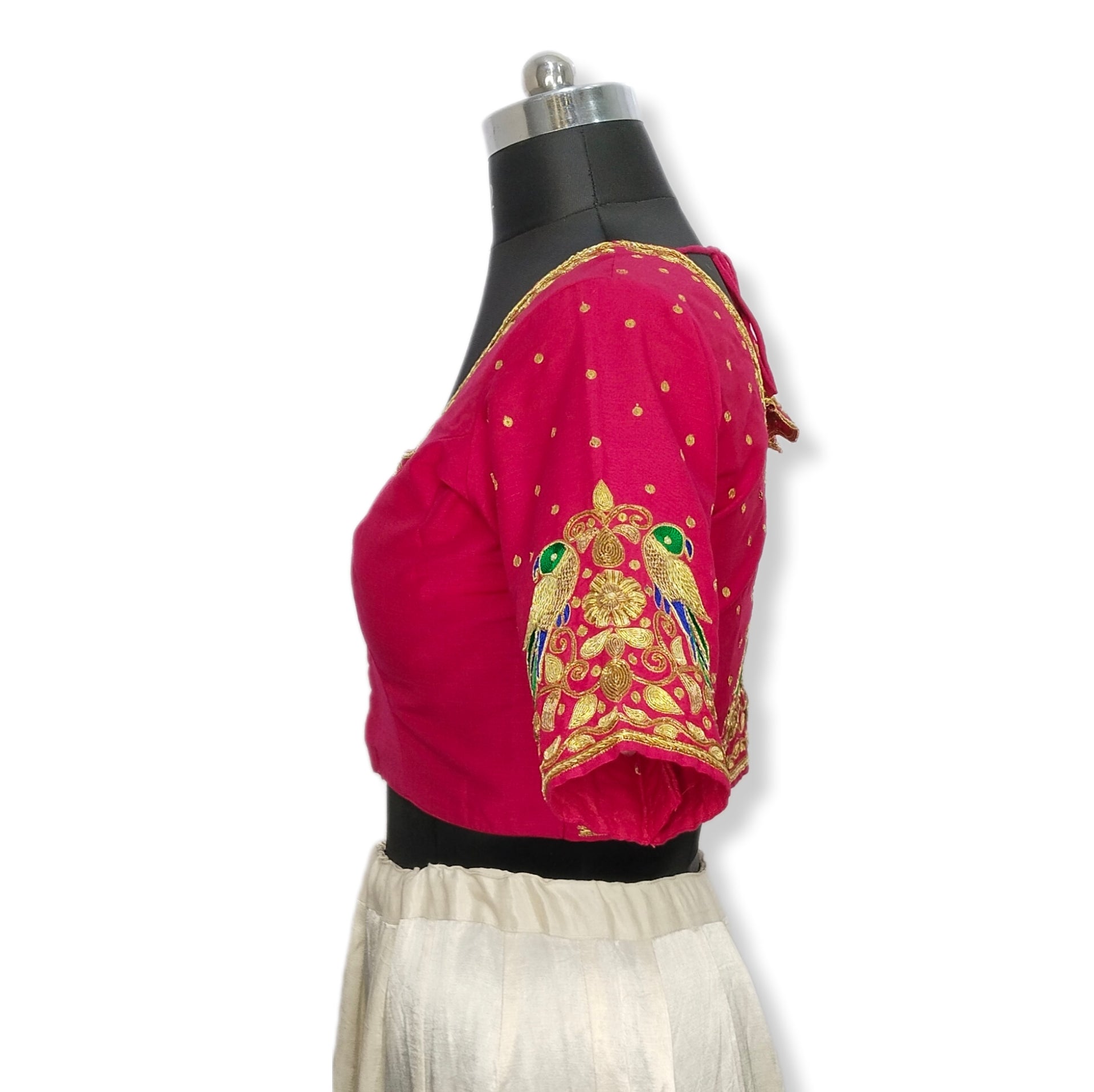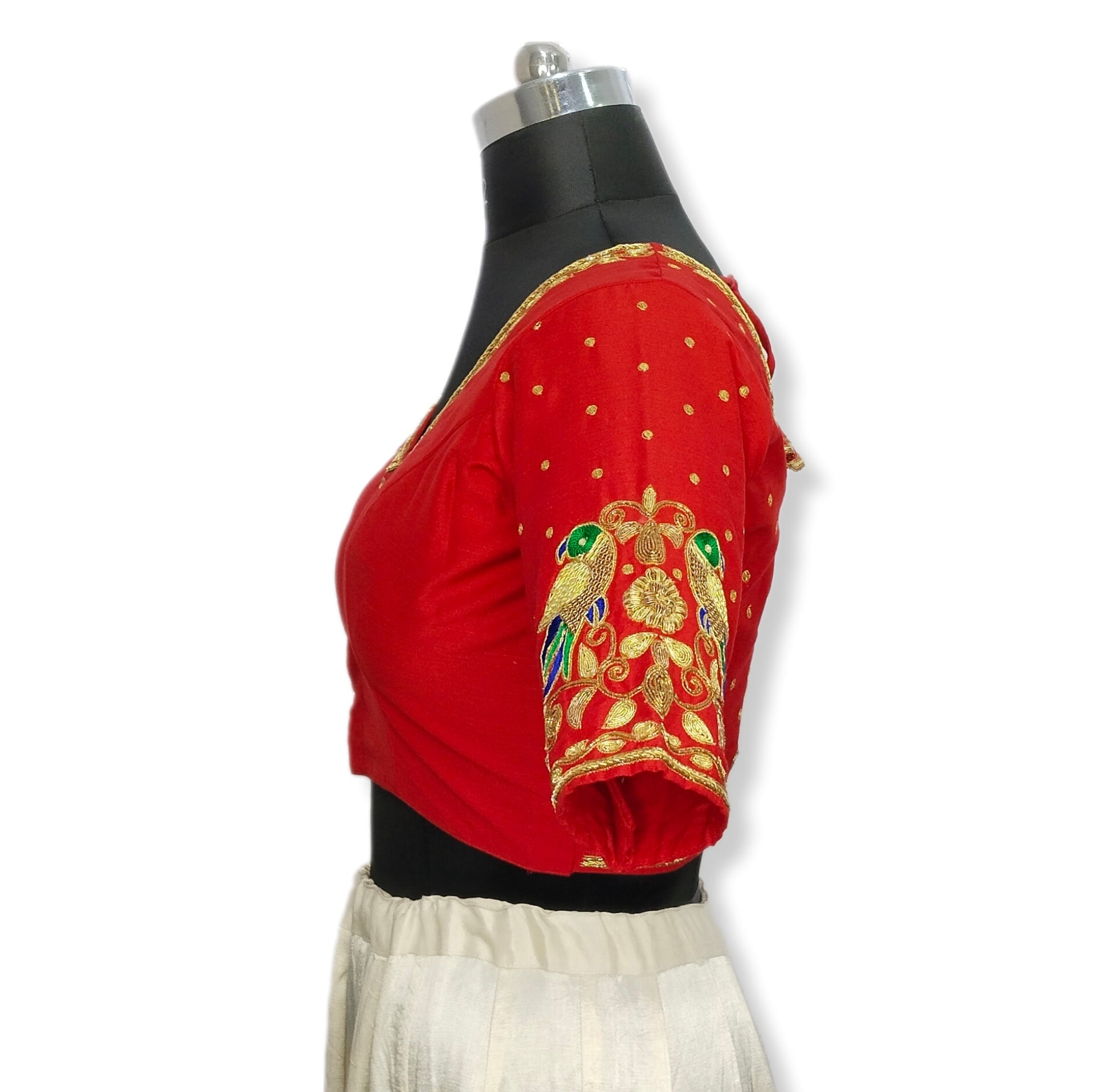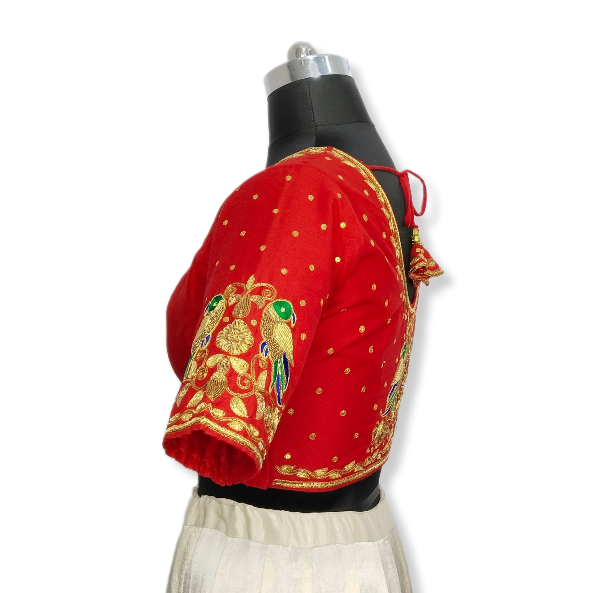 This vibrant Gujarati Patola blouse features an intricate parrot motif, symbolizing beauty and tradition. Crafted with rich colors and fine detailing, it reflects the timeless elegance of Patola weaving. Perfect for festive occasions, the blouse adds a cultural charm and bold style to any ethnic ensemble.