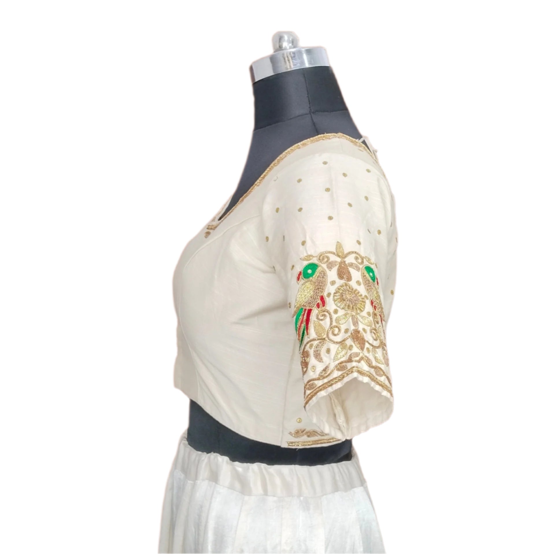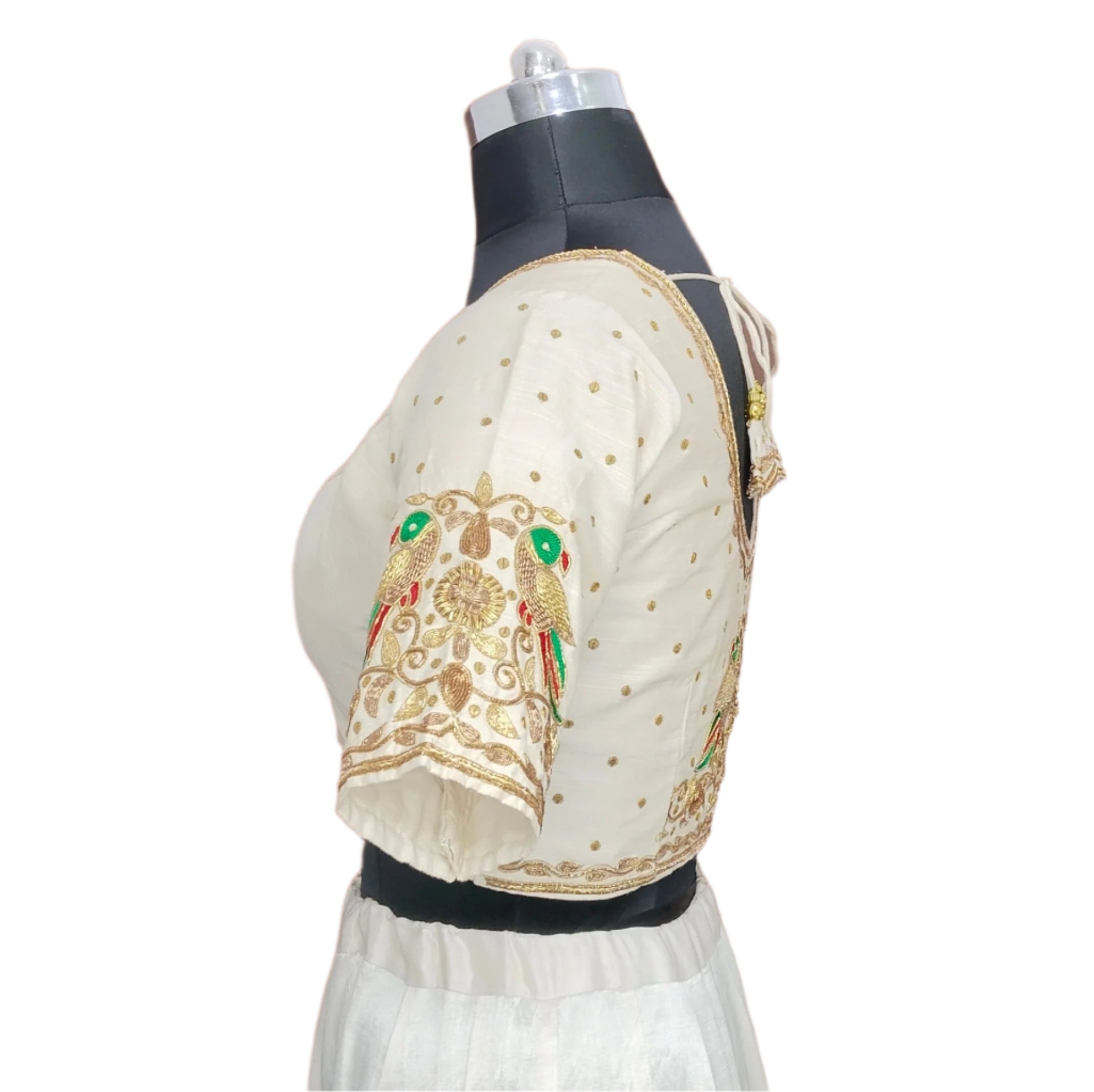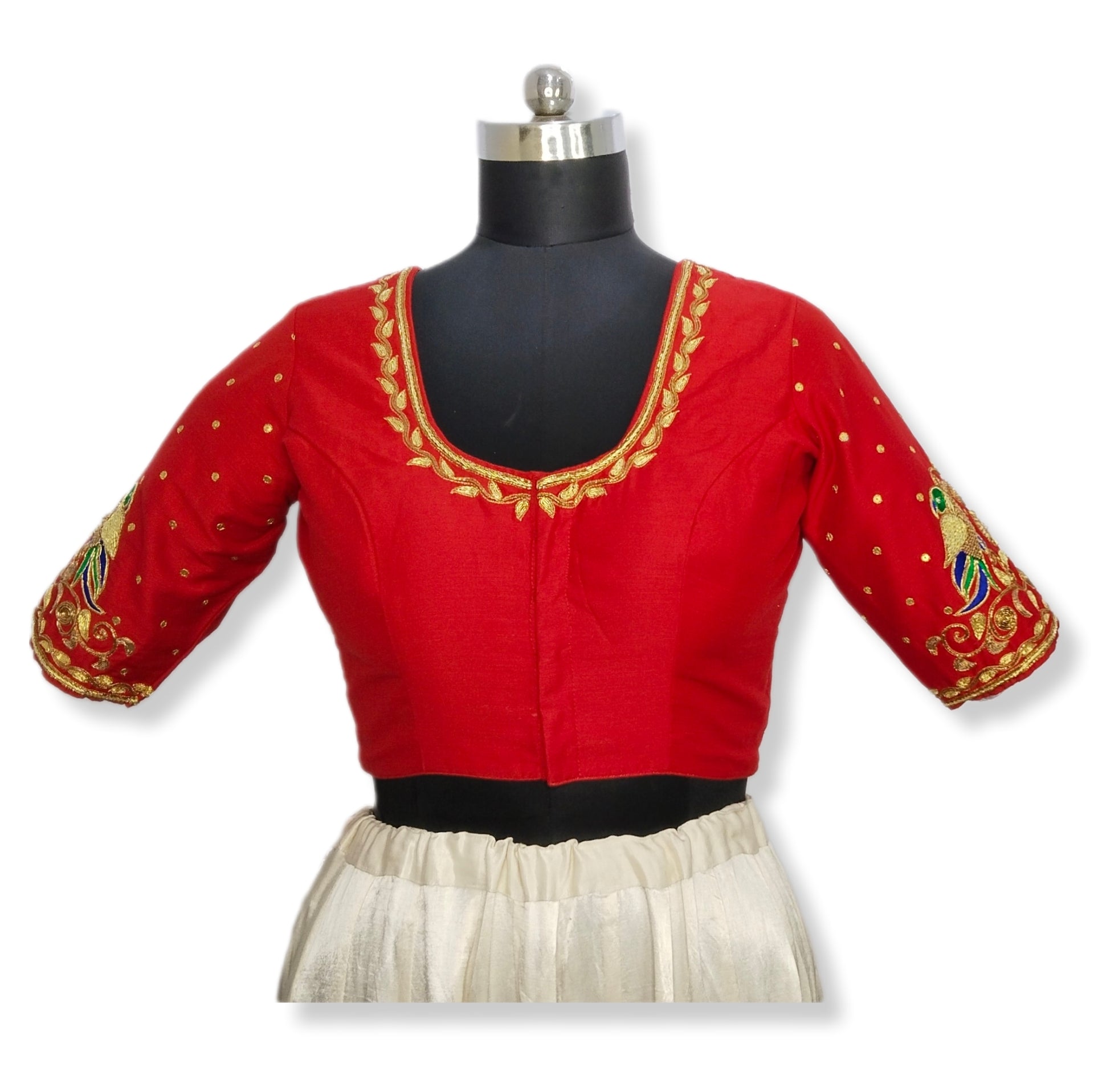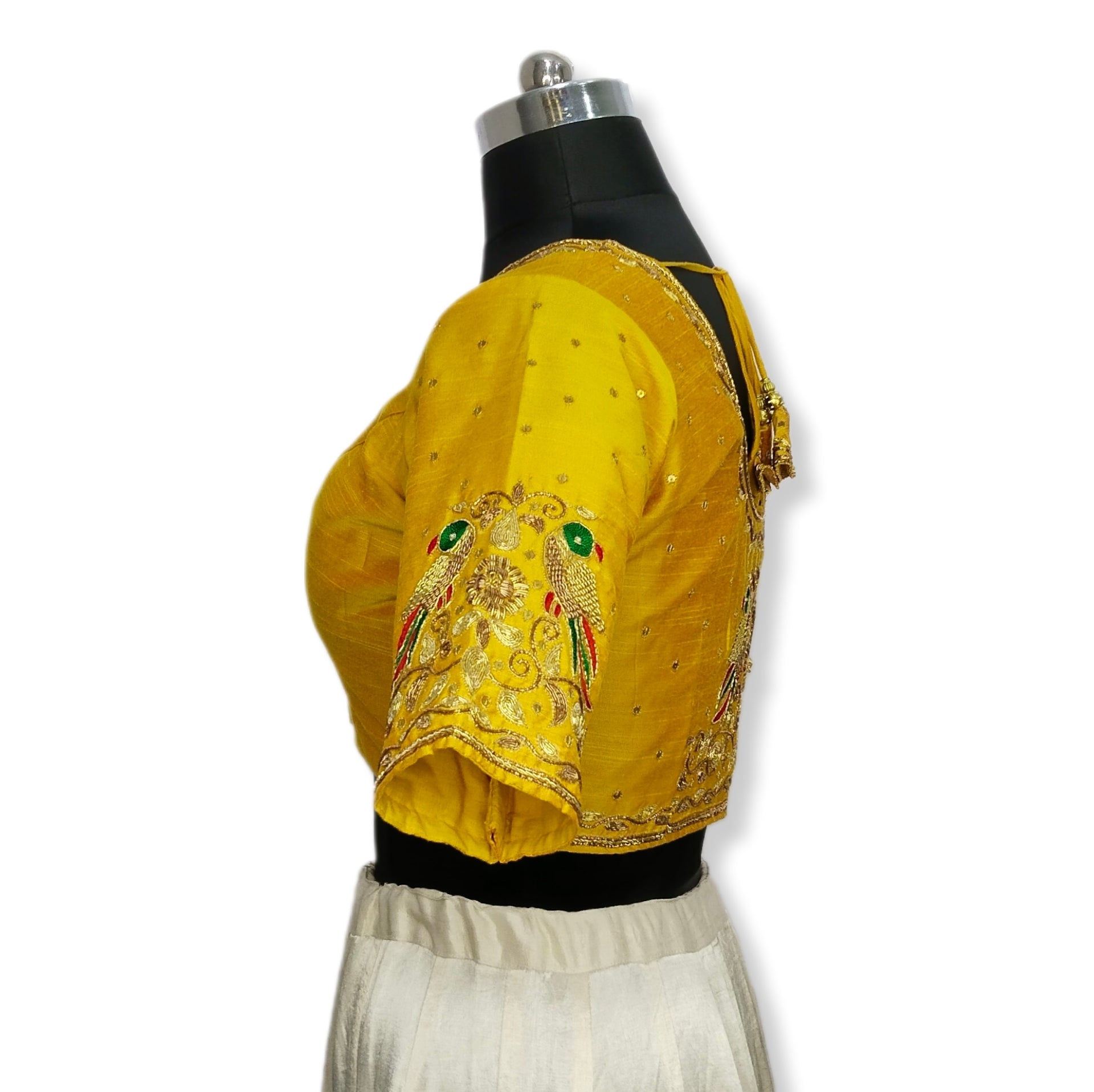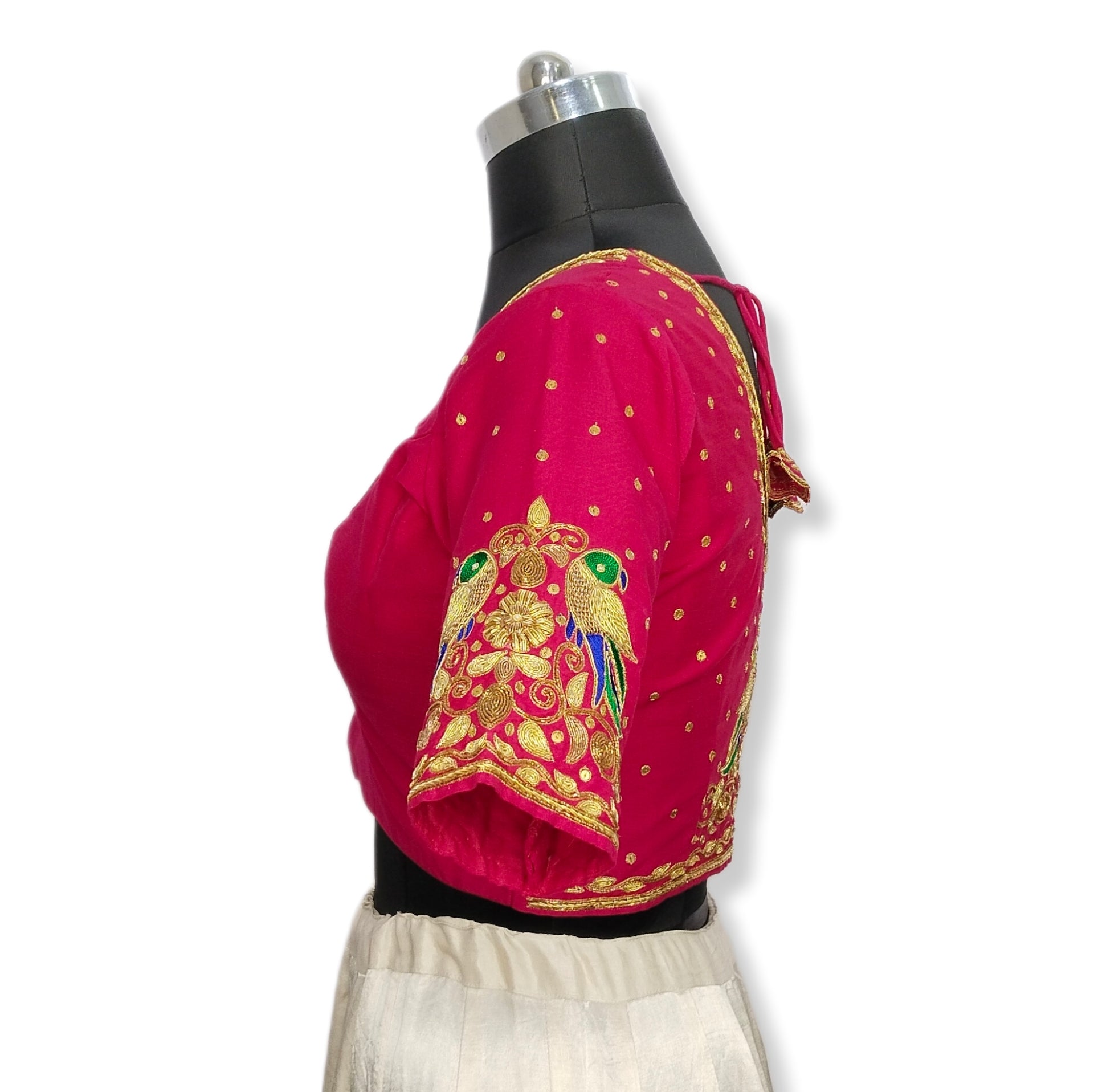 This vibrant Gujarati Patola blouse features an intricate parrot motif, symbolizing beauty and tradition. Crafted with rich colors and fine detailing, it reflects the timeless elegance of Patola weaving. Perfect for festive occasions, the blouse adds a cultural charm and bold style to any ethnic ensemble.