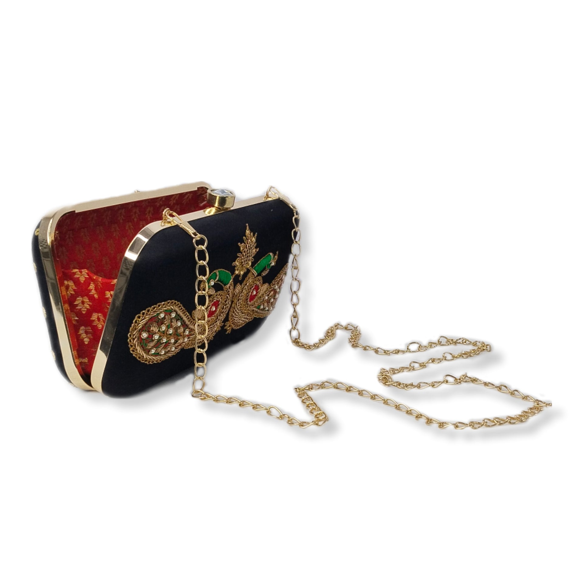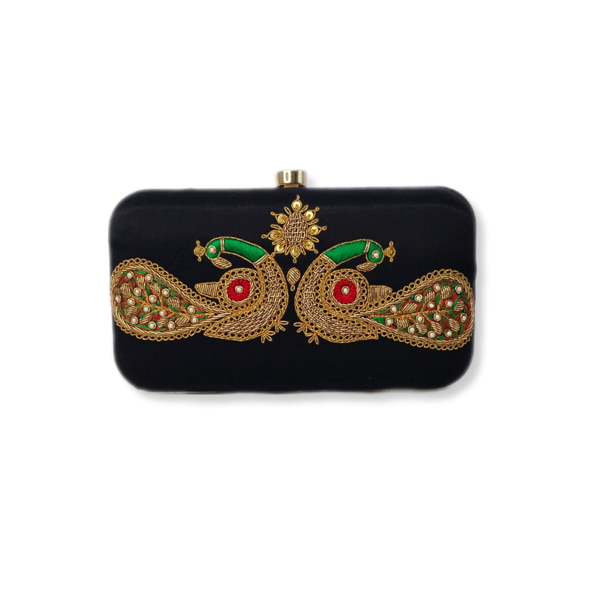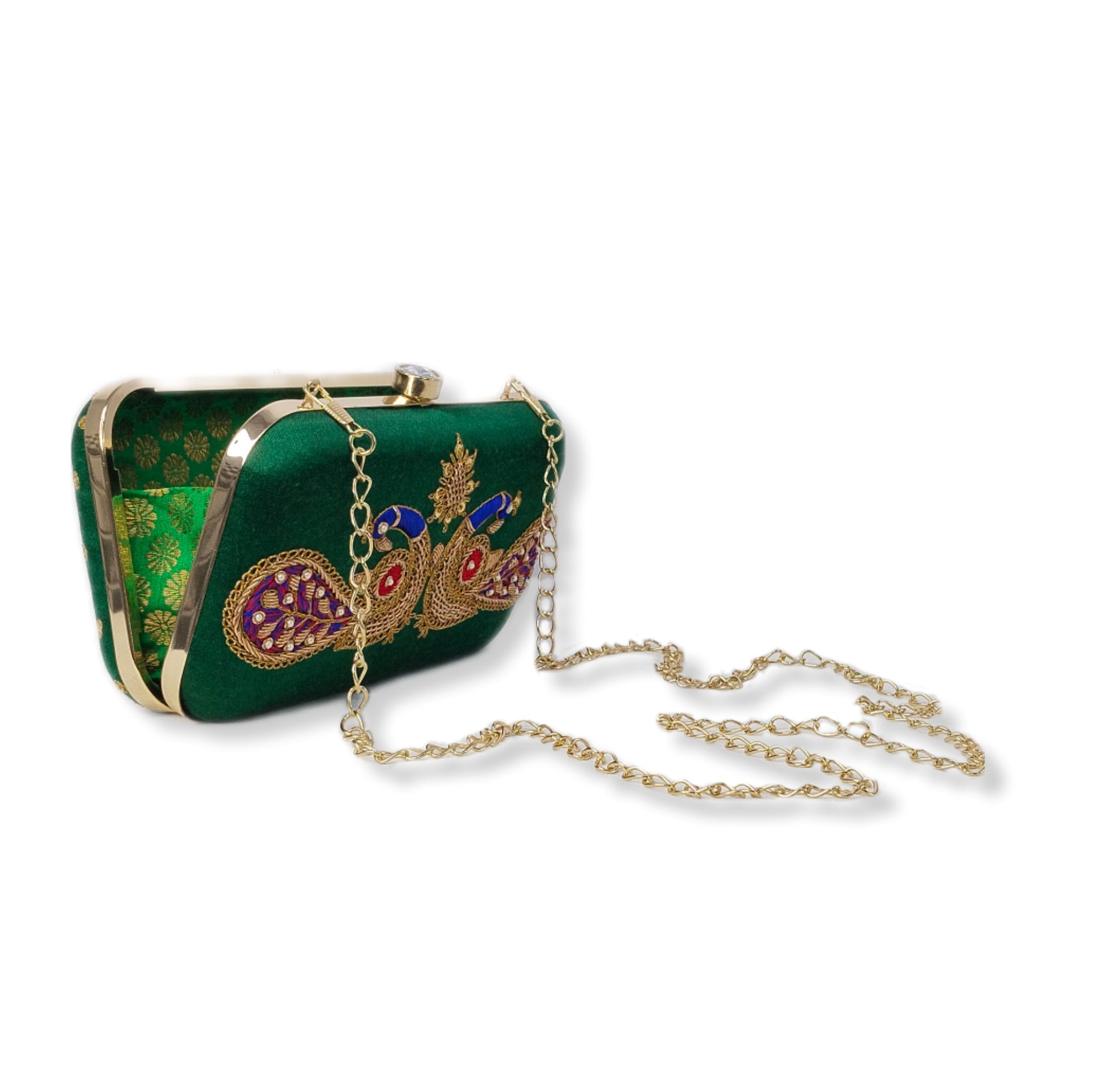 This antique marodi work clutch features intricate hand embroidery with metallic threads, inspired by the royal Indian art of zardozi. Adorned with elegant peacock motifs, it exudes regal charm. Crafted from premium gaji silk, this luxurious box clutch is perfect for formal occasions, making a bold and majestic statement.