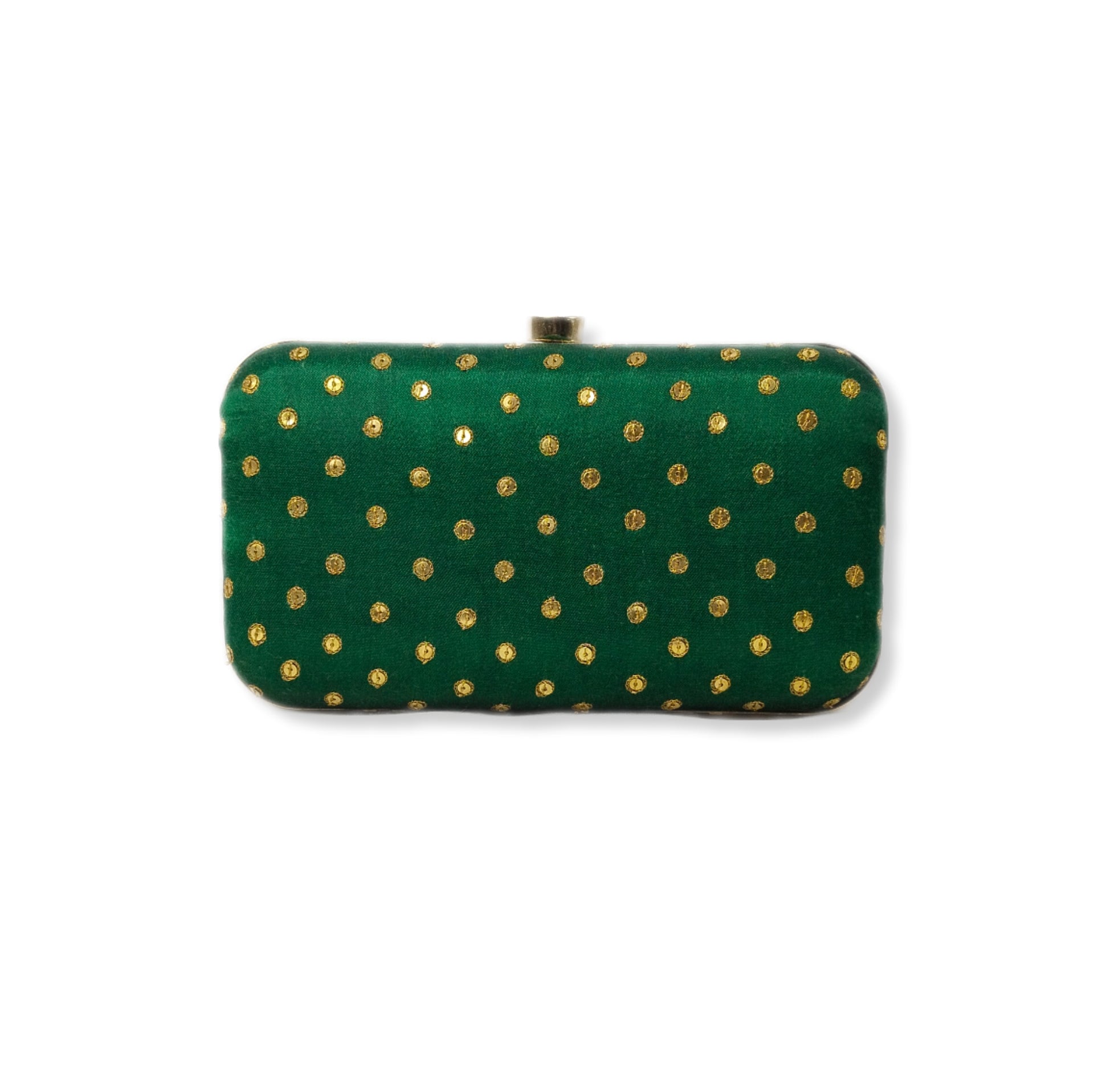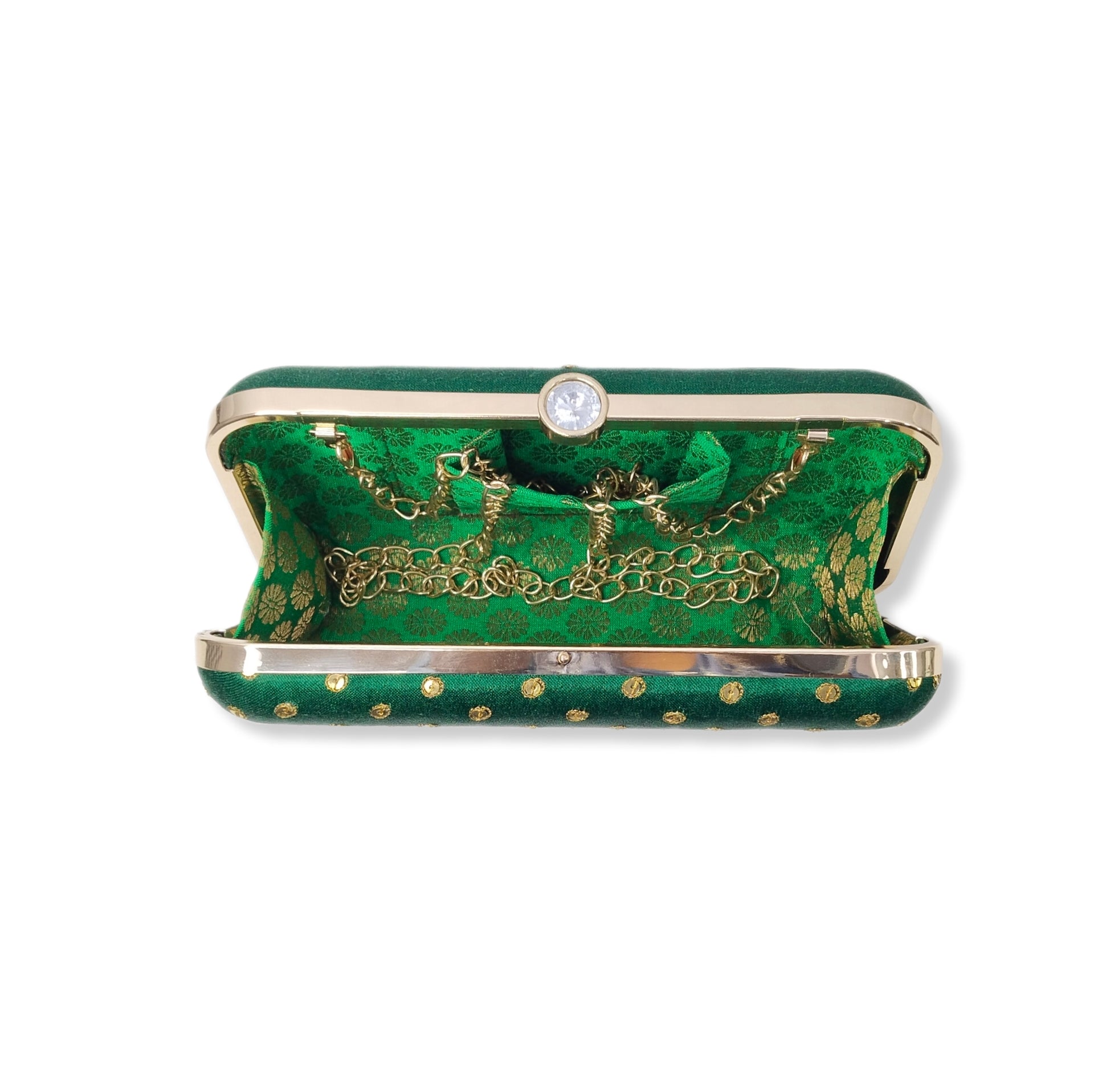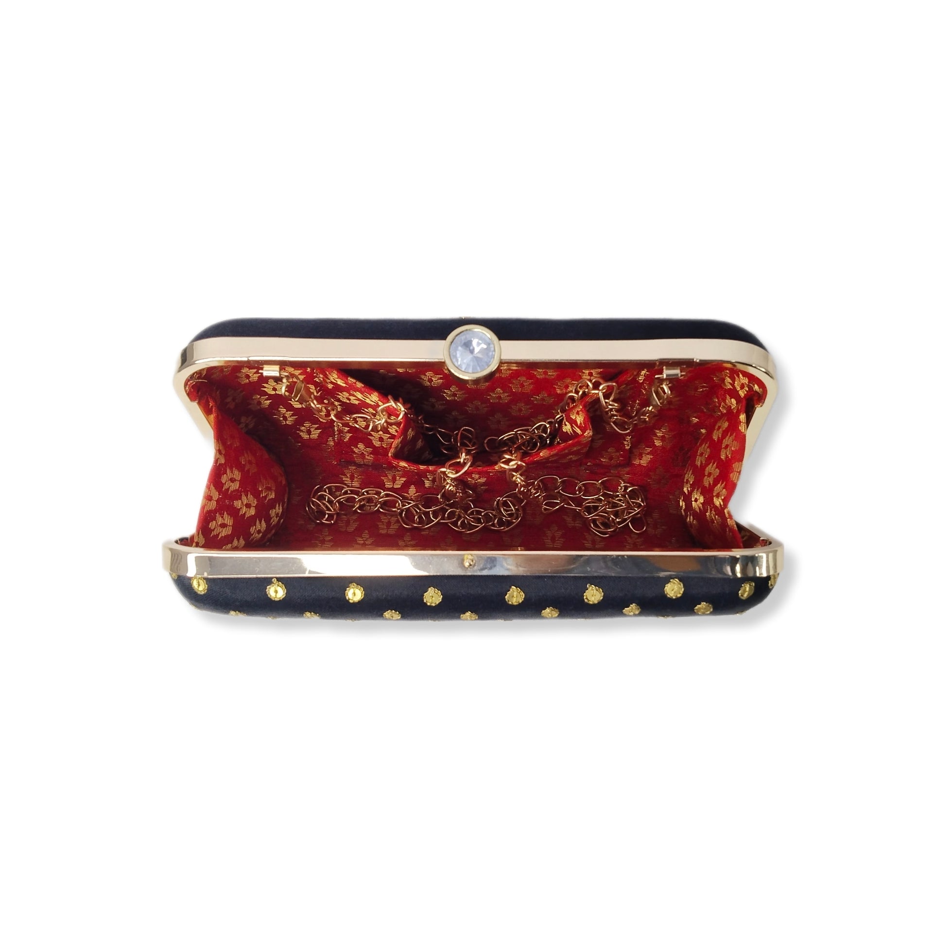 This antique marodi work clutch features intricate hand embroidery with metallic threads, inspired by the royal Indian art of zardozi. Adorned with elegant peacock motifs, it exudes regal charm. Crafted from premium gaji silk, this luxurious box clutch is perfect for formal occasions, making a bold and majestic statement.