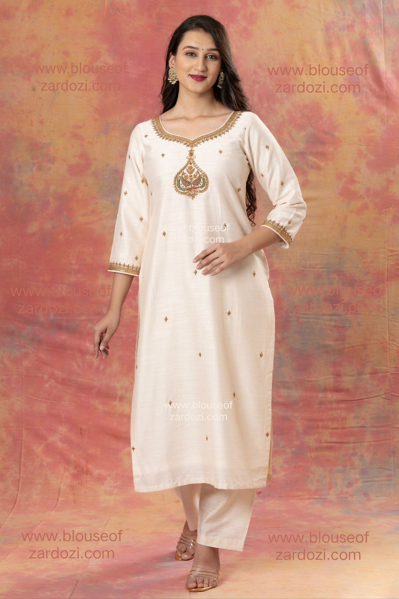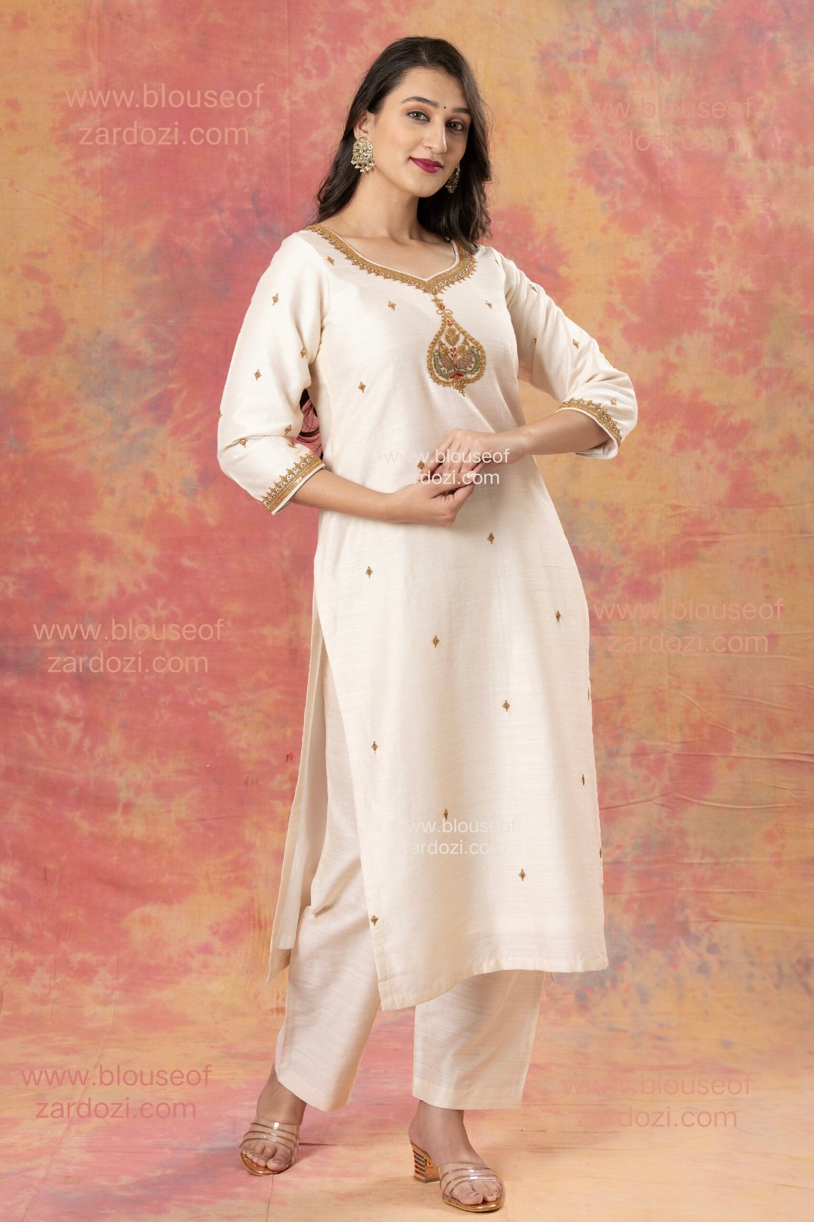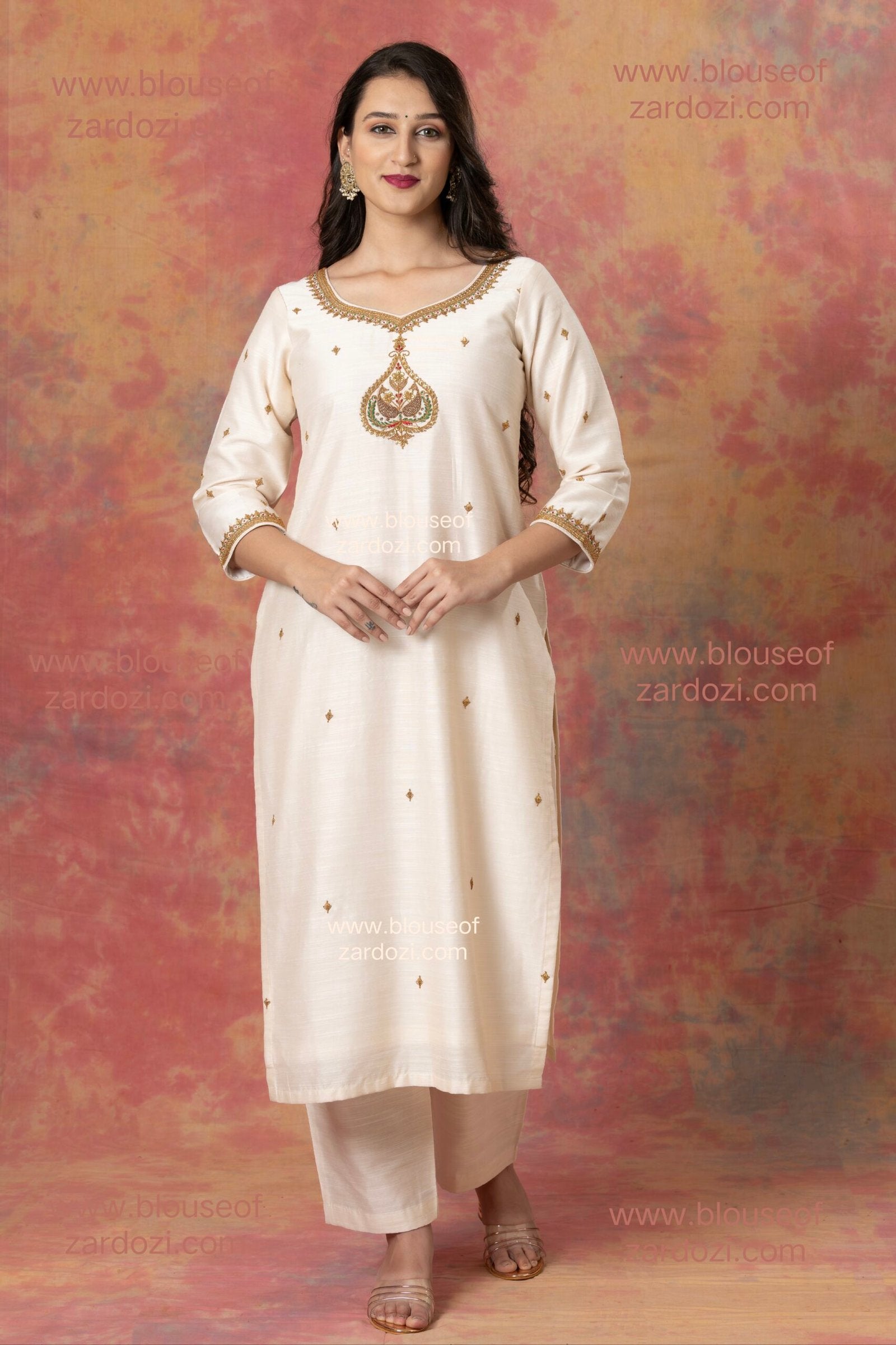 Exude elegance with this Cream Marodi Work Designer Kurta Set. Crafted from luxurious fabric, it features intricate Marodi embroidery, adding a touch of regal charm. The soft cream hue enhances its sophistication, making it perfect for weddings, festive occasions, and celebrations. A timeless blend of tradition and contemporary grace.