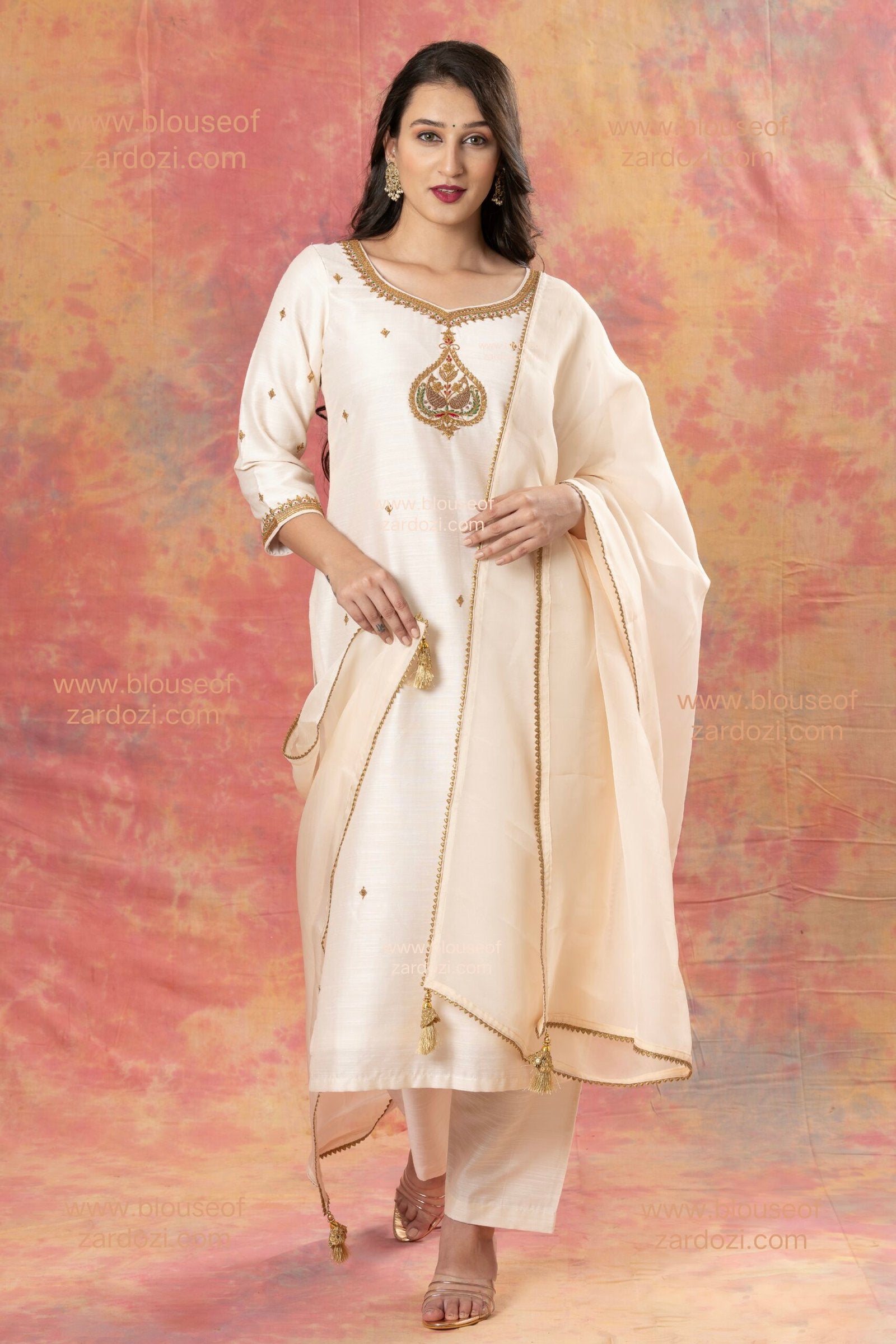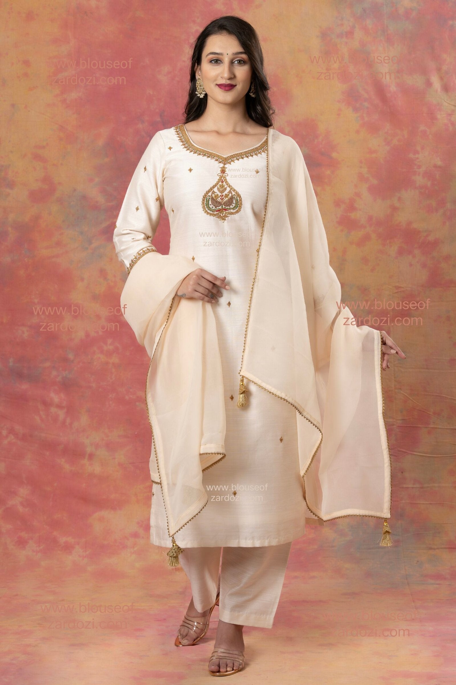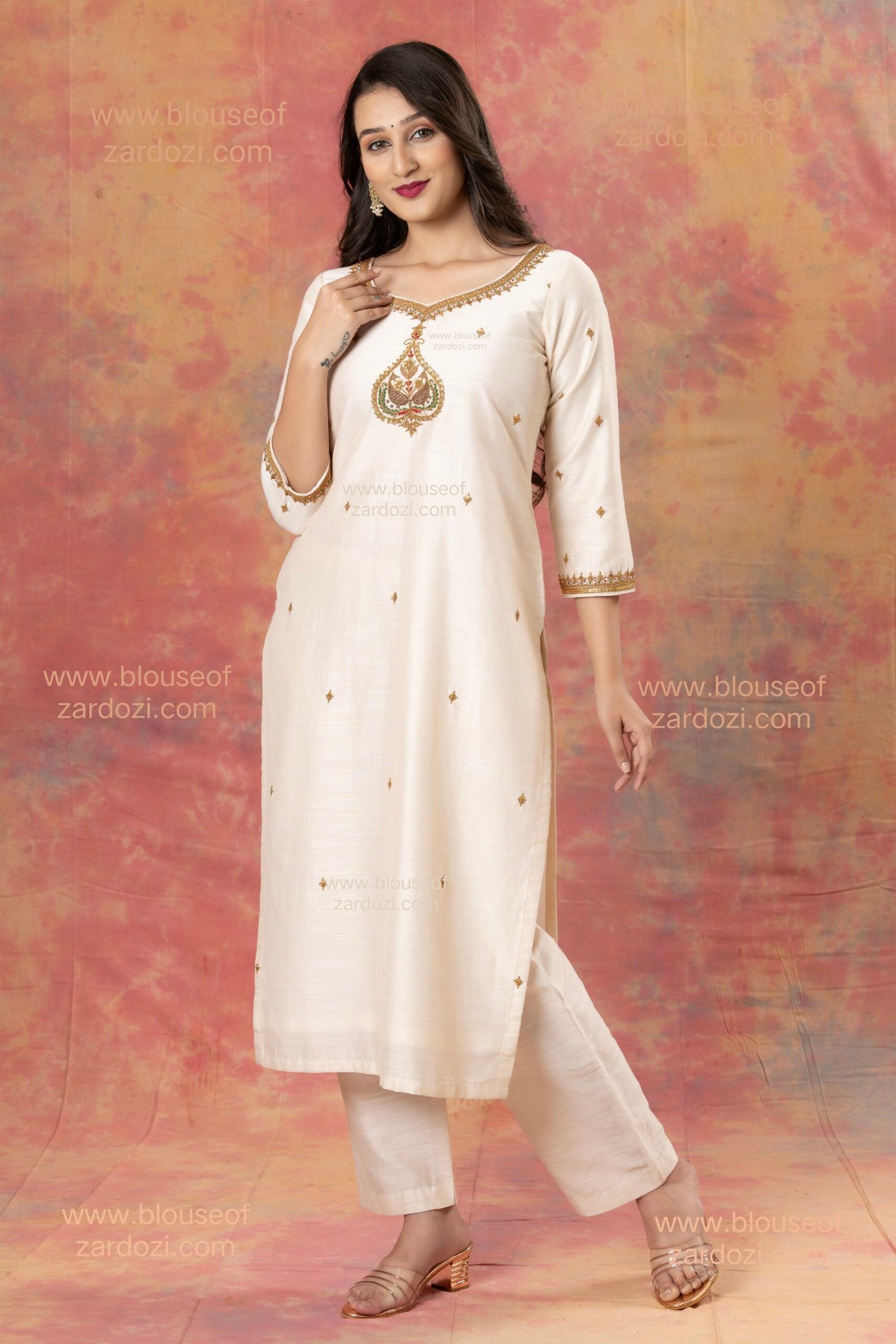 Exude elegance with this Cream Marodi Work Designer Kurta Set. Crafted from luxurious fabric, it features intricate Marodi embroidery, adding a touch of regal charm. The soft cream hue enhances its sophistication, making it perfect for weddings, festive occasions, and celebrations. A timeless blend of tradition and contemporary grace.