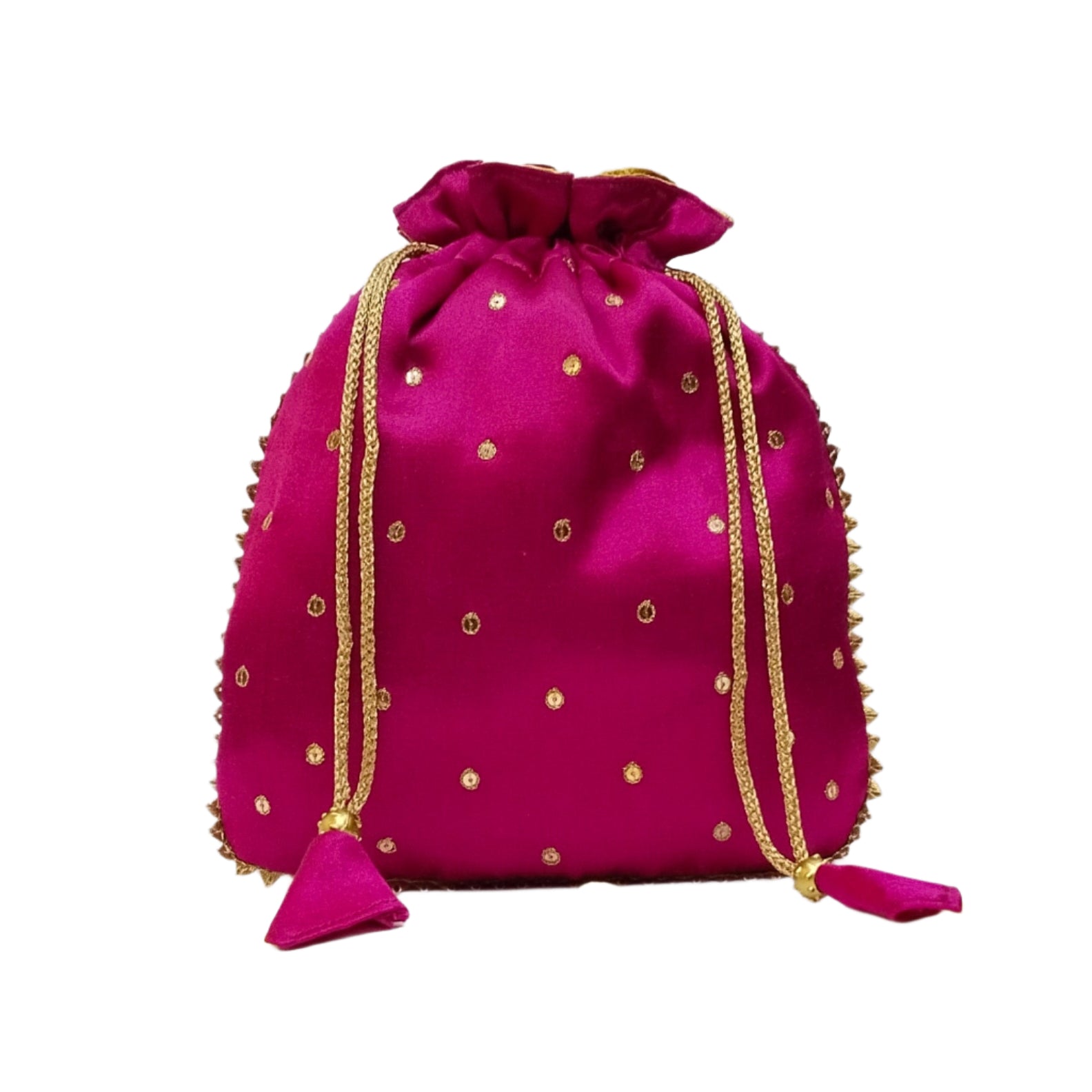 This exquisite Zardozi work designer potli purse is inspired by the elegance of a peacock, featuring intricate golden and silver thread embroidery, shimmering sequins, and delicate beadwork. The rich velvet/silk base enhances its royal charm, making it a perfect accessory for weddings and festive occasions, exuding timeless grace and opulence.