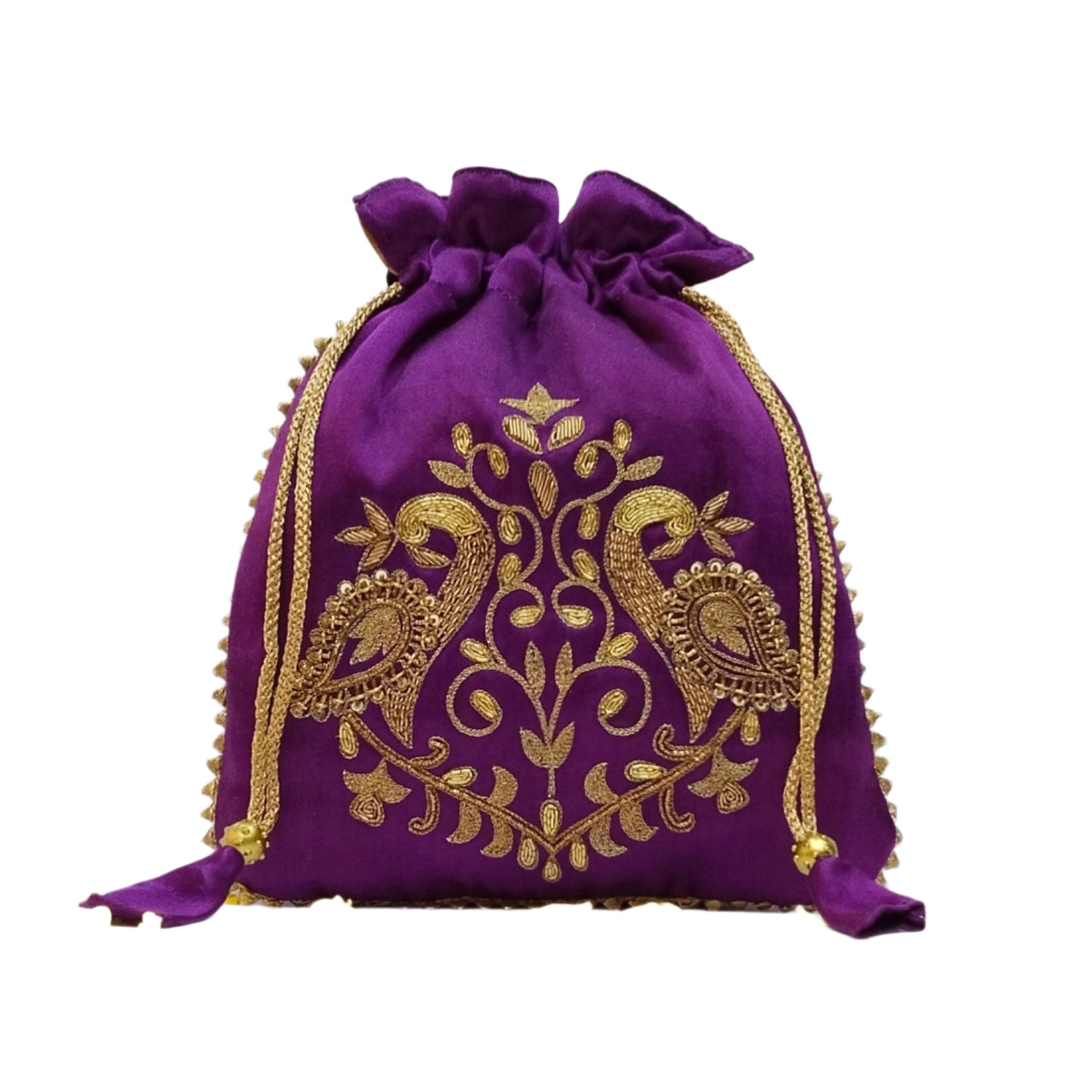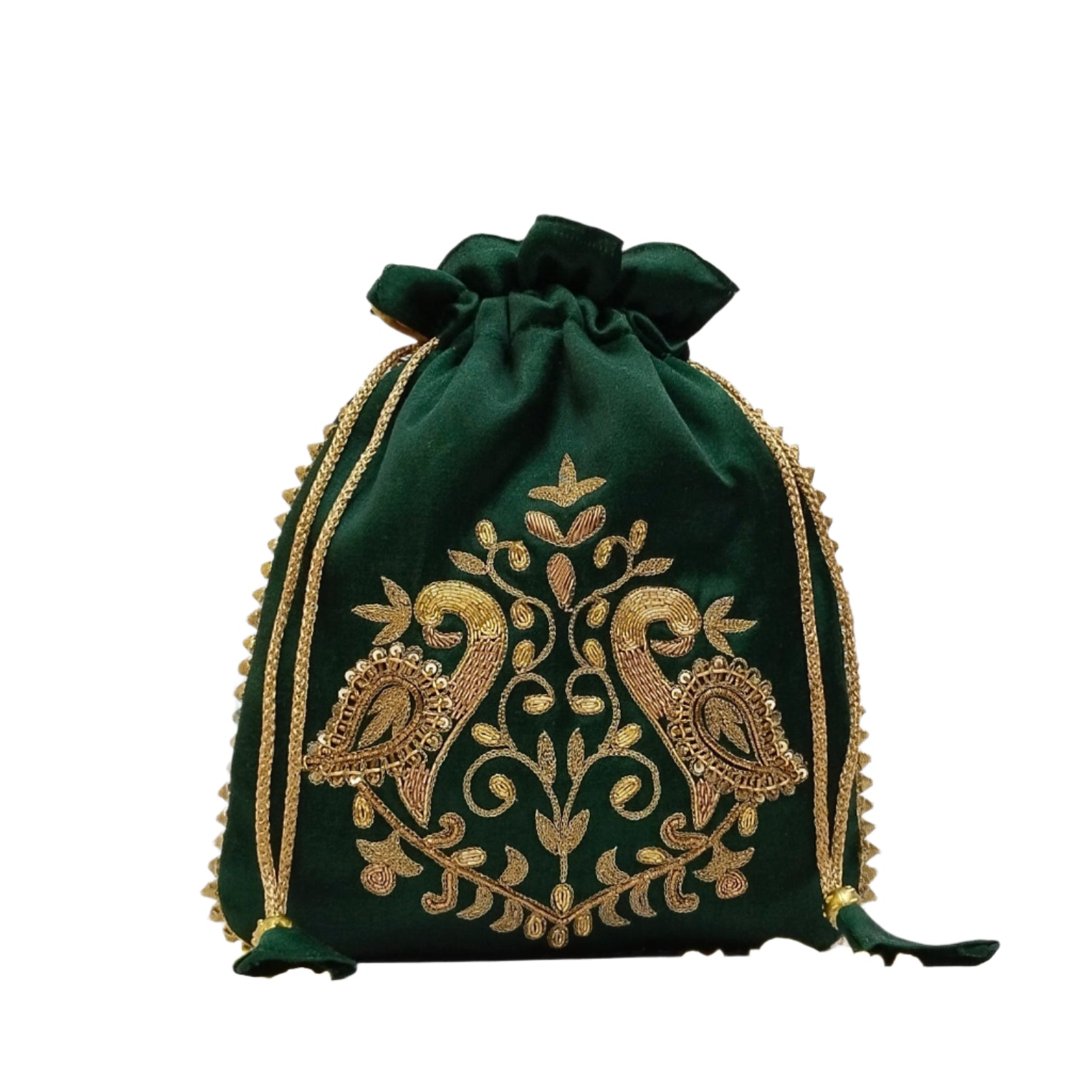 This exquisite Zardozi work designer potli purse is inspired by the elegance of a peacock, featuring intricate golden and silver thread embroidery, shimmering sequins, and delicate beadwork. The rich velvet/silk base enhances its royal charm, making it a perfect accessory for weddings and festive occasions, exuding timeless grace and opulence.