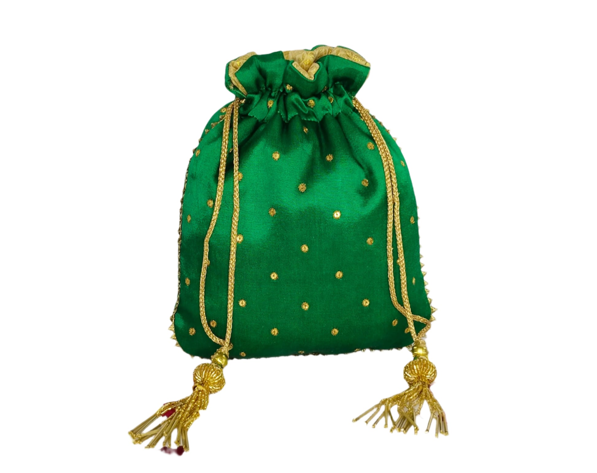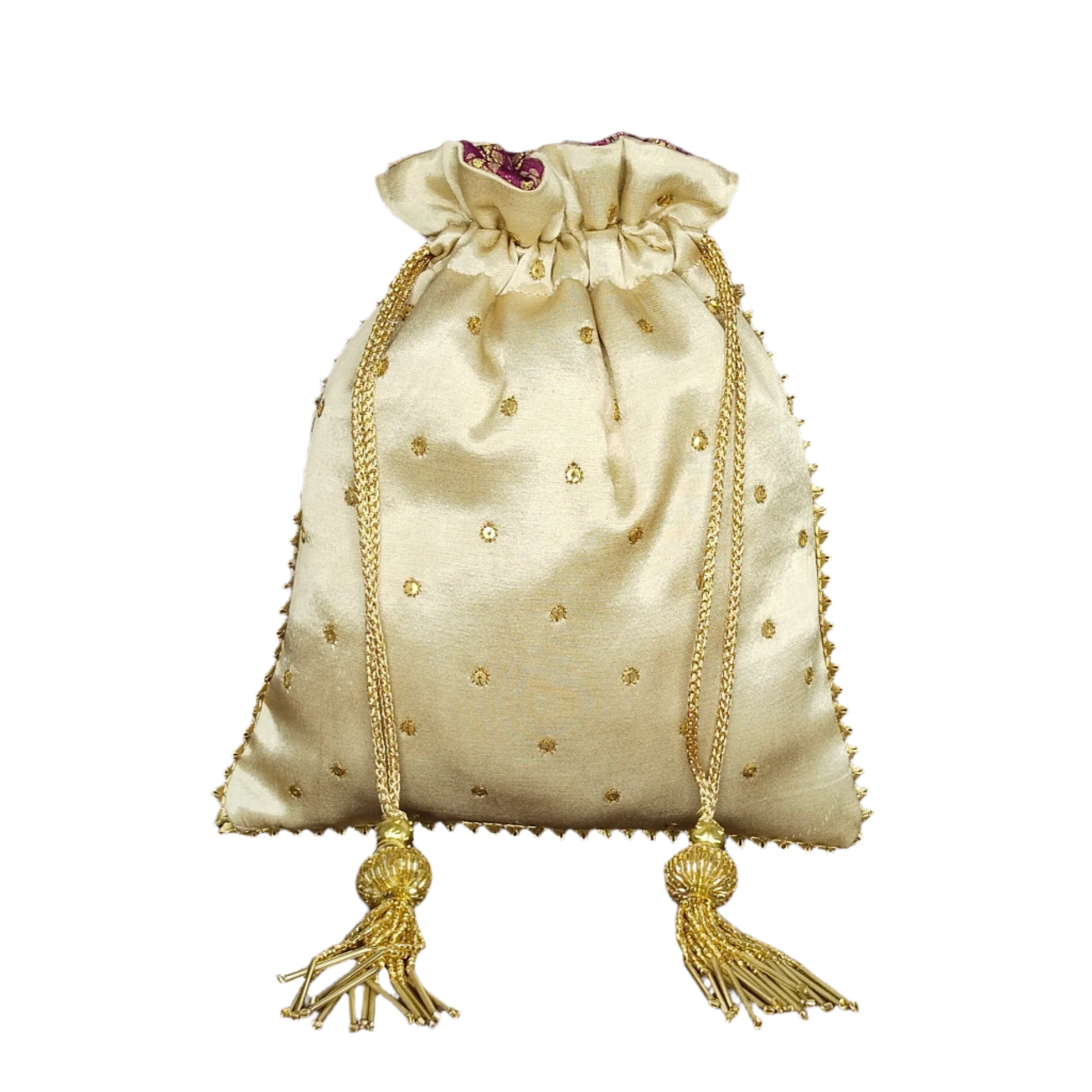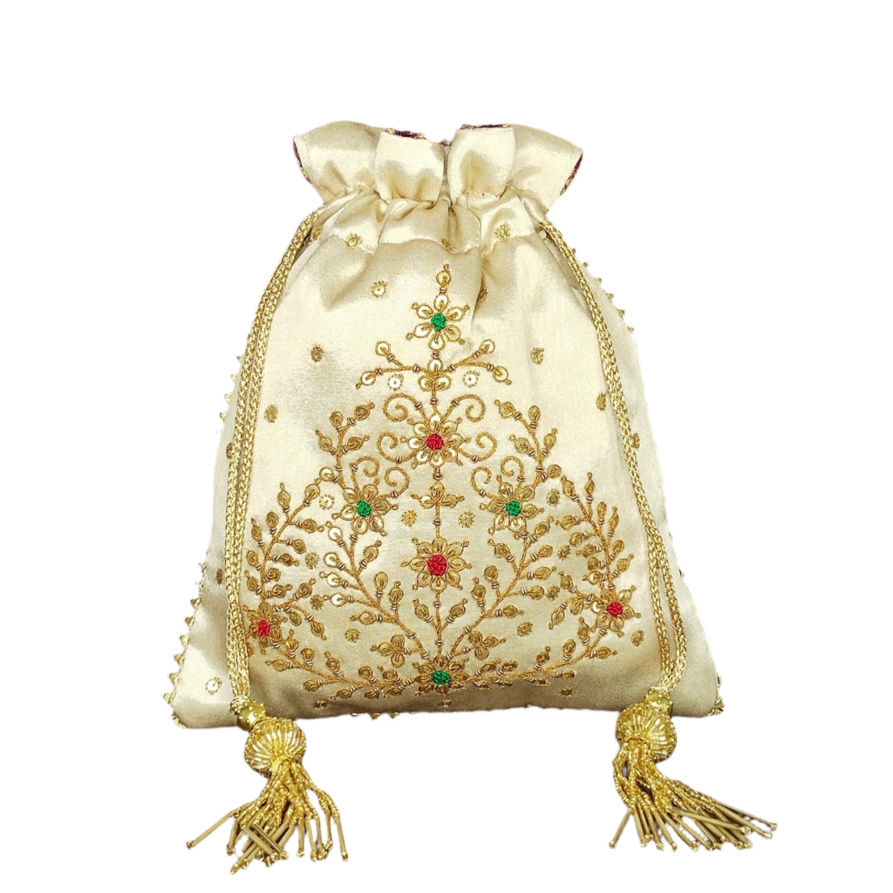A beautiful beads work potli batwa, intricately hand-embroidered using fine metallic threads in traditional Zardozi style. Crafted from luxurious semi-raw silk, it radiates royal elegance. Perfect for queens at heart, its freehand design and detailed motifs make it an ideal statement piece for weddings, festivities, or grand celebrations.