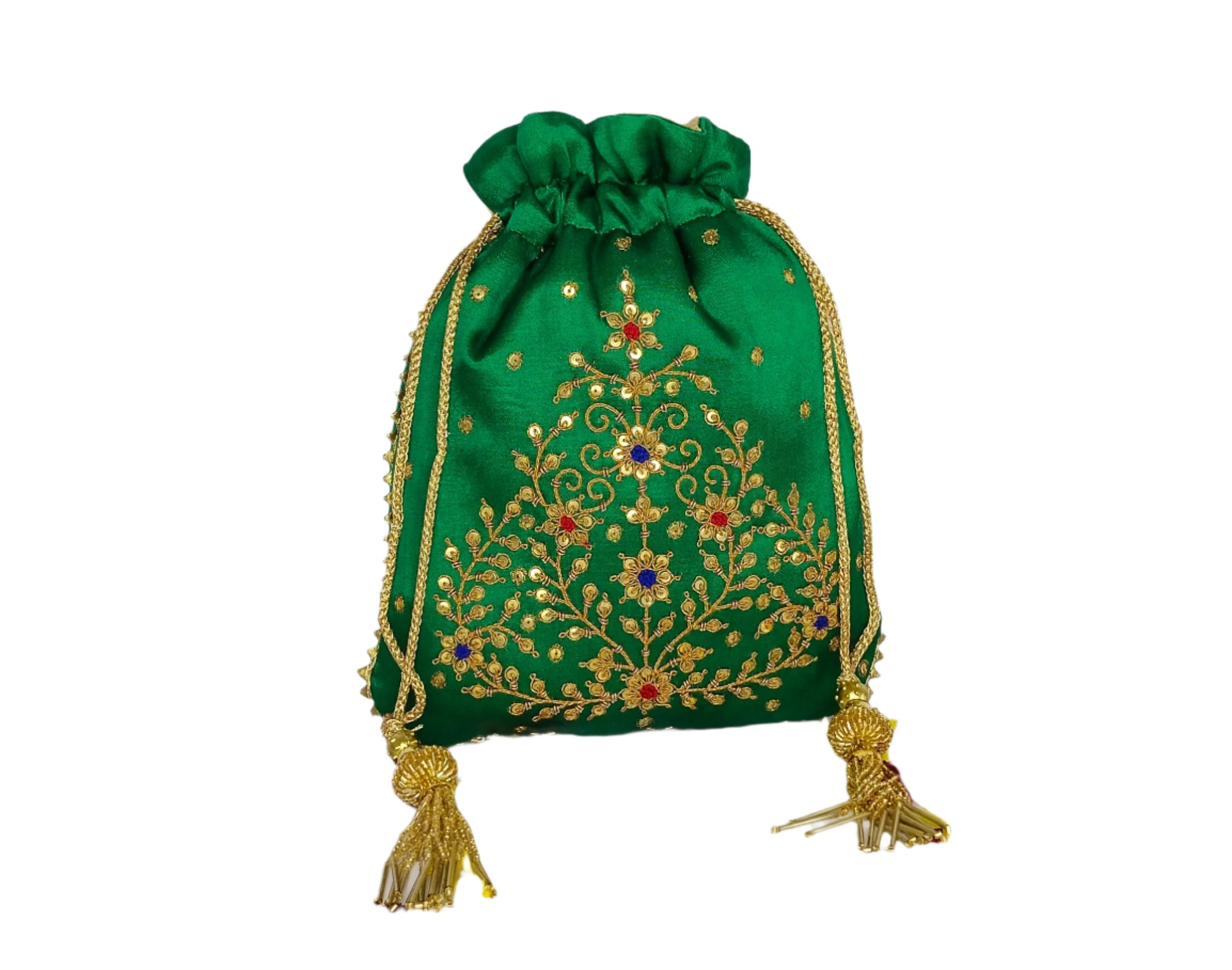 A beautiful beads work potli batwa, intricately hand-embroidered using fine metallic threads in traditional Zardozi style. Crafted from luxurious semi-raw silk, it radiates royal elegance. Perfect for queens at heart, its freehand design and detailed motifs make it an ideal statement piece for weddings, festivities, or grand celebrations.