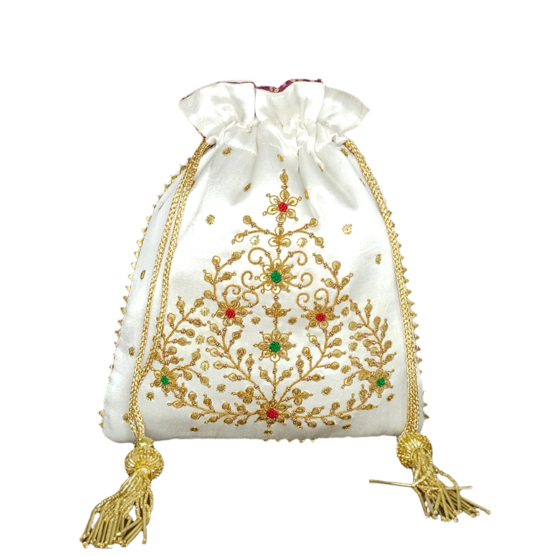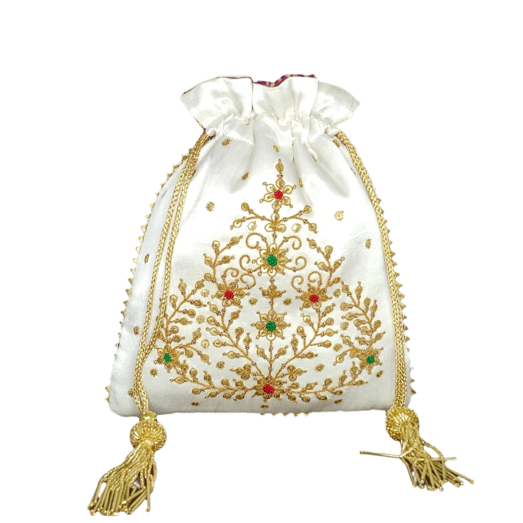 A beautiful beads work potli batwa, intricately hand-embroidered using fine metallic threads in traditional Zardozi style. Crafted from luxurious semi-raw silk, it radiates royal elegance. Perfect for queens at heart, its freehand design and detailed motifs make it an ideal statement piece for weddings, festivities, or grand celebrations.