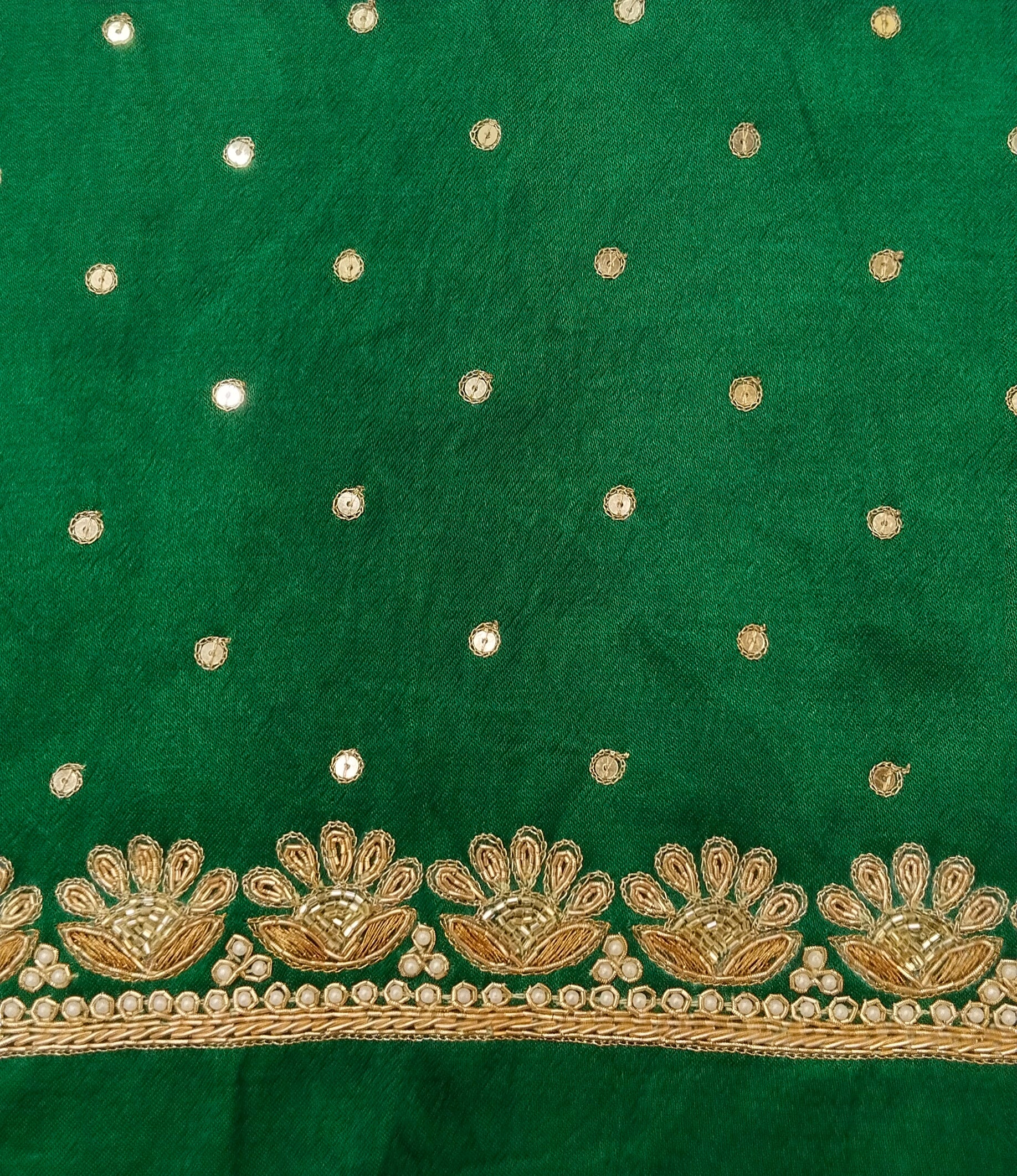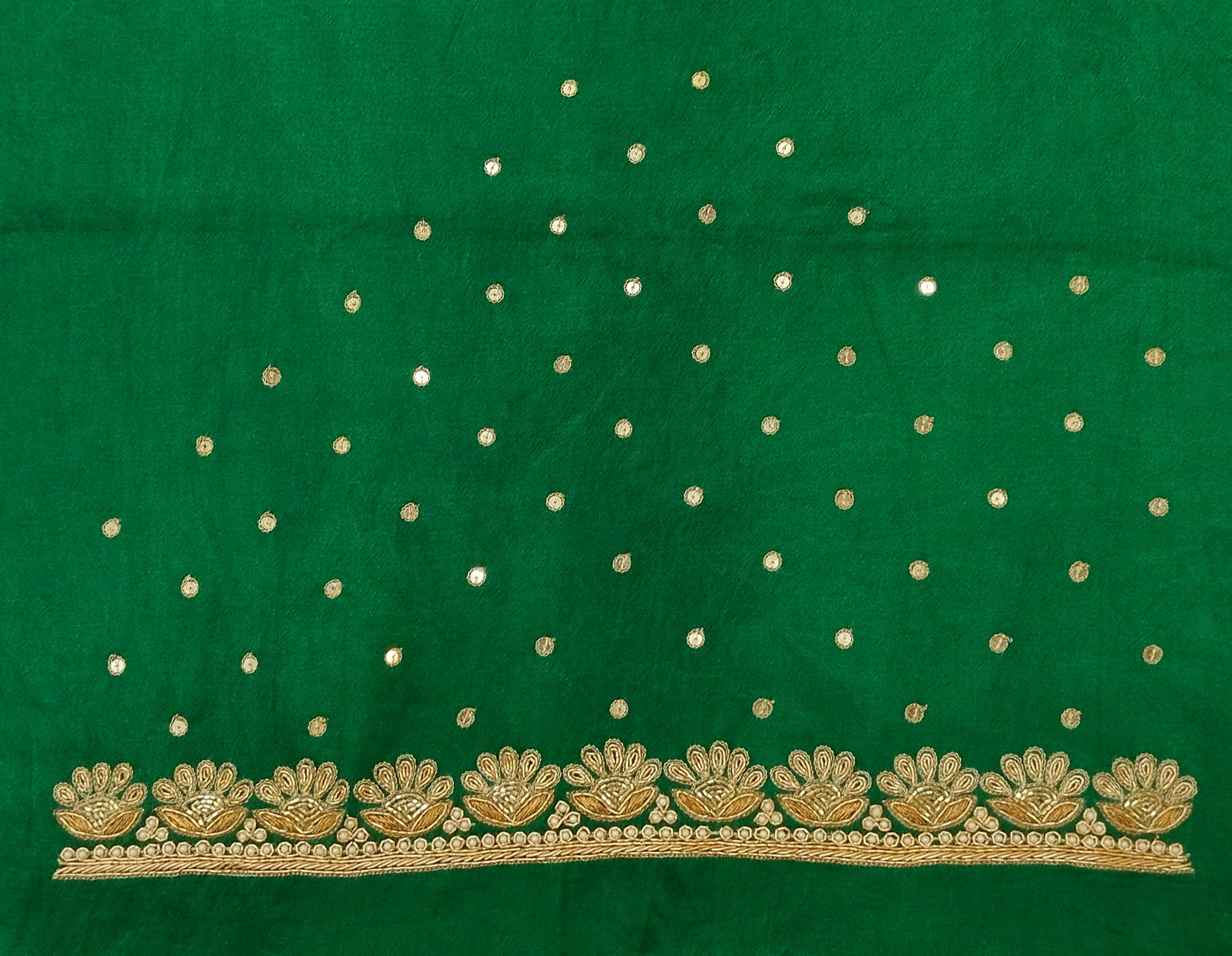 This unstitched blouse piece showcases elegant floral embroidery arranged along the neckline and border, offering a blend of tradition and modern flair. Crafted from rich Gaji silk, the fabric provides a lustrous finish and graceful drape. Perfect for pairing with sarees or lehengas, it brings effortless charm to festive and special occasions.