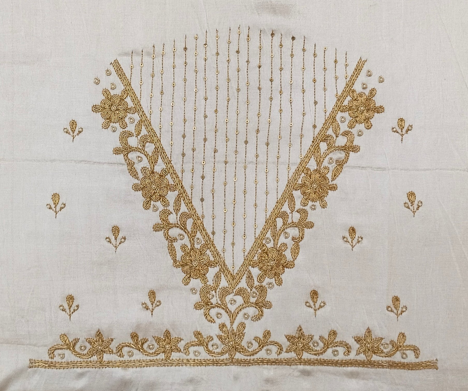 "Elevate your ethnic wardrobe with this luxurious unstitched blouse piece crafted from premium Gaji silk. Adorned with intricate hand-done Zardozi embroidery, it blends traditional artistry with timeless elegance. Perfect for festive and wedding wear, this rich fabric lets you customize your blouse to reflect your unique style and grace."
