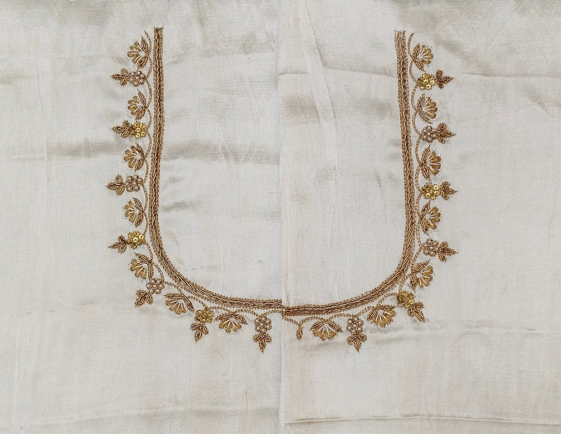 Celebrate tradition with this finely embroidered unstitched blouse piece, designed to make a statement. Crafted from luxurious Gaji silk, it features detailed golden thread embroidery with majestic elephant motifs on the sleeves, complemented by delicate floral designs along the neckline and edges. Perfect for festive occasions, weddings, or traditional functions, it pairs beautifully with sarees and lehengas to create a timeless ethnic look.