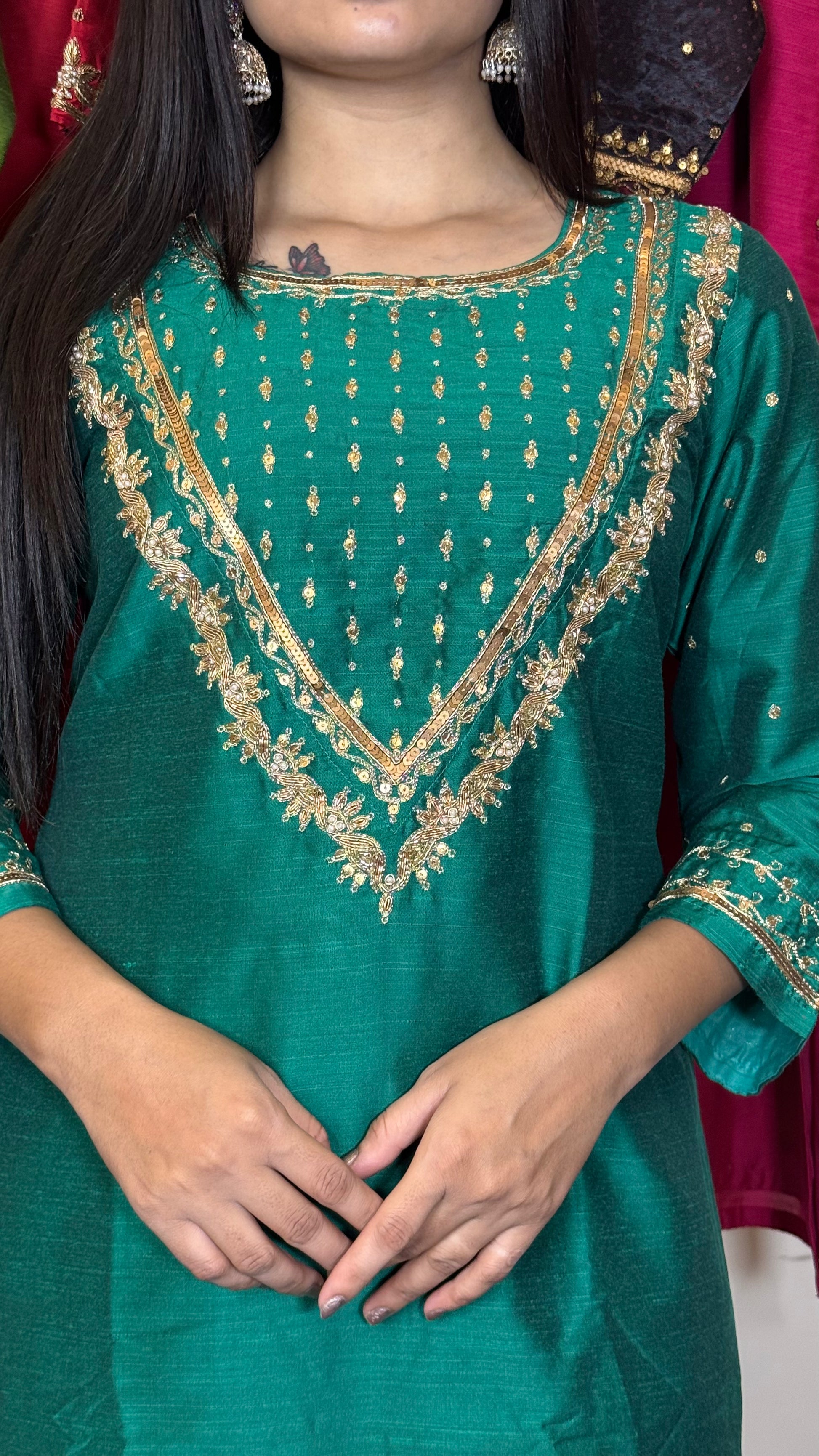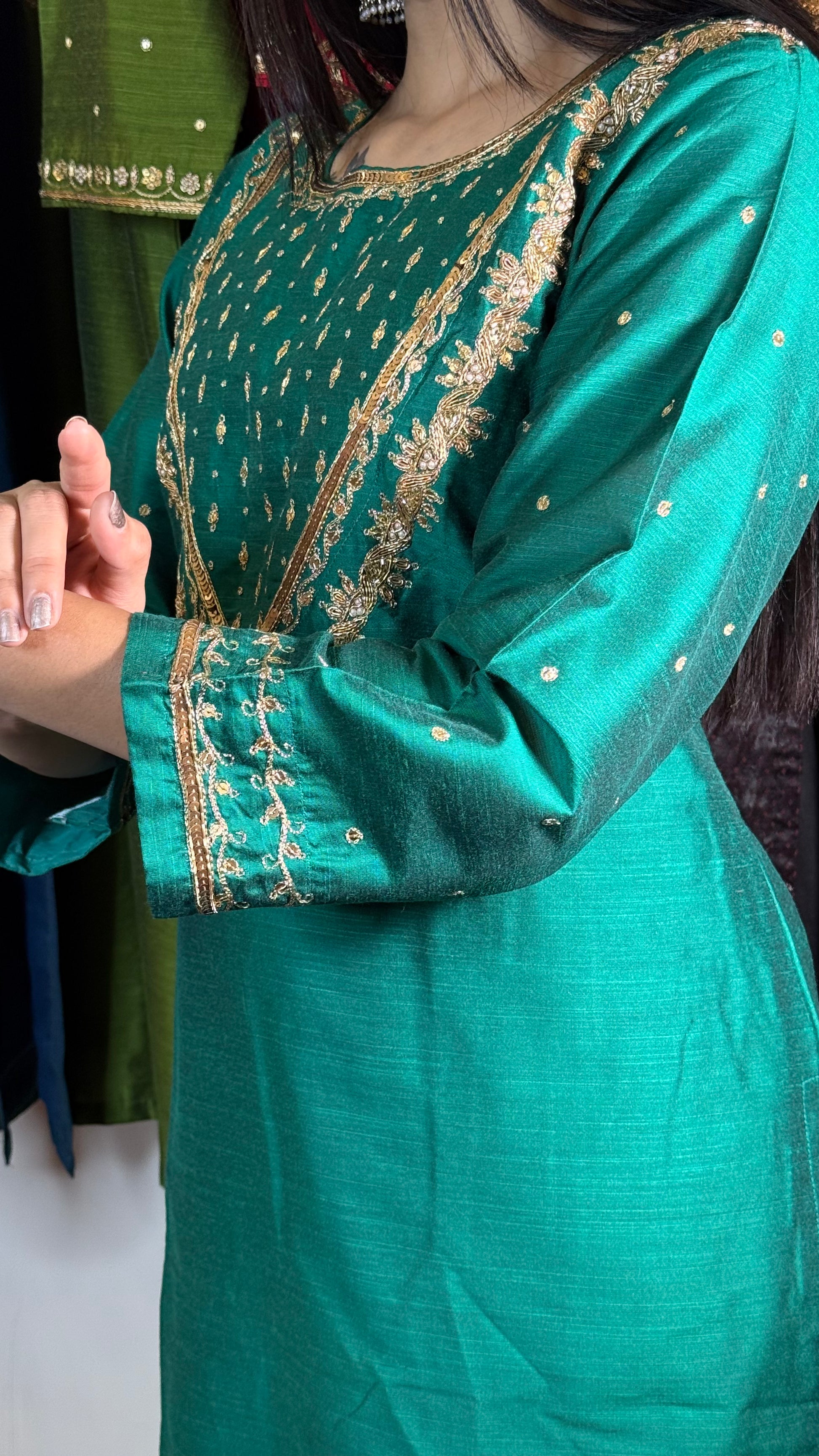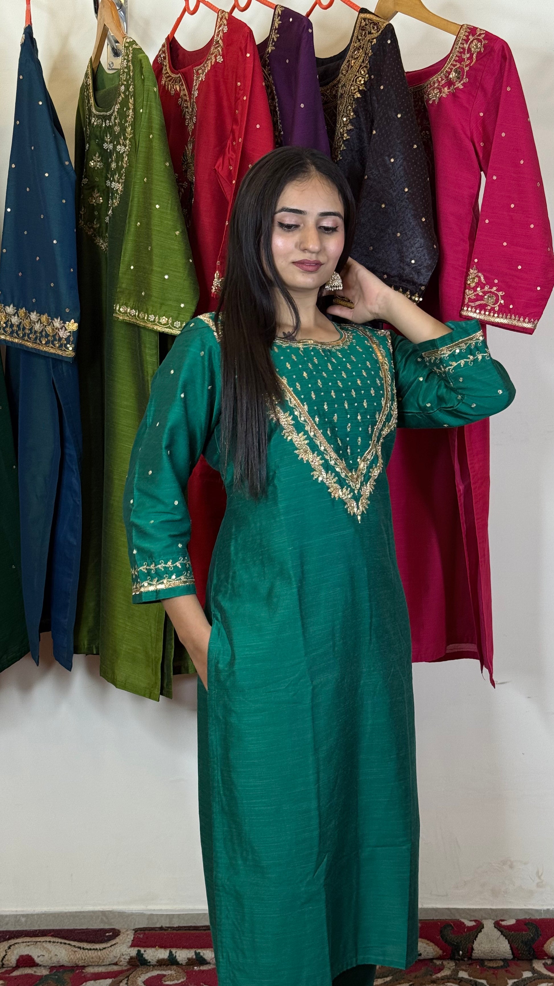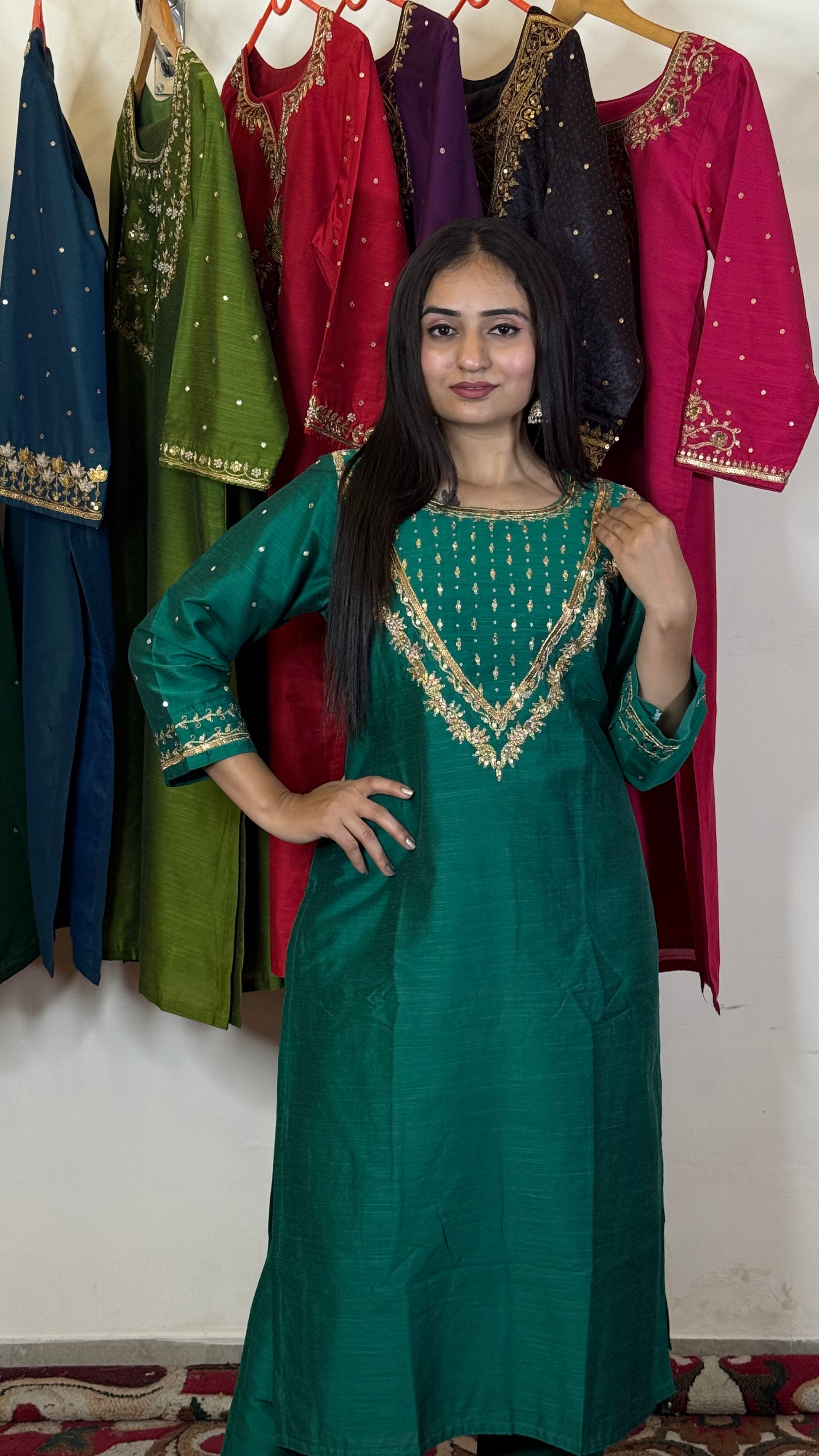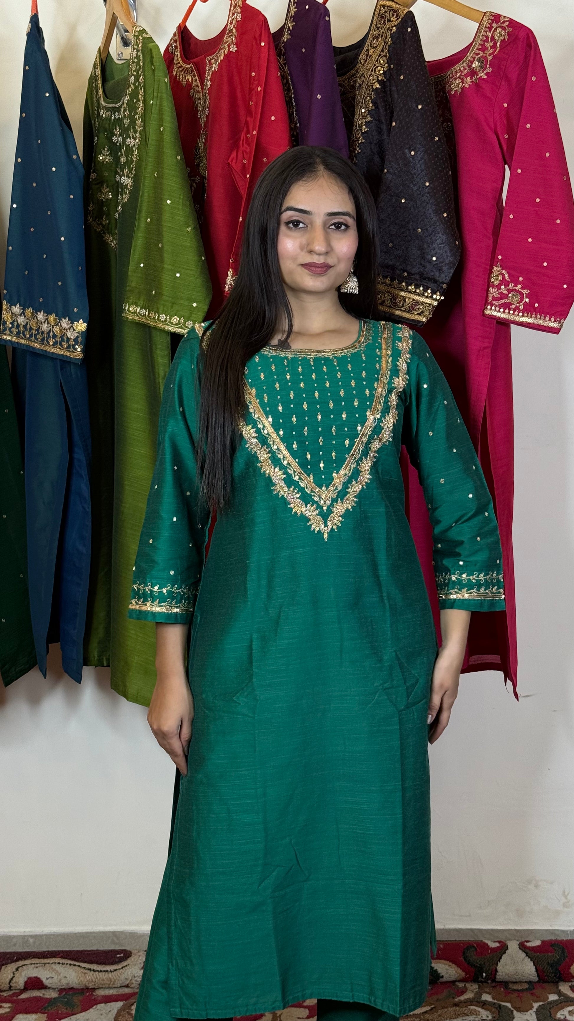 Refined and radiant, the Hiba Royale Kurta Set is a modern tribute to regal elegance. Crafted from premium Gaji silk, it features intricate embroidery that adds depth and richness to the silhouette. Ideal for festive celebrations or elegant evenings, this ensemble seamlessly blends heritage craftsmanship with contemporary flair.