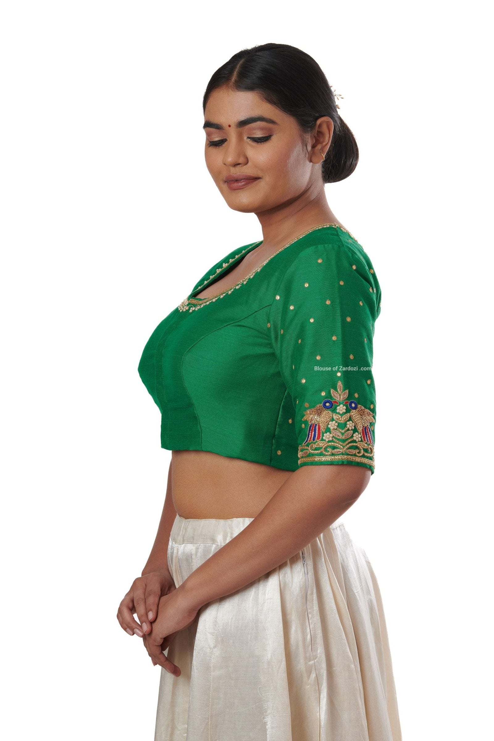 Embrace the majestic allure of the Imperial Monarchy Peacock Blouse, fit for a queen. The intricate Zardozi work depicting peacock motifs adds an elegant touch to the blouse, exuding regal charm. Crafted from premium semi raw silk, the blouse offers a luxurious and comfortable fit, perfect for formal occasions or special events. Let the peacock-inspired design take flight and make a statement.