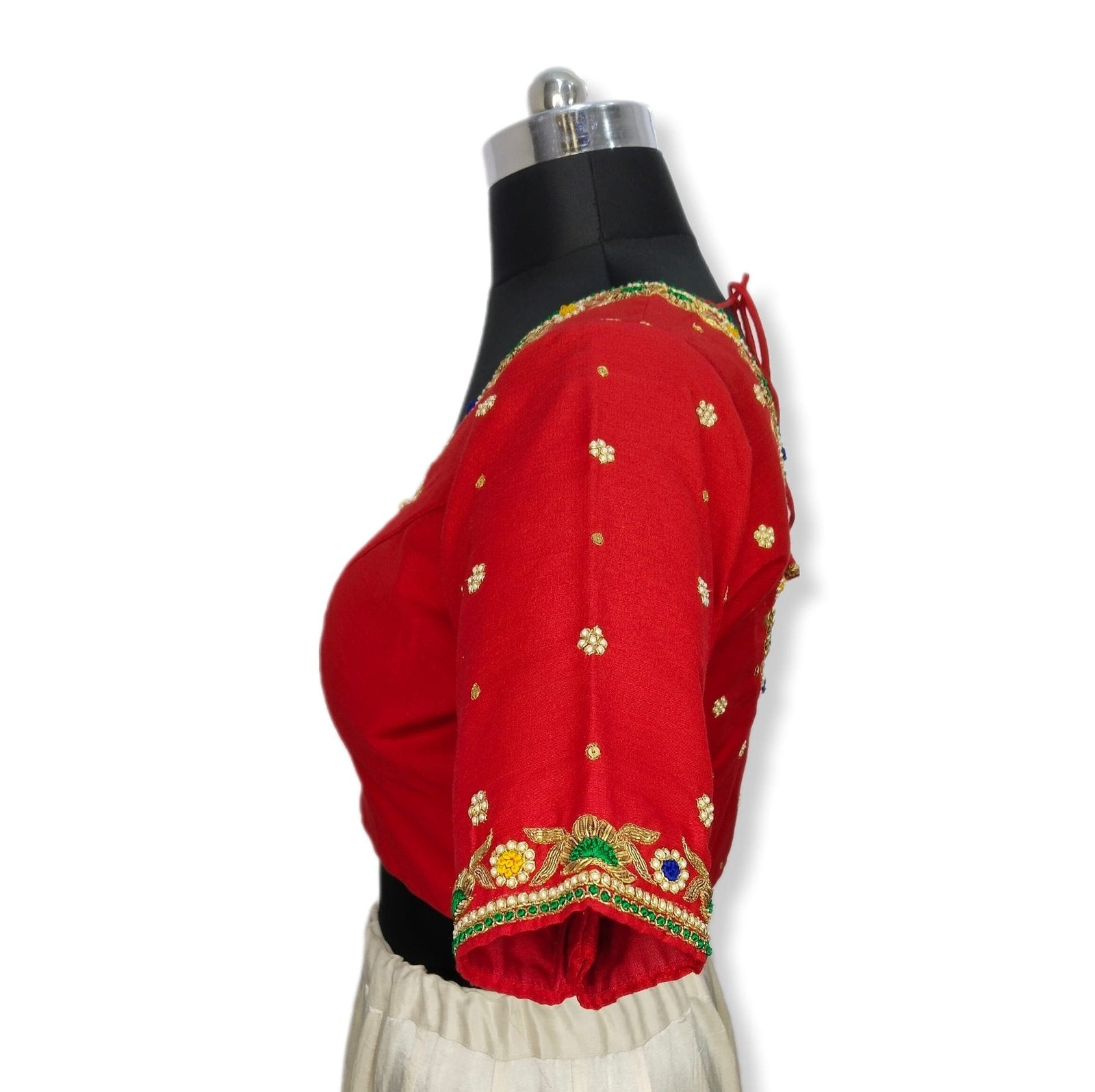 Add timeless elegance to your wardrobe with this Floral Zardozi Handcrafted Designer Blouse. Featuring intricate floral zardozi embroidery on rich teal fabric, it’s perfect for festive occasions and weddings. The stylish deep back with tassel tie-up adds a modern touch to this traditional masterpiece, blending heritage with contemporary charm.