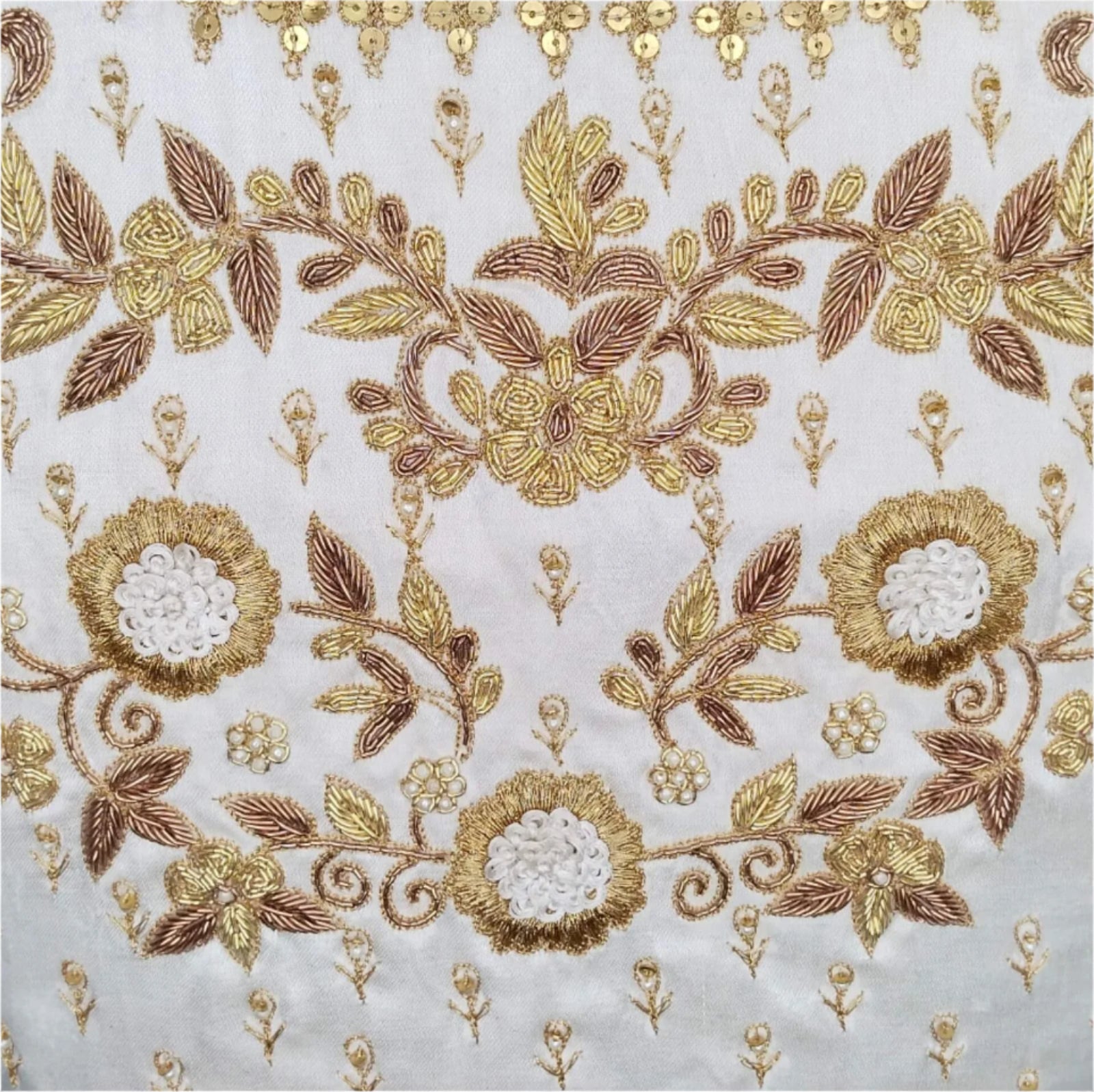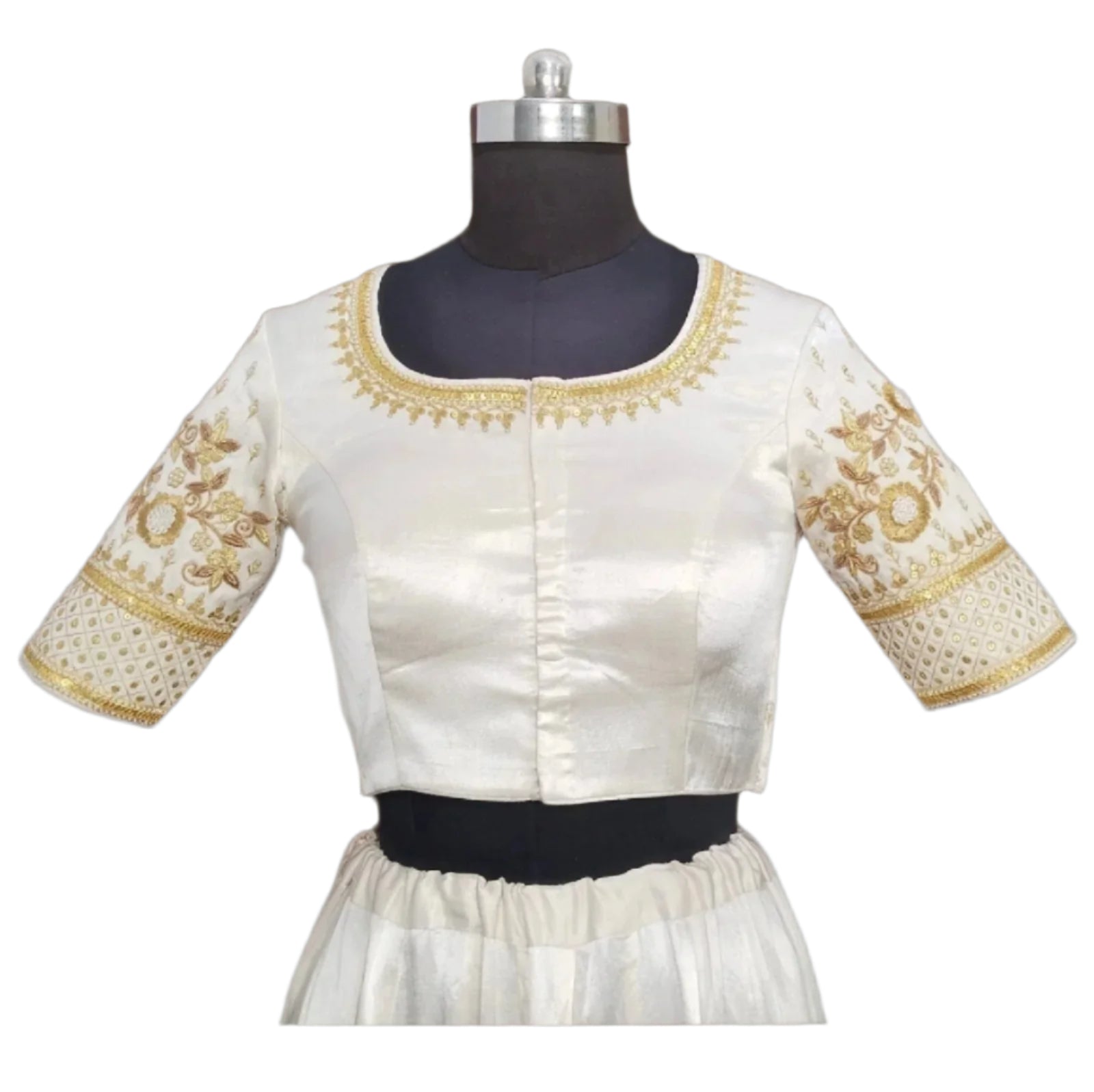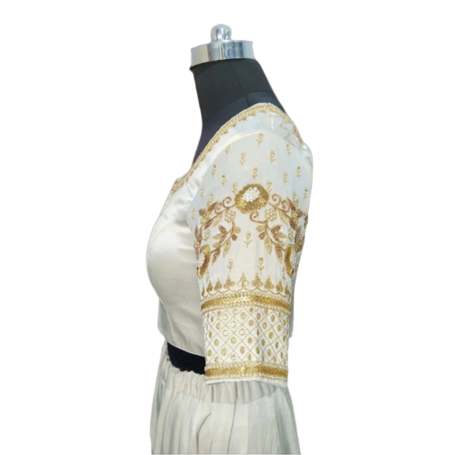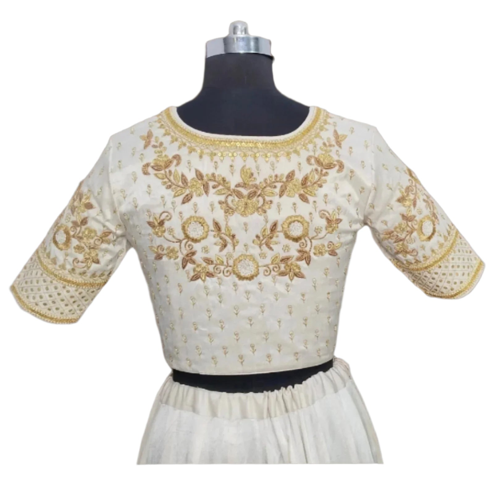 Elegant ivory blouse featuring intricate golden zari embroidery and floral motifs, perfect for festive and bridal wear. Crafted from high-quality fabric, it offers a luxurious feel and impeccable fit. The detailed sleeve and back design add a traditional charm, making it a stunning choice for lehengas or sarees.