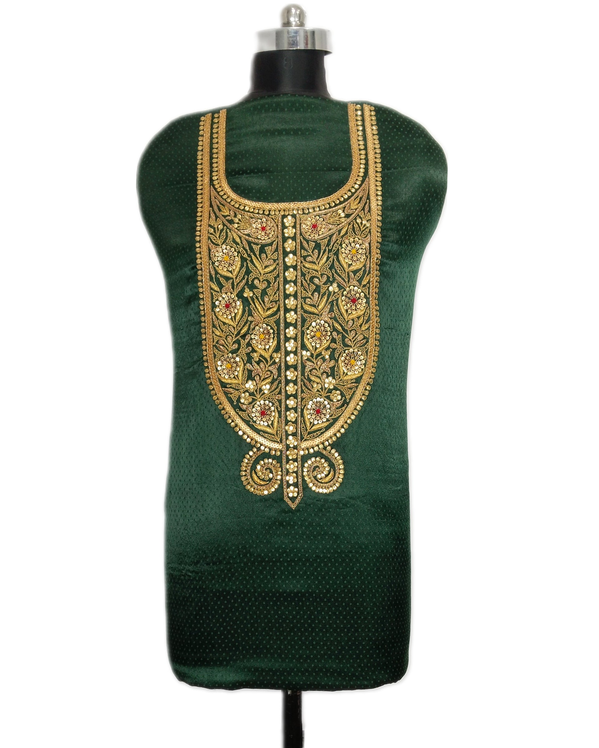 Elevate your ethnic style with this unstitched Gaji silk Aabha kurta, adorned with intricate Marodi and Noor Nakkashi work. Rich in tradition and elegance, it features detailed hand embroidery, perfect for festive occasions and celebrations. A luxurious choice for those who value heritage craftsmanship and timeless beauty.
