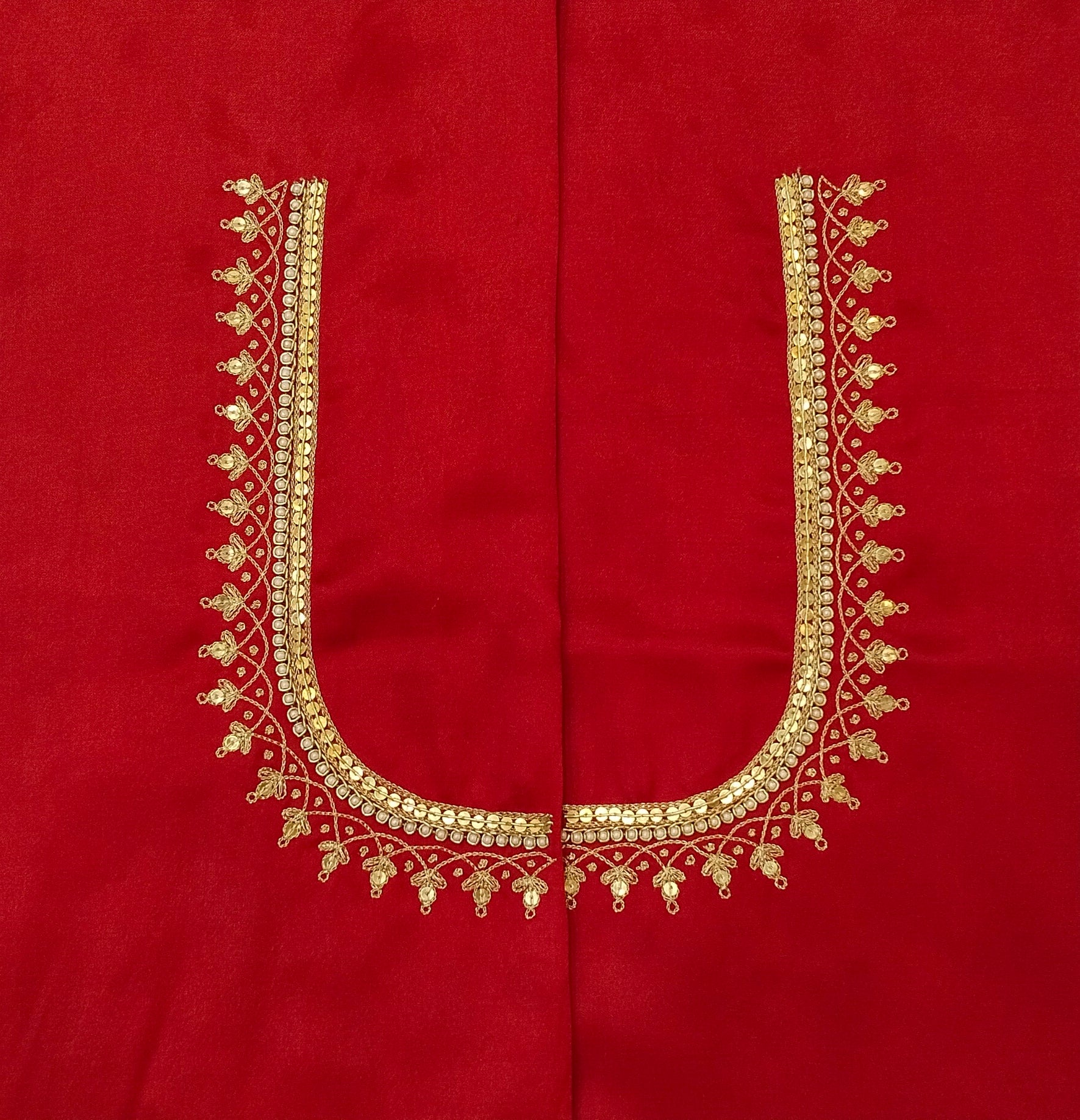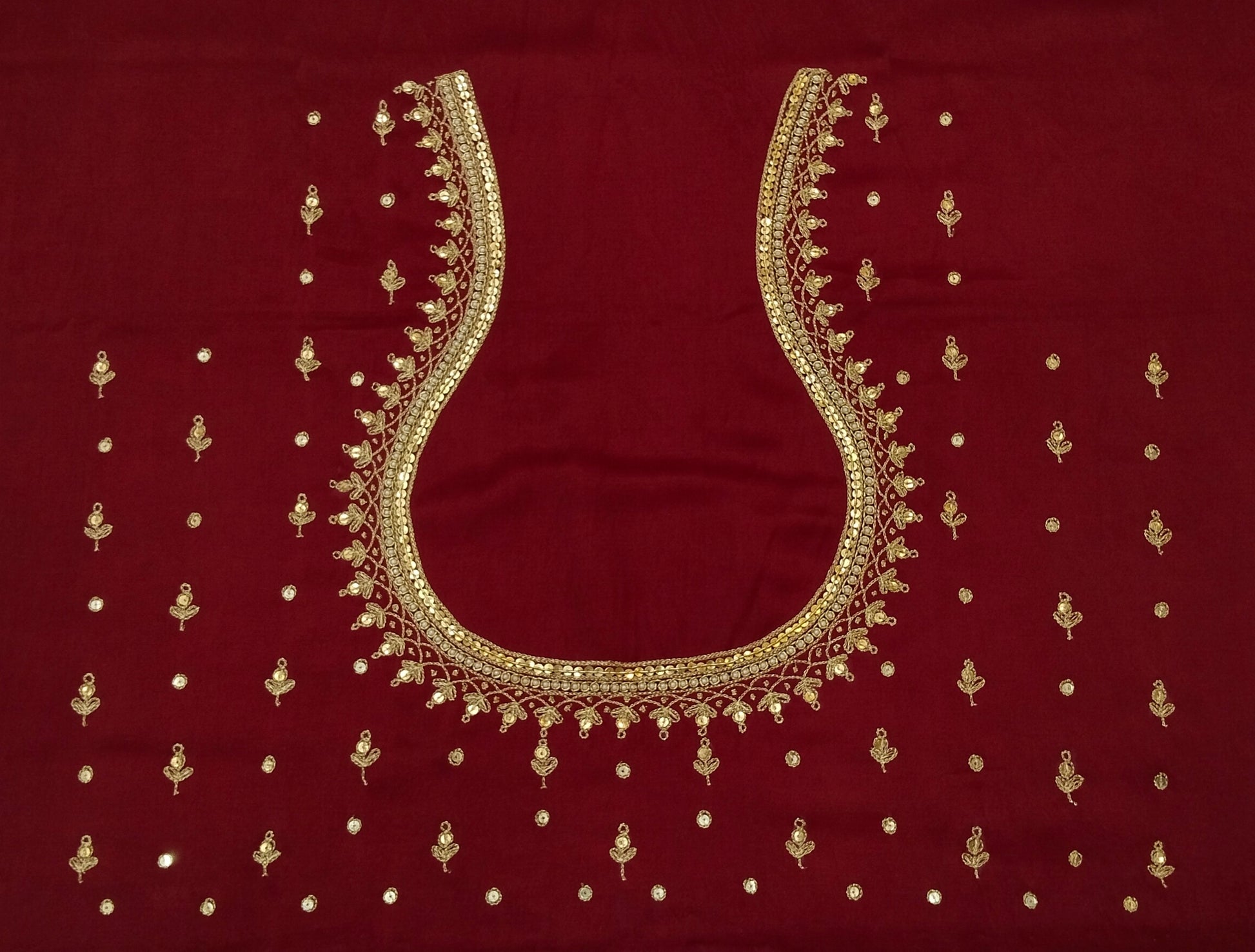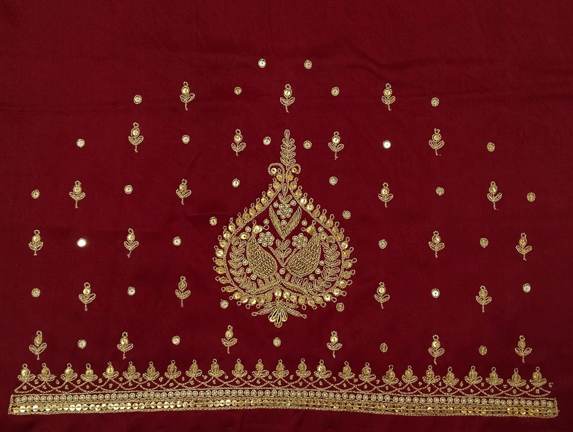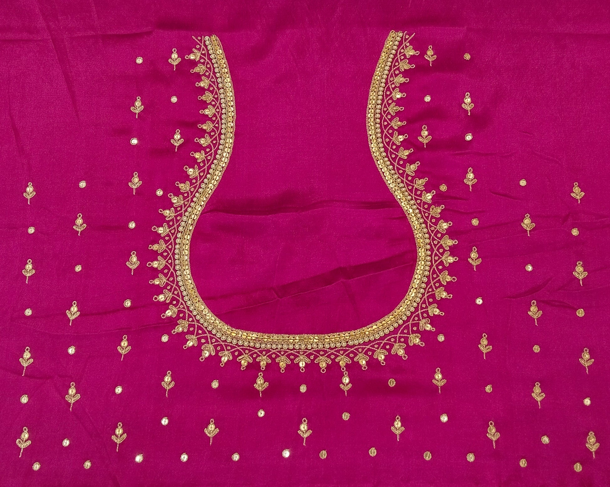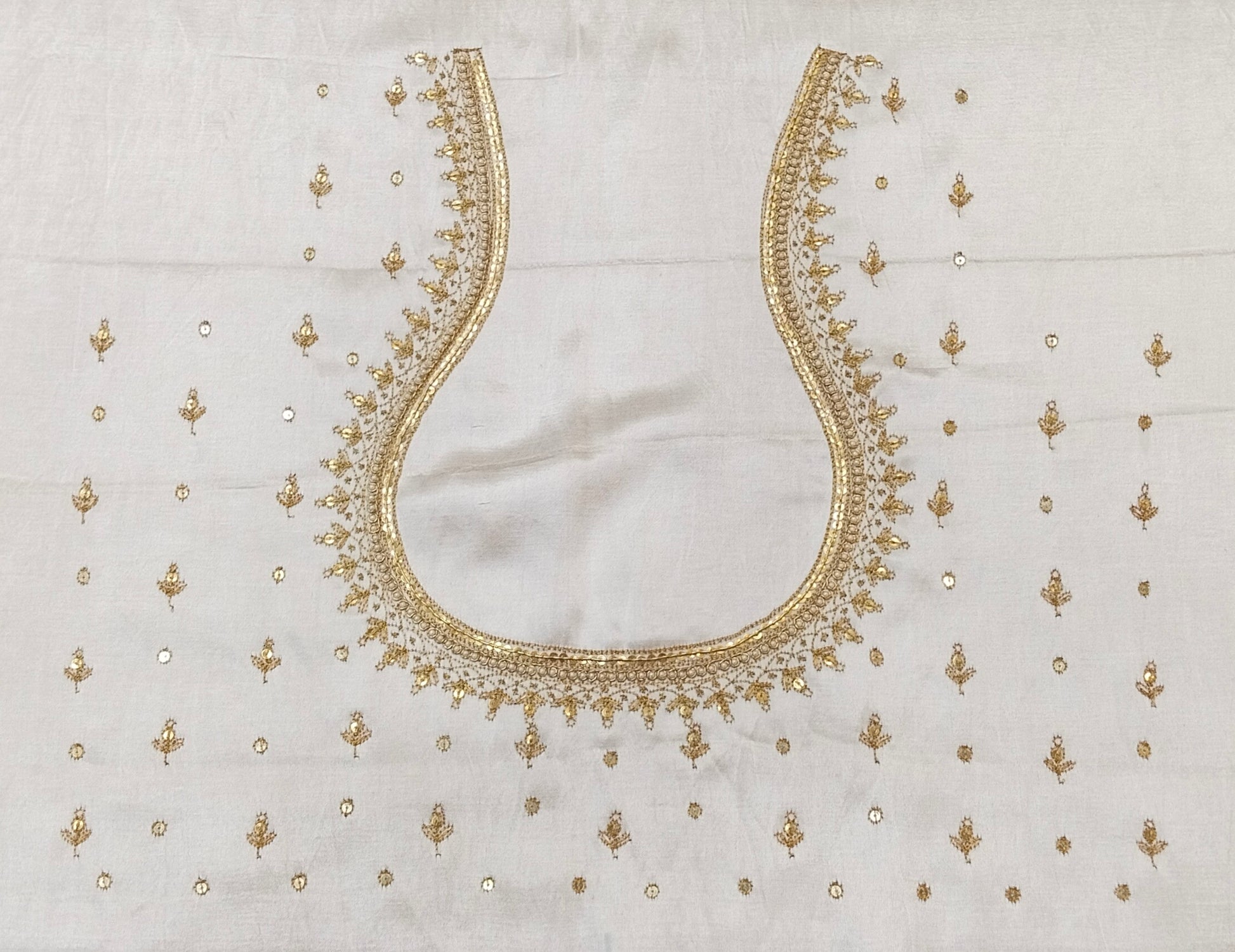 This unstitched blouse piece is crafted from premium Gaji silk, known for its rich texture and graceful drape. Adorned with timeless embroidery, the detailed sleeve and neckline patterns offer a touch of classic elegance. Perfect for festive and ethnic wear, its exquisite craftsmanship and refined design make it an ideal choice for traditional celebrations and special occasions.