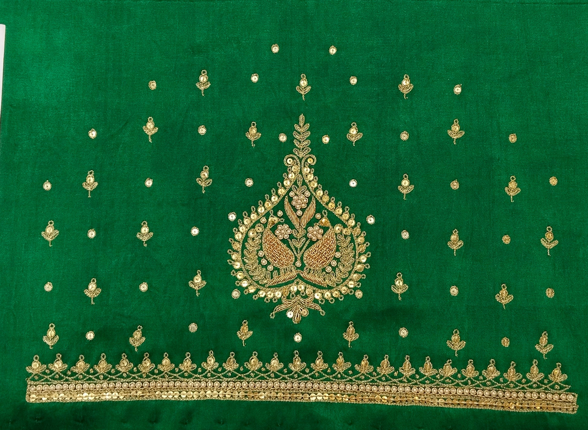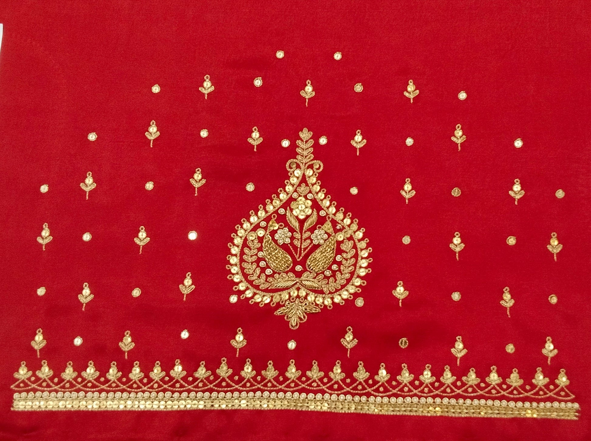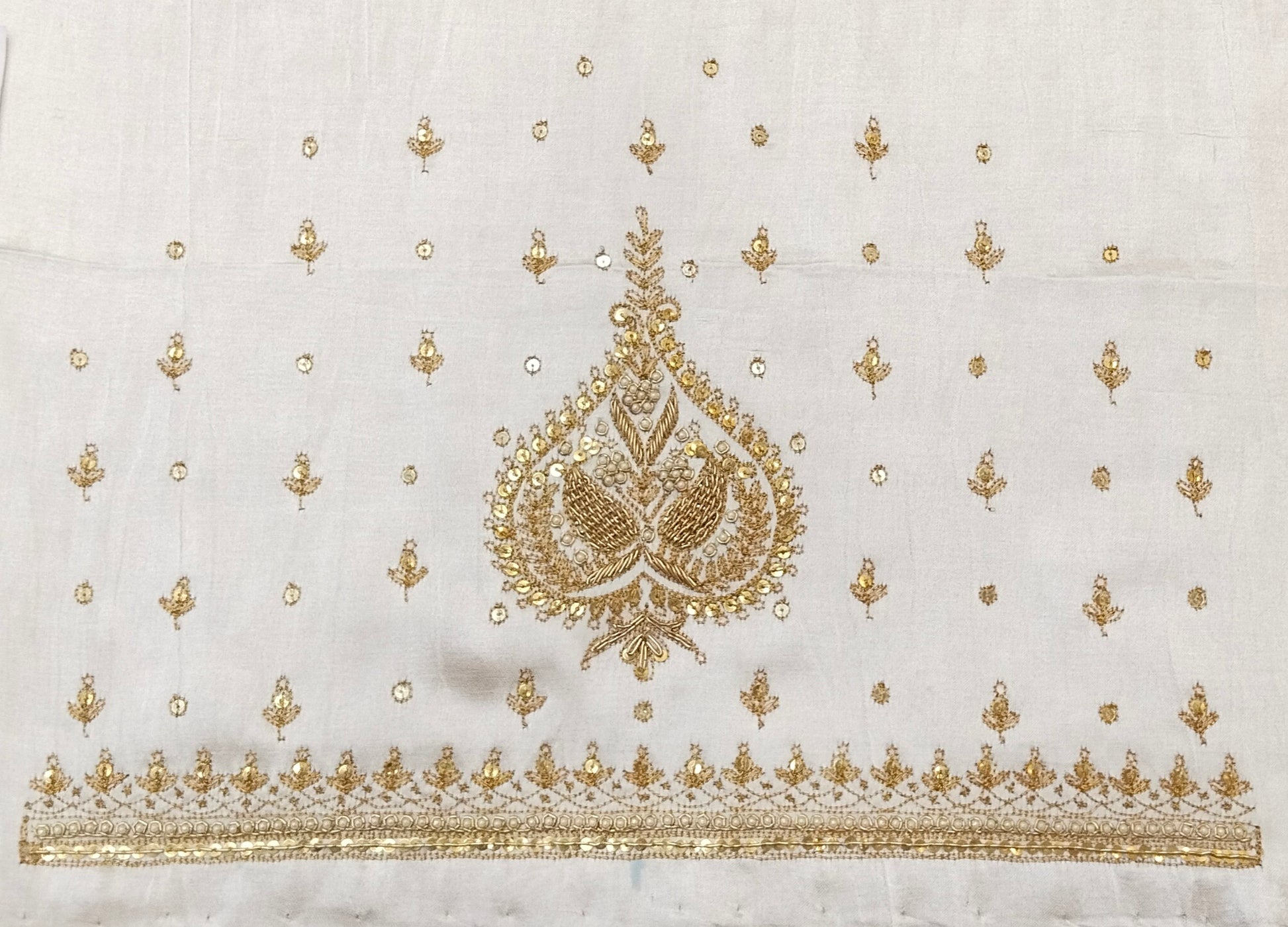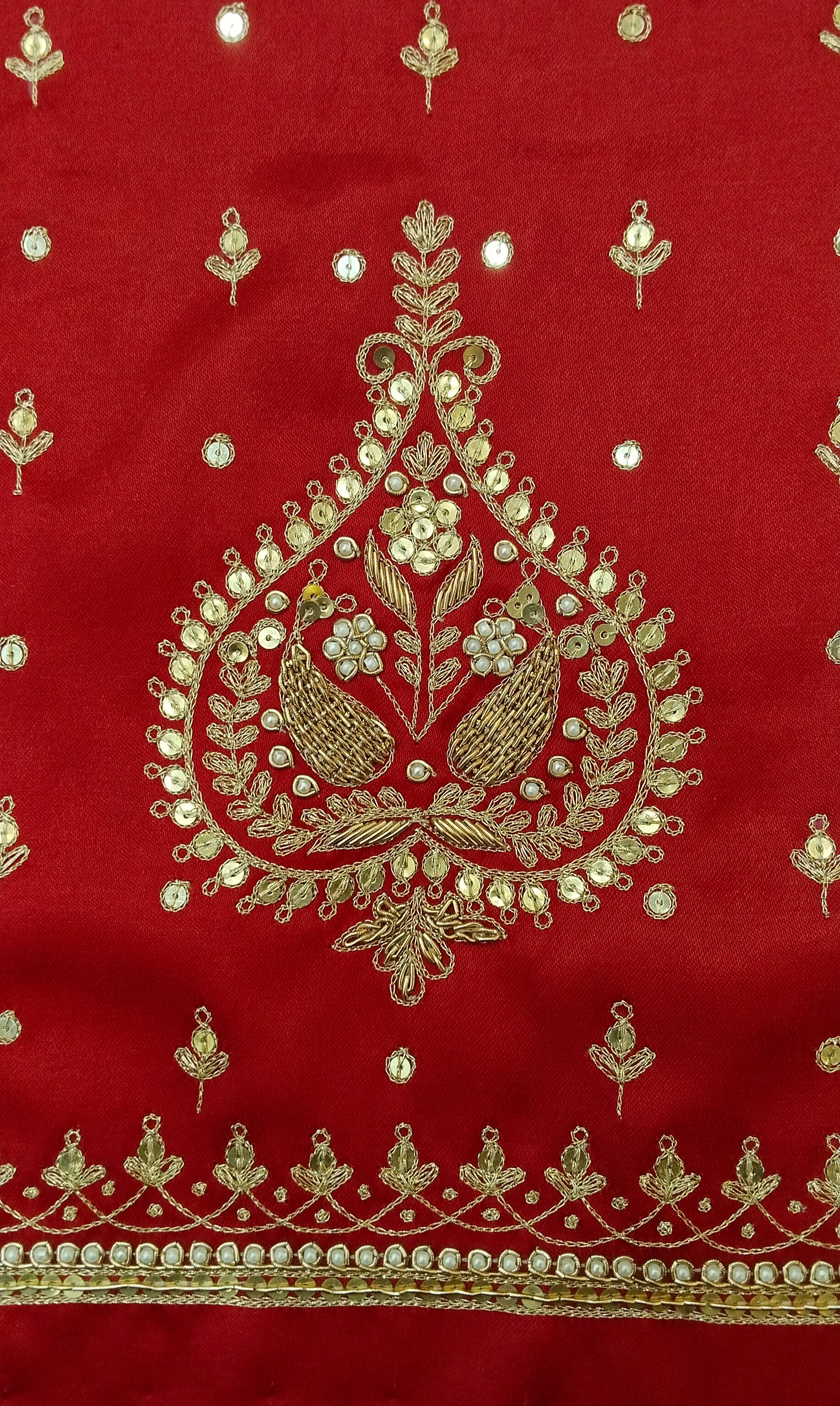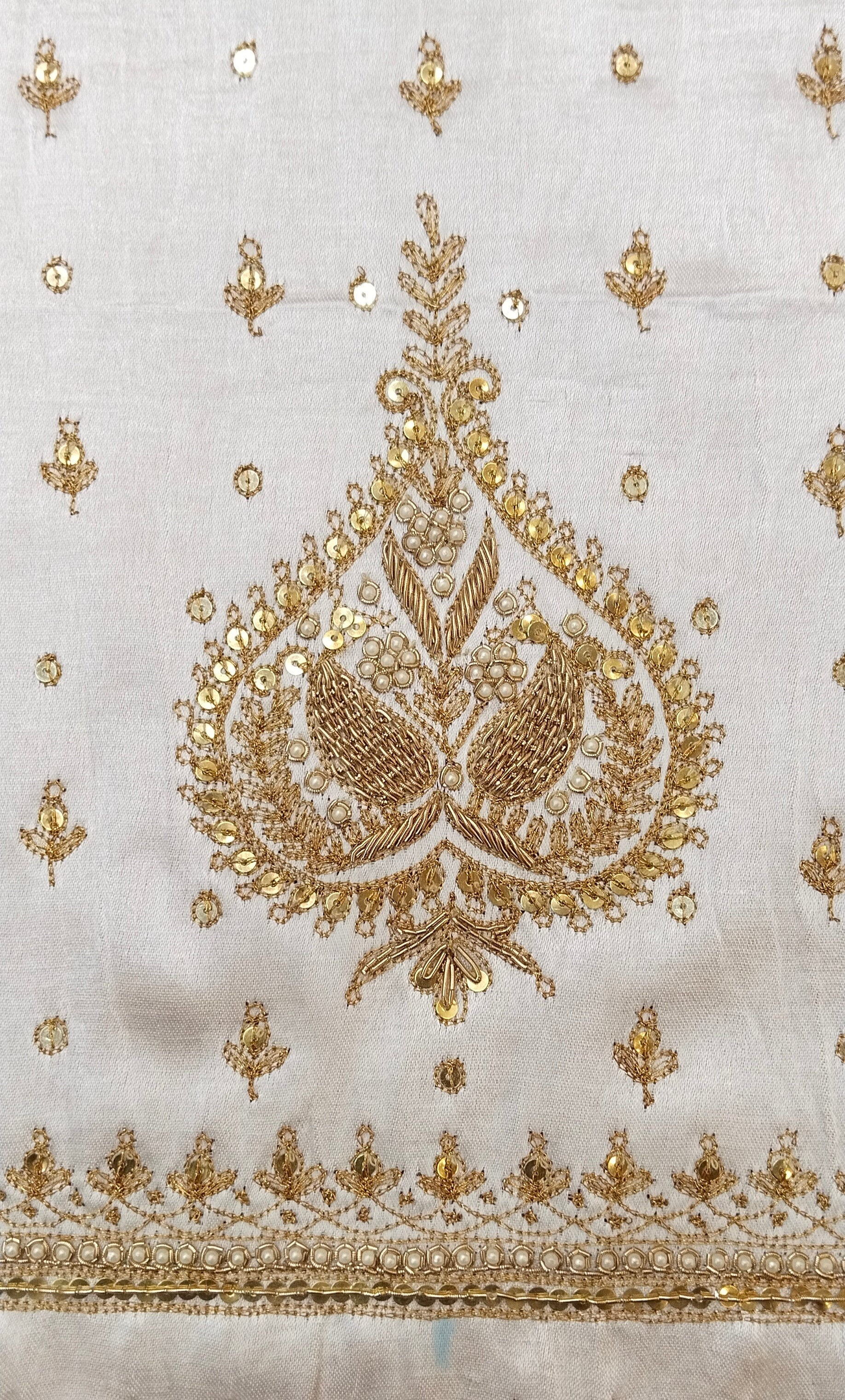 This unstitched blouse piece is crafted from premium Gaji silk, known for its rich texture and graceful drape. Adorned with timeless embroidery, the detailed sleeve and neckline patterns offer a touch of classic elegance. Perfect for festive and ethnic wear, its exquisite craftsmanship and refined design make it an ideal choice for traditional celebrations and special occasions.