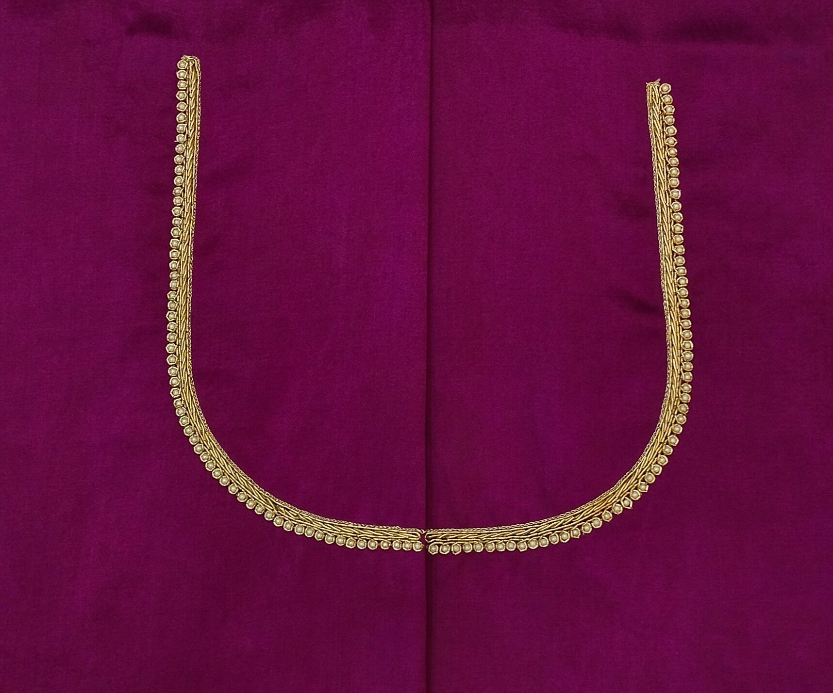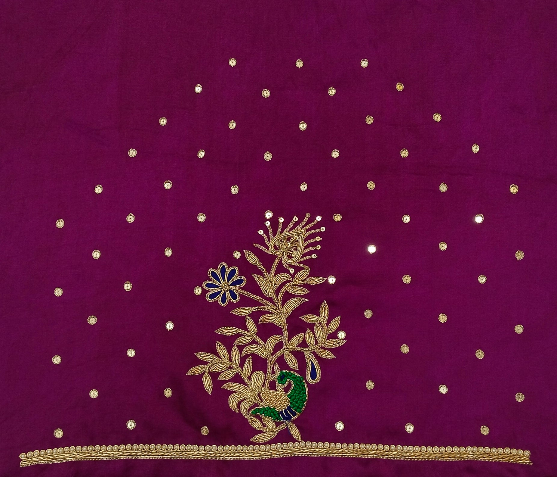 This unstitched blouse piece features a beautifully embroidered peacock motif perched amidst ornate floral vines, detailed with intricate threadwork and mirror accents. Crafted from luxurious Gaji silk, it offers a rich texture and a regal finish, perfect for pairing with traditional sarees or lehengas for festive and special occasions.