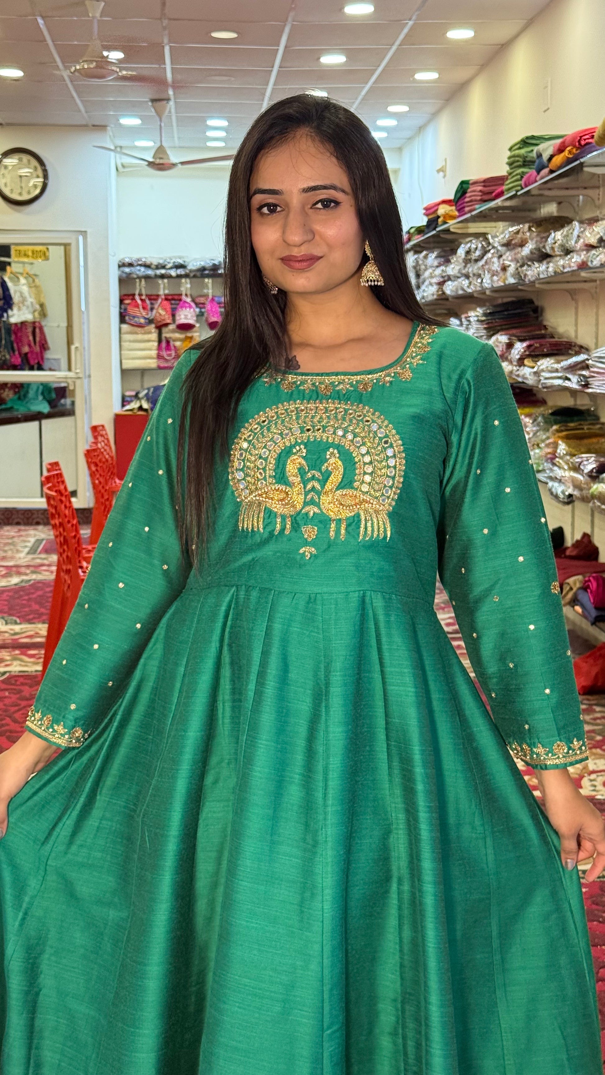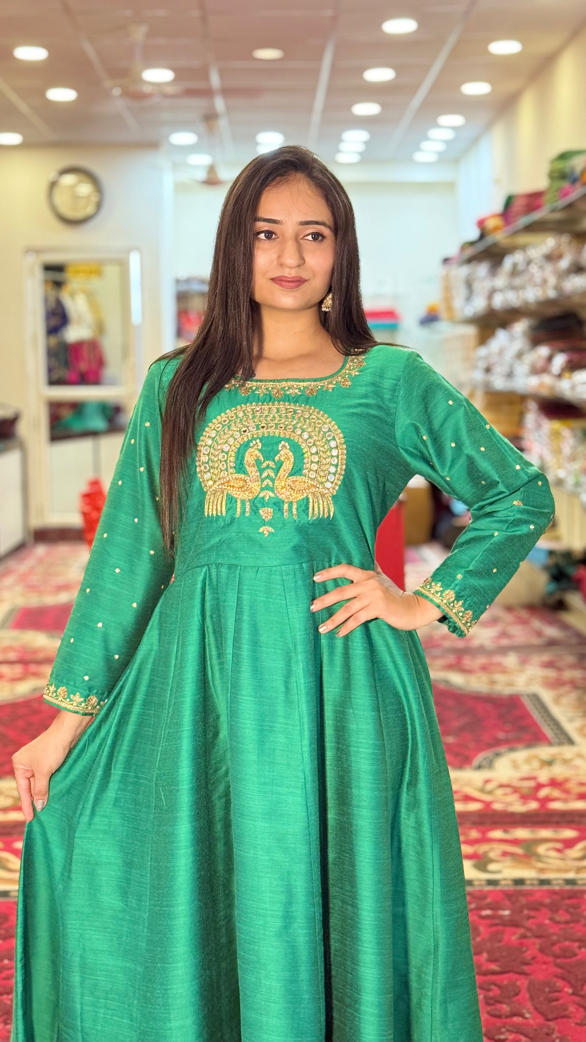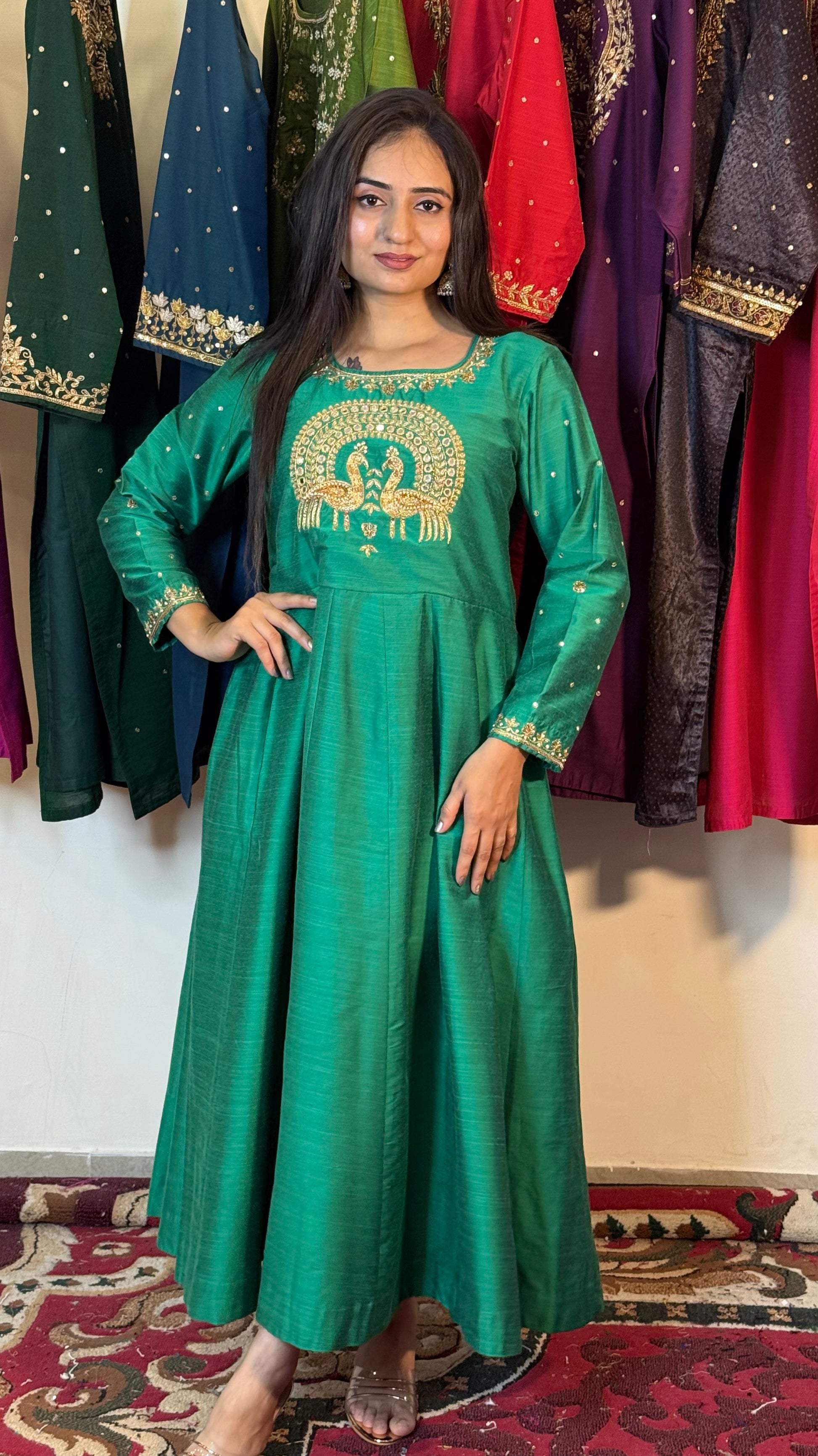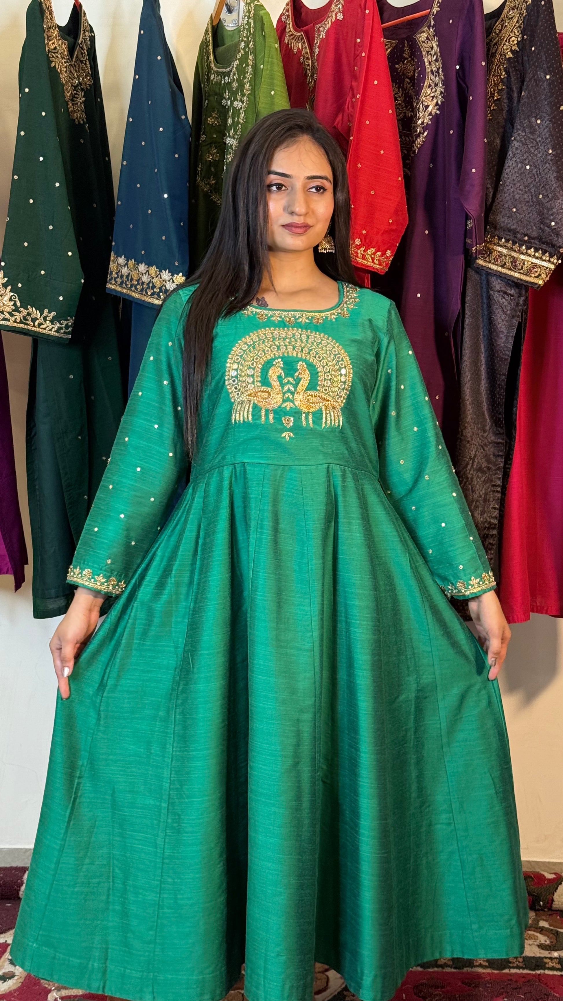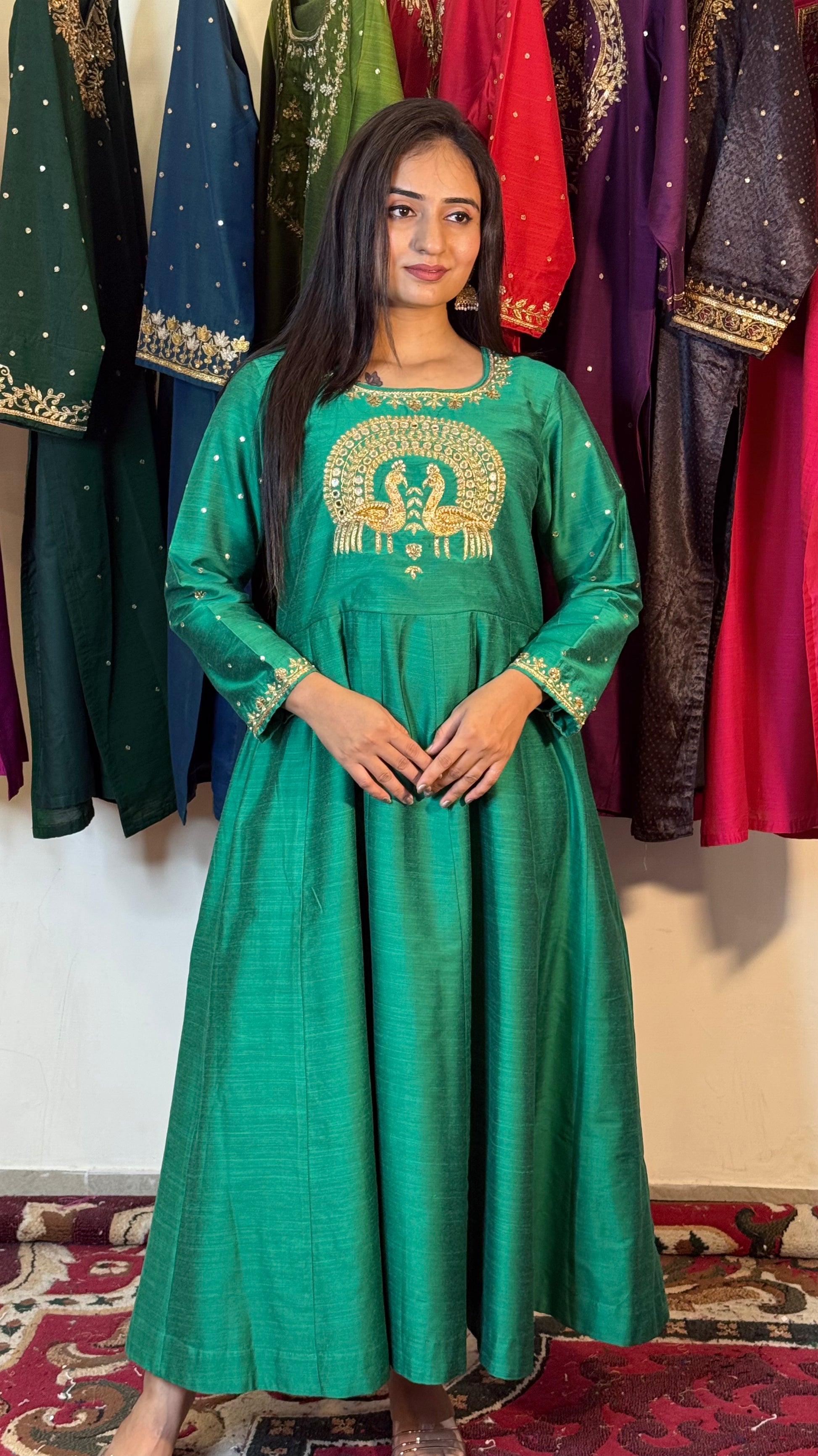 The Peacock Grace Anarkali Kurta is a stunning blend of elegance and tradition. Featuring twin peacock embroidery in regal gold on a deep green silhouette, this flared kurta is designed to flatter every festive moment. Perfect for weddings, parties, and cultural celebrations, it offers effortless charm with a royal touch.