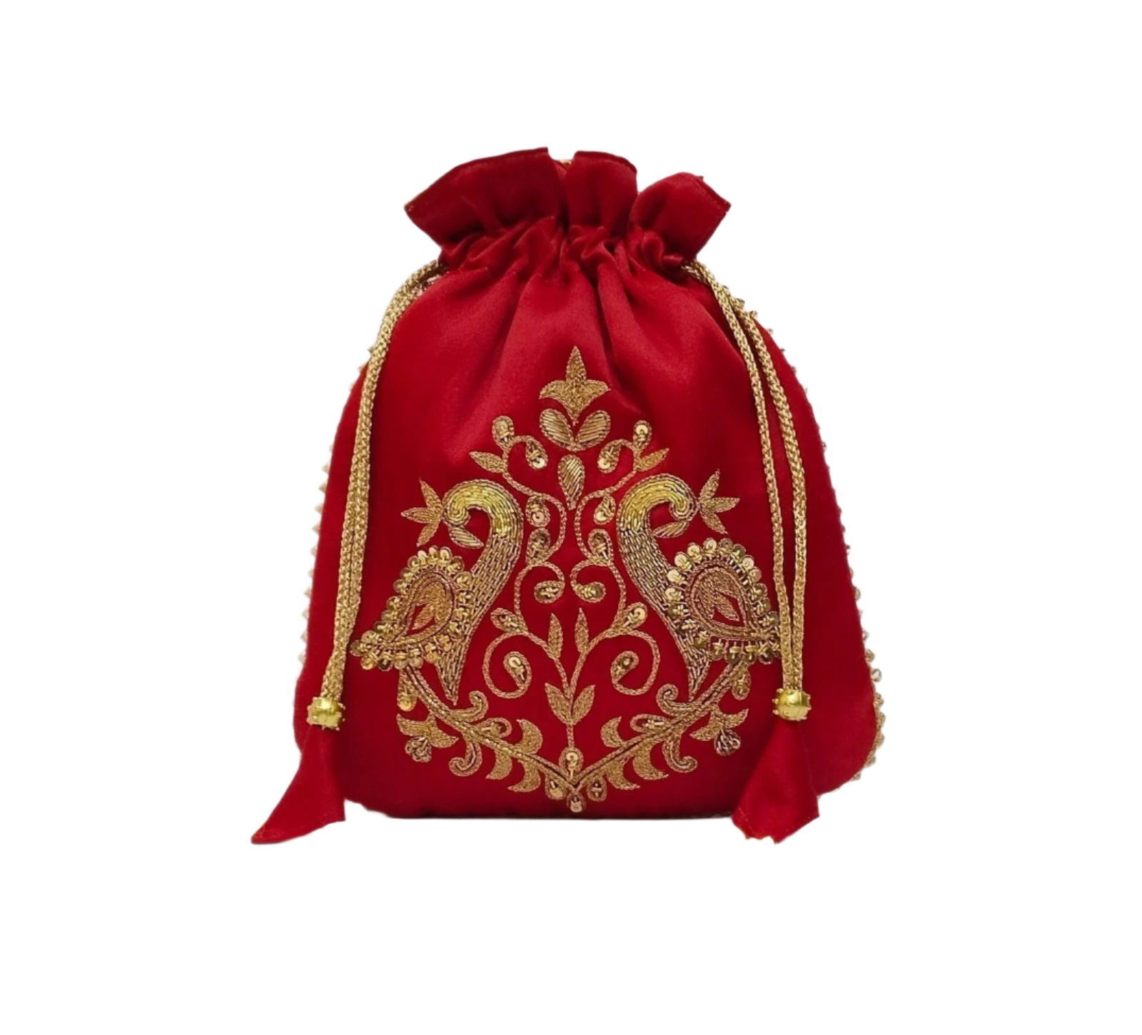 The Peacock Zardozi Potli Batwa is a luxurious handcrafted pouch adorned with intricate zardozi embroidery, featuring a majestic peacock design. Made with rich fabrics and detailed metallic threadwork, this elegant accessory is perfect for weddings and festive occasions, adding a royal touch to any outfit with its traditional yet timeless charm.