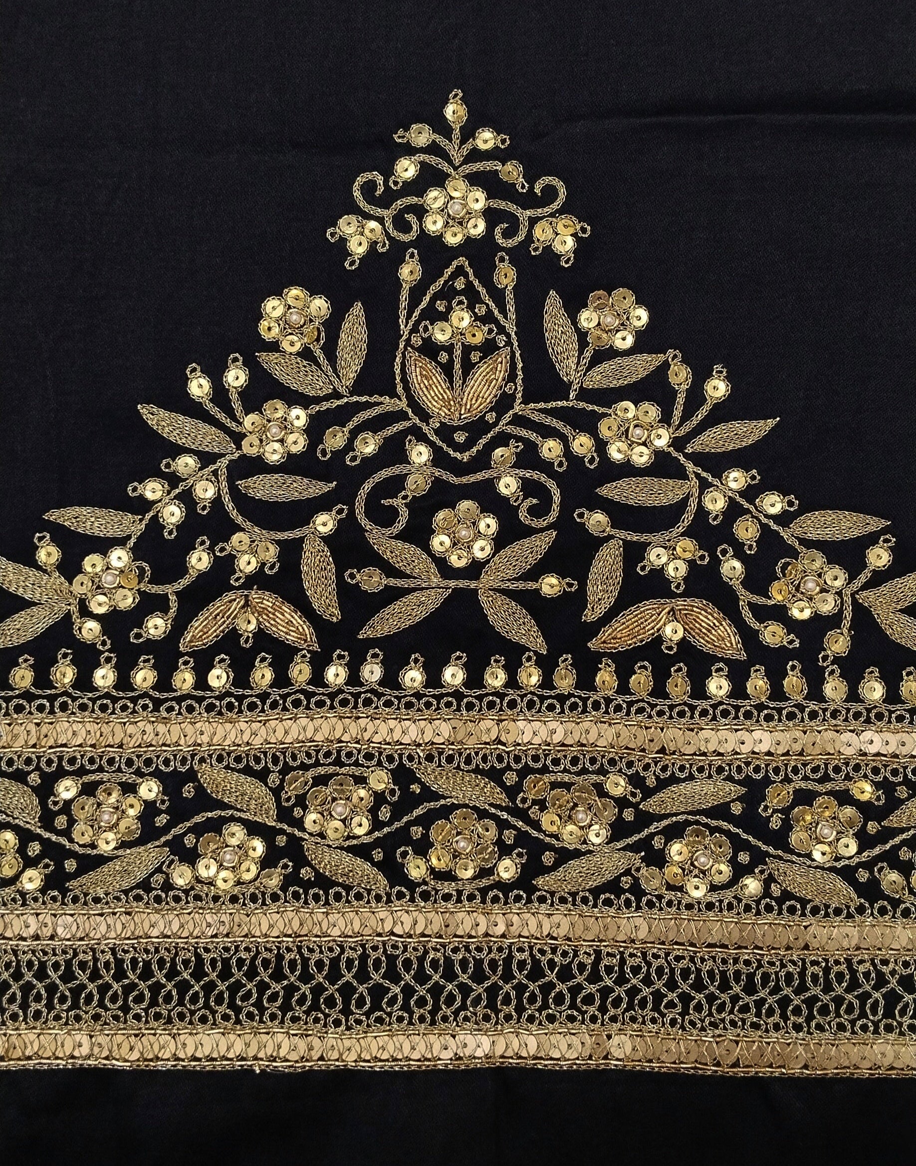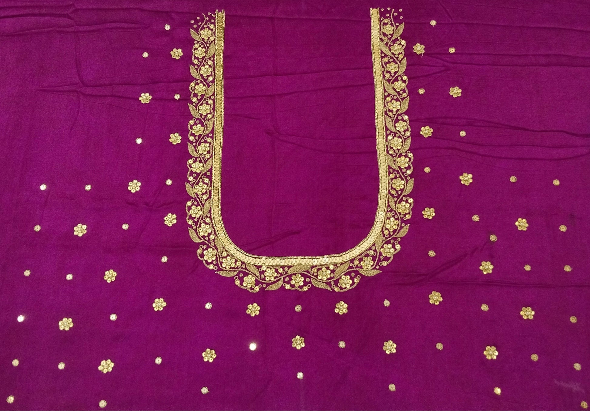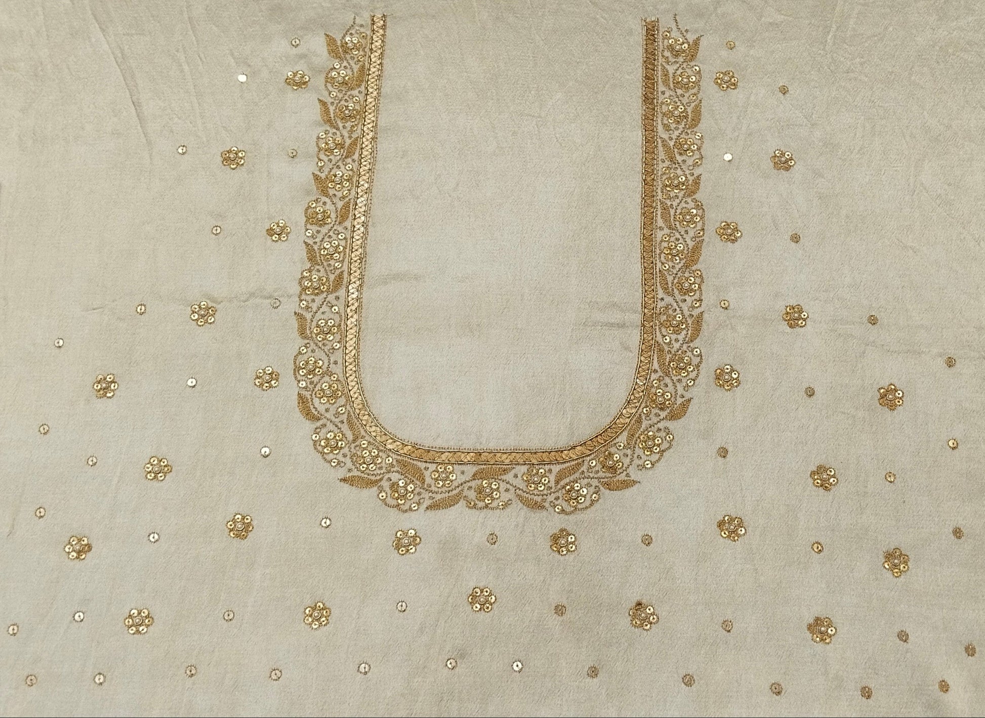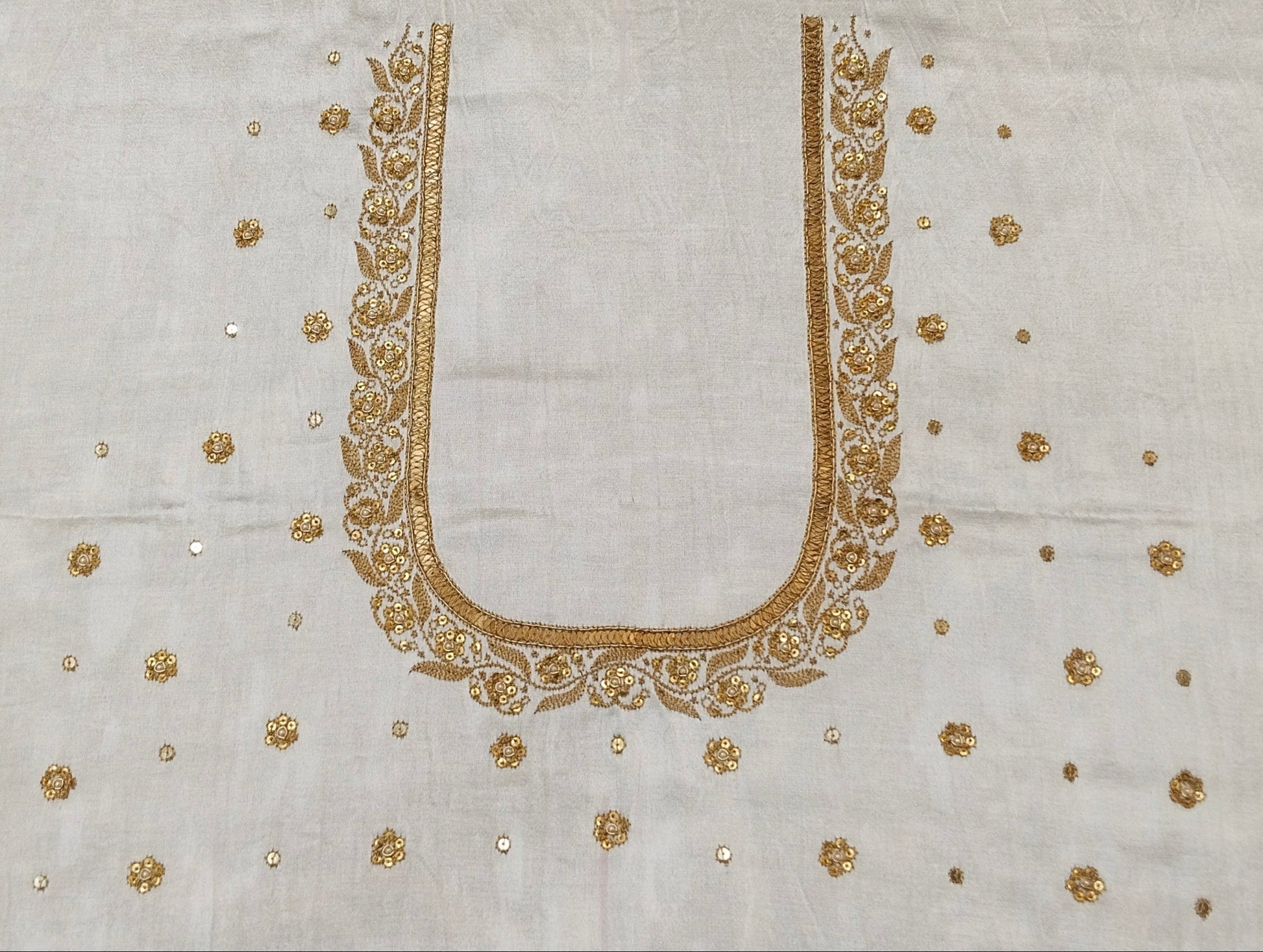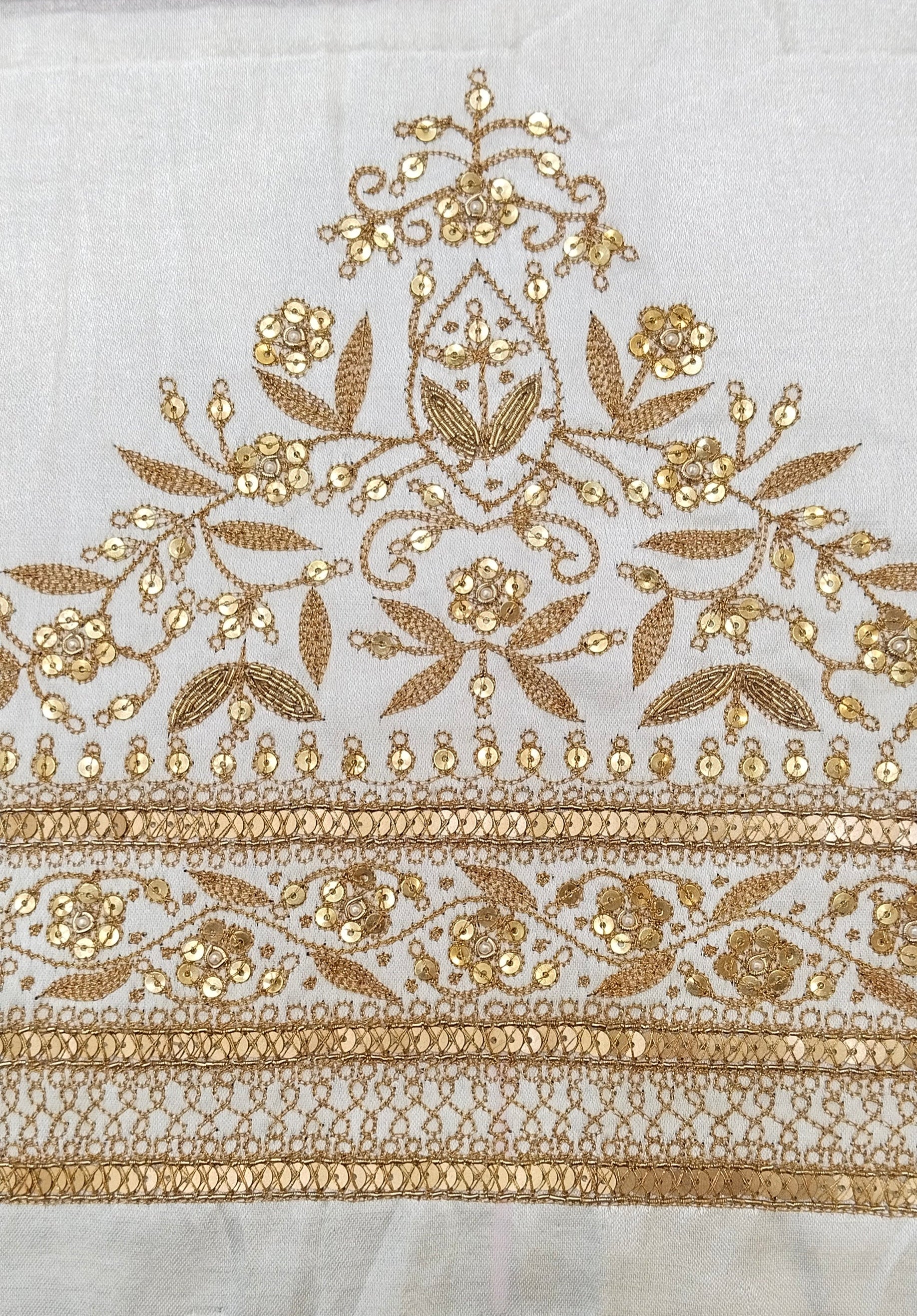 Gracefully designed with ornate embroidery and shimmering accents, this unstitched blouse piece is crafted from luxurious Gaji silk. It showcases an artistic blend of floral and geometric elements, while the central motif and intricate borders make it a refined choice for festive or occasion wear, bringing a timeless elegance to your wardrobe.