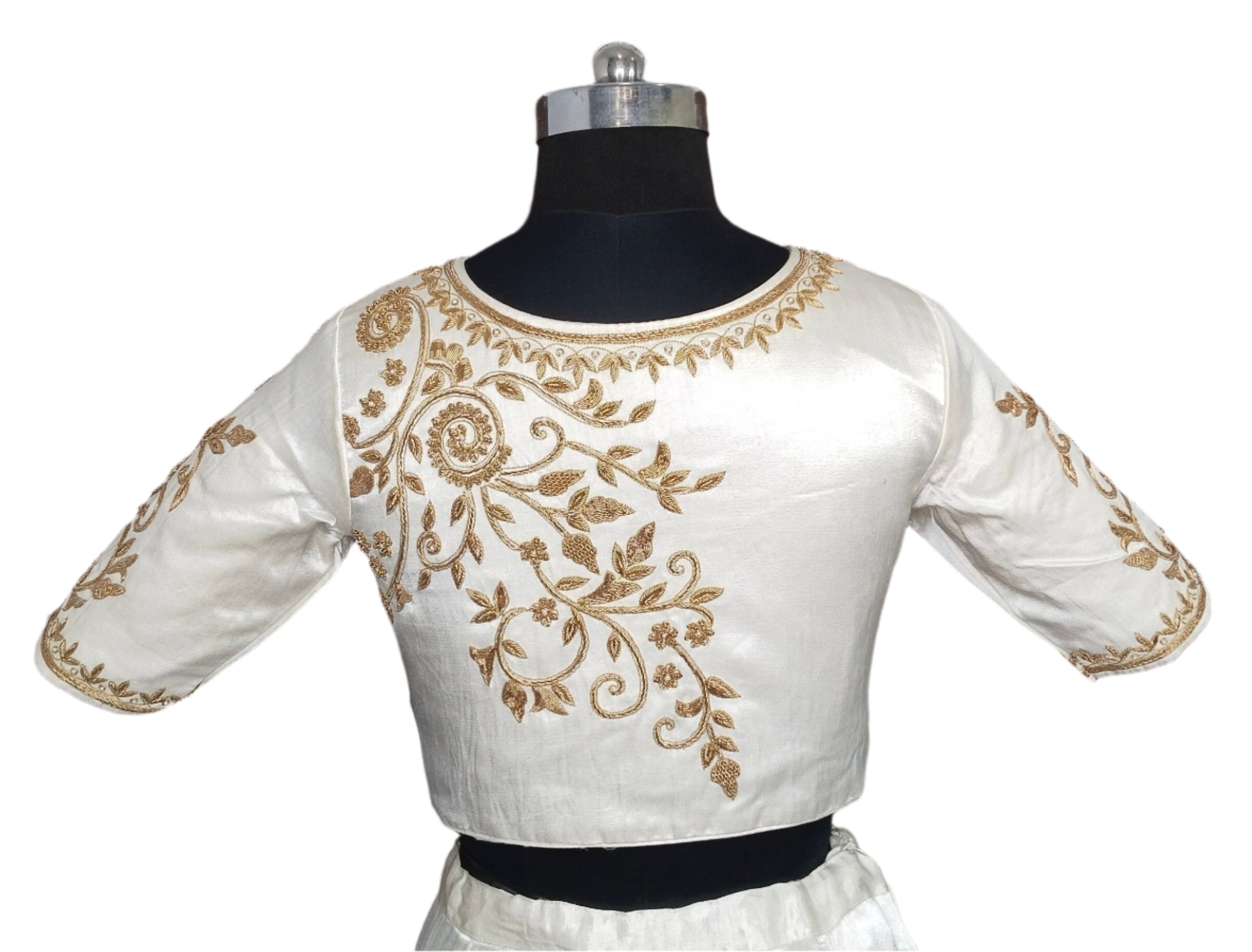 The Royal Bloom Zardozi Designer Blouse showcases exquisite hand embroidery in golden zardozi work on rich gaji silk fabric. Featuring floral and vine motifs with intricate detailing, this blouse blends royal elegance with traditional craftsmanship—perfect for festive, bridal, or ethnic occasions. Pair it with sarees or lehengas for a regal look.
