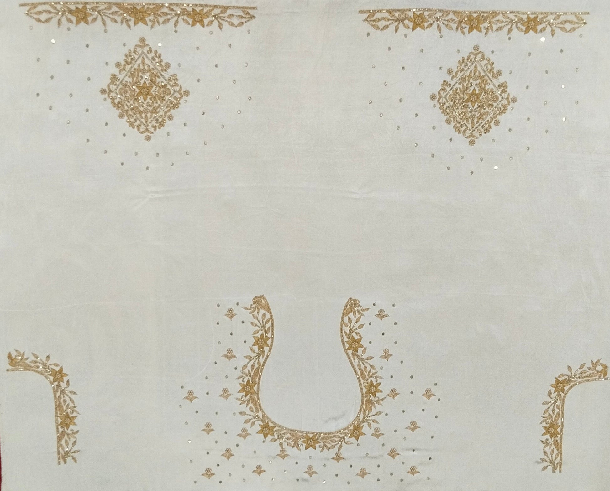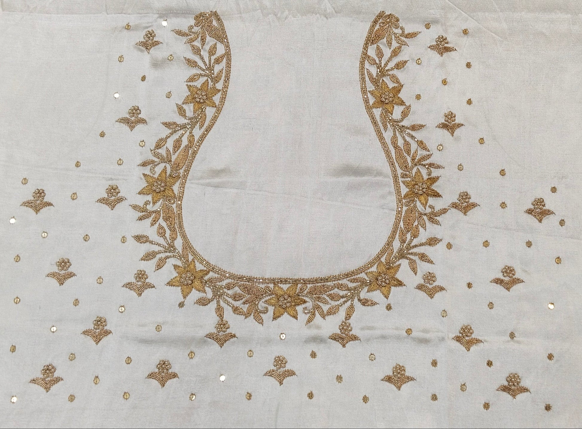 Embrace the majestic allure of the star flower zardozi work blouse pis, for a queen. The intricate Zardozi work depicting star motifs adds an elegant touch to the blouse, exuding regal charm. Crafted from premium gajji silk, the blouse offers a luxurious and comfortable fit, perfect for formal occasions or special events. Let the star-inspired design take flight and make a statement.