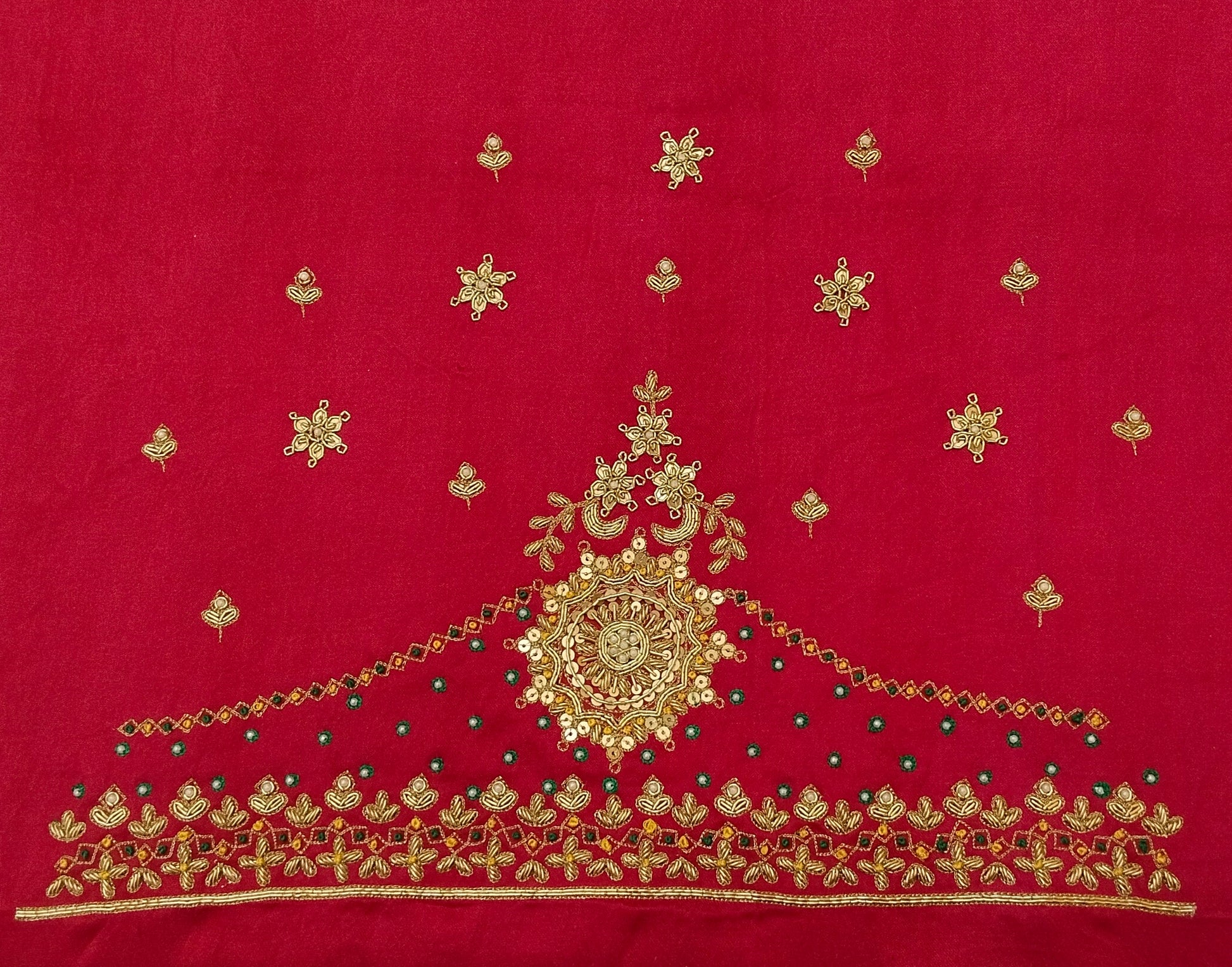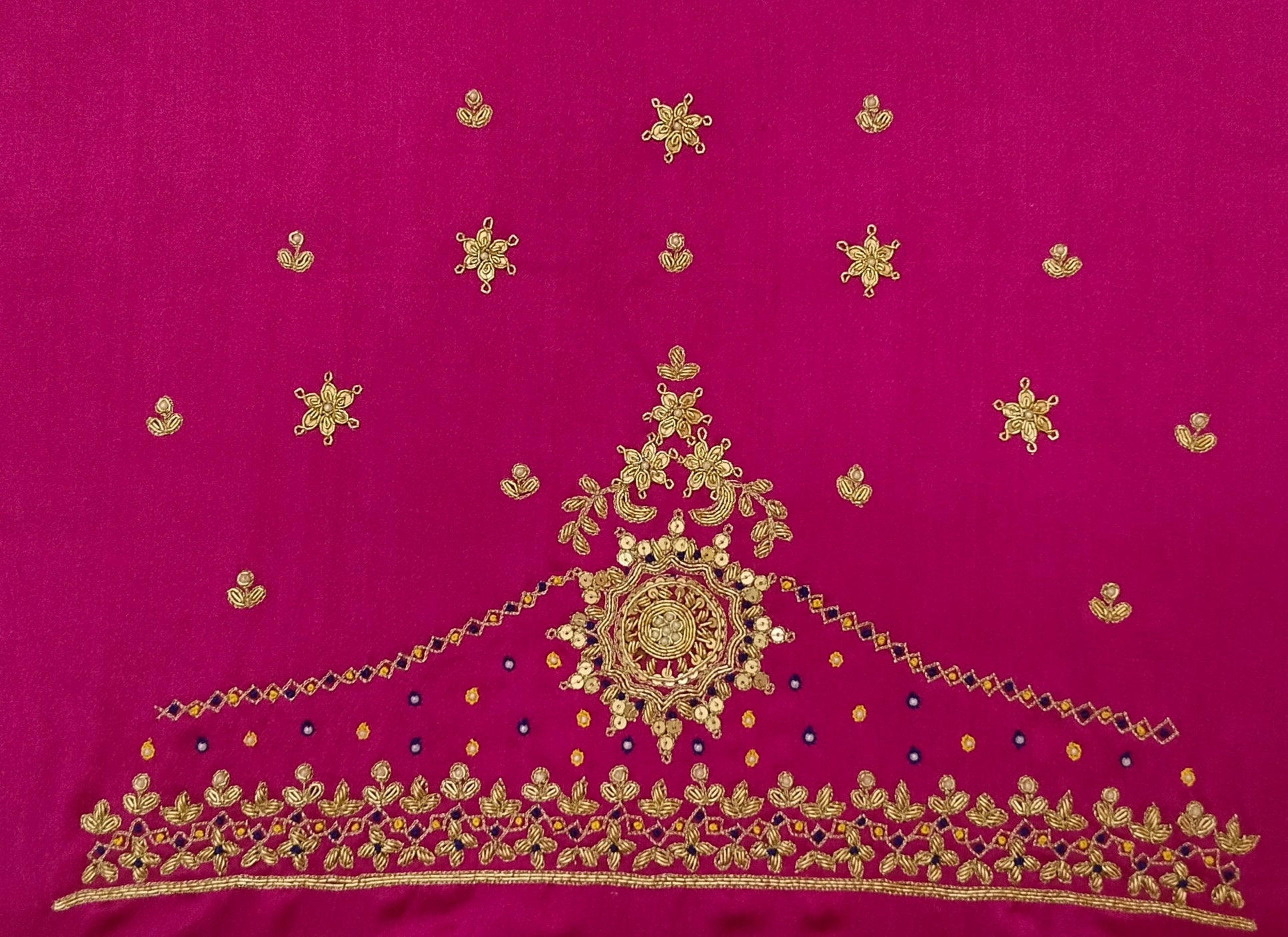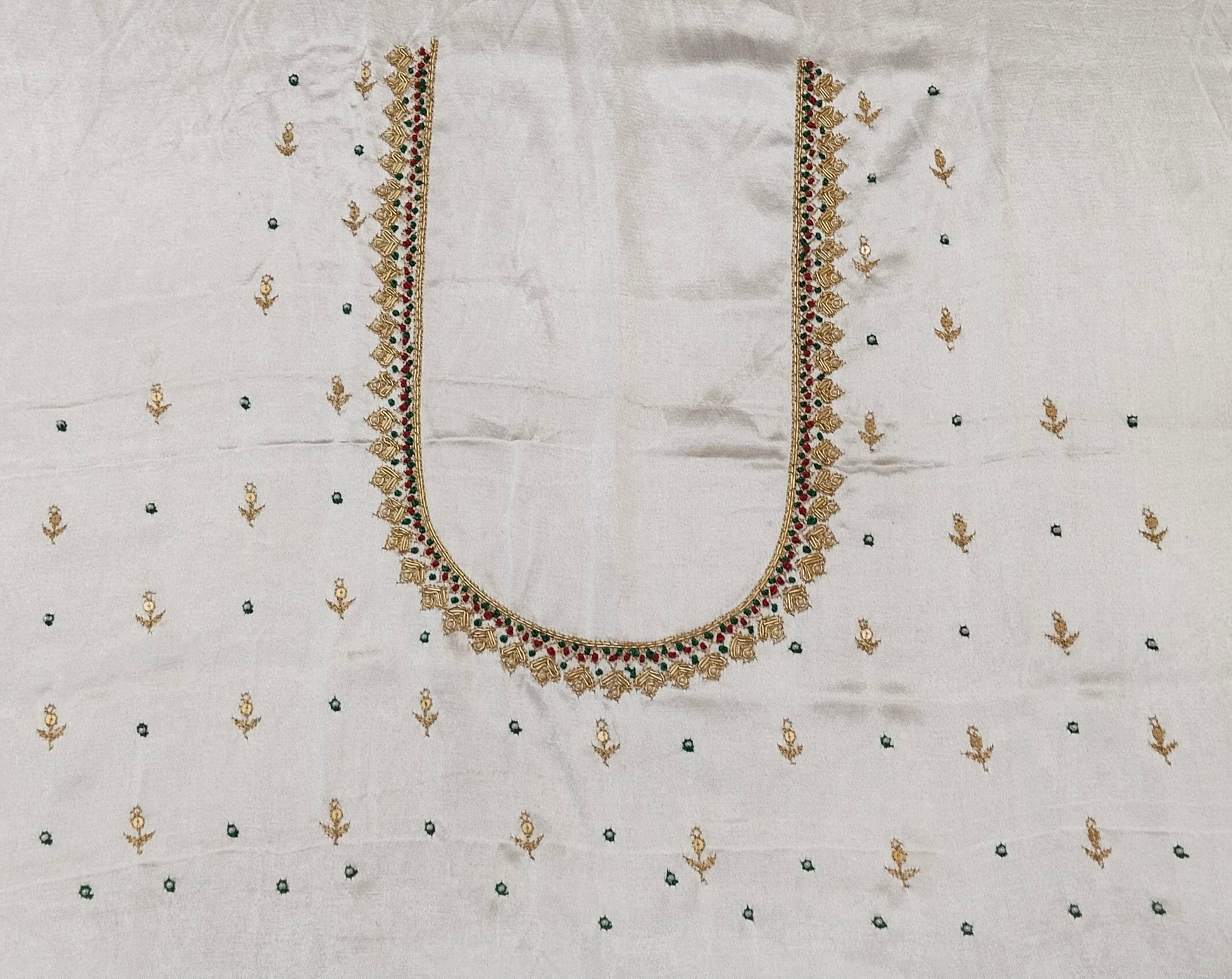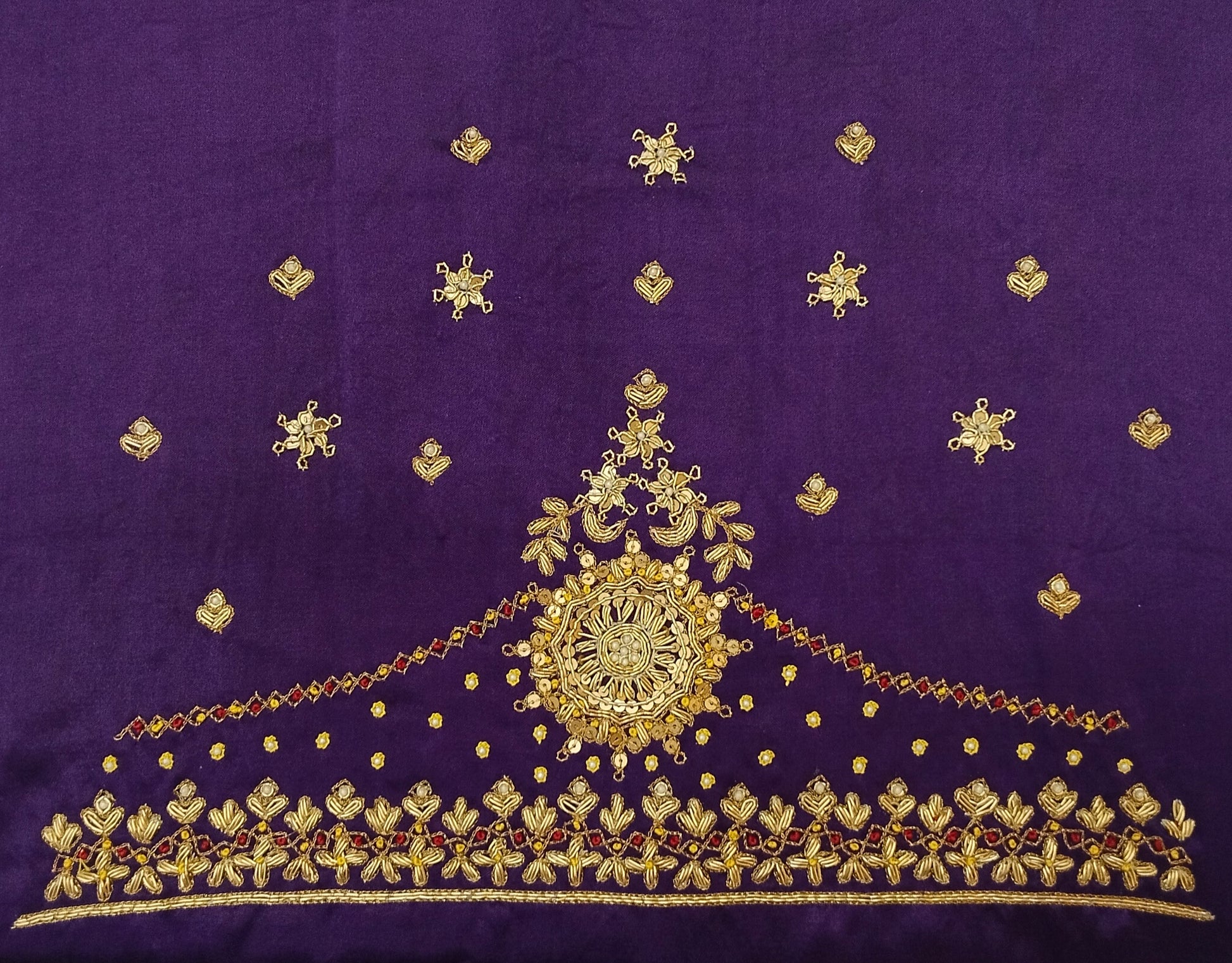 This unstitched blouse piece features a radiant sun-inspired design, echoing traditional elegance with a regal touch. Crafted from luxurious Gaji silk, the fabric showcases detailed embroidery and a smooth drape, making it perfect for festive or ceremonial wear. A blend of heritage and refined craftsmanship, it elevates any ethnic ensemble with timeless charm.