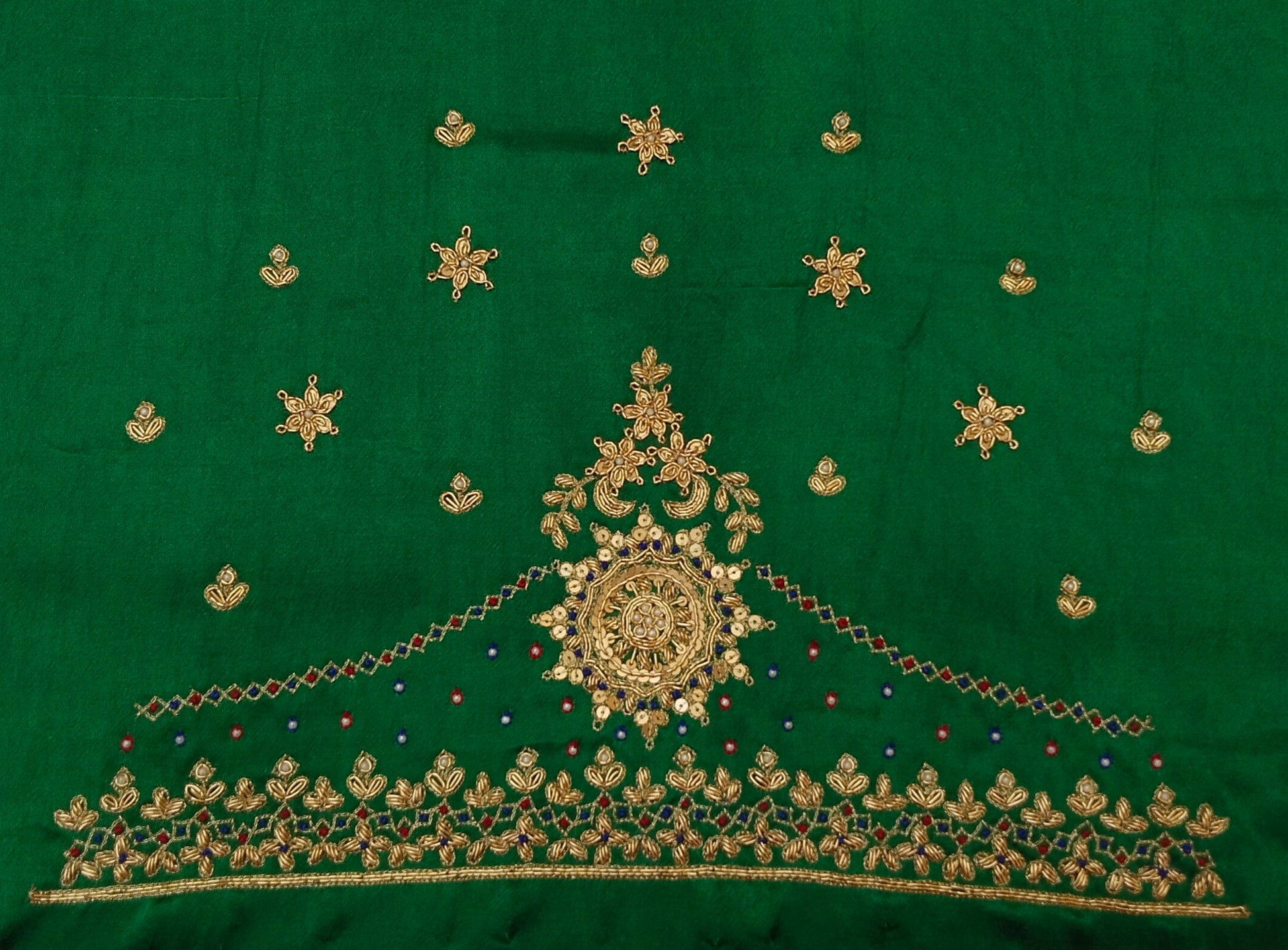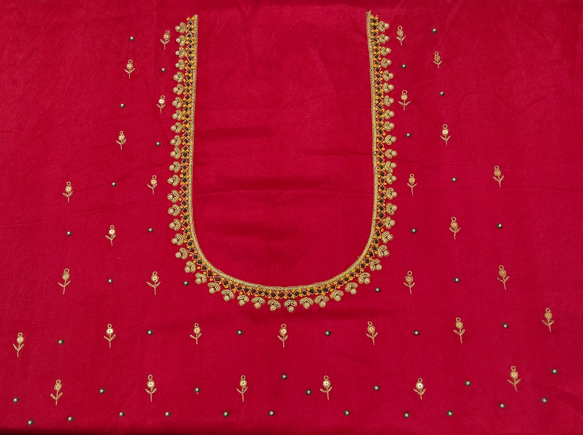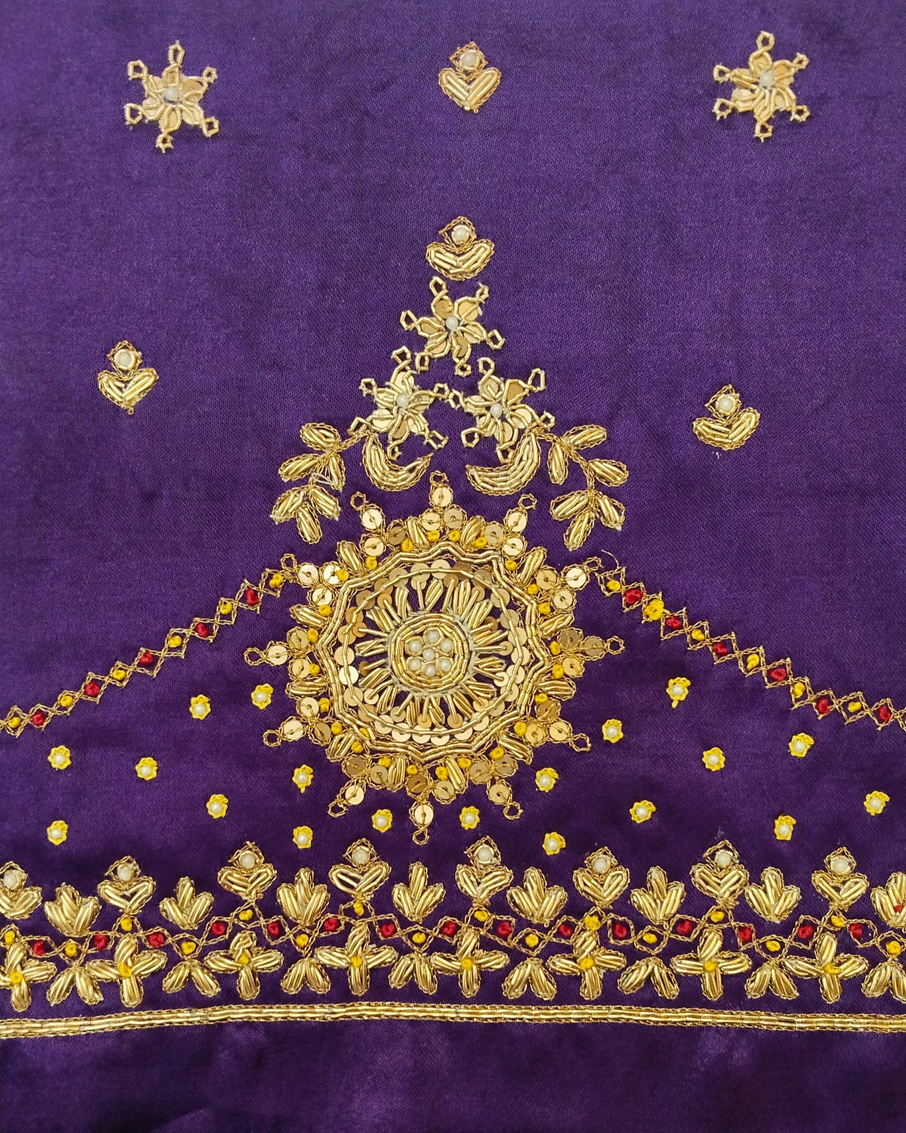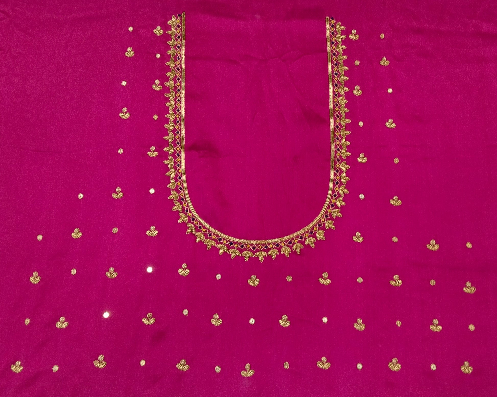 This unstitched blouse piece features a radiant sun-inspired design, echoing traditional elegance with a regal touch. Crafted from luxurious Gaji silk, the fabric showcases detailed embroidery and a smooth drape, making it perfect for festive or ceremonial wear. A blend of heritage and refined craftsmanship, it elevates any ethnic ensemble with timeless charm.