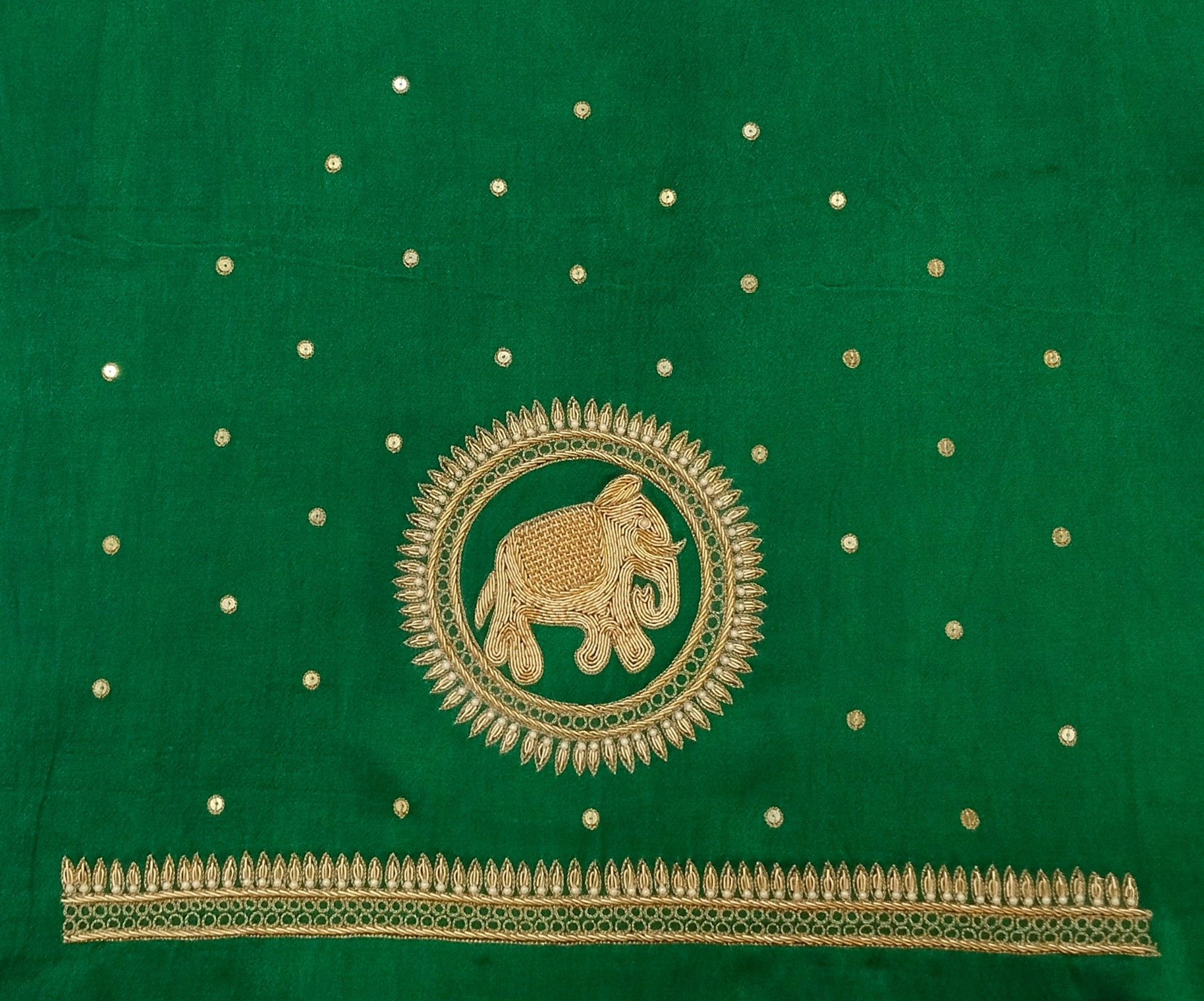 This unstitched blouse piece showcases a refined elephant motif, inspired by heritage art and symbolic grace. Designed on premium Gaji silk, the fabric offers a soft sheen and elegant drape. Ideal for pairing with sarees or lehengas, it adds a touch of cultural richness and sophistication to festive or ceremonial attire.