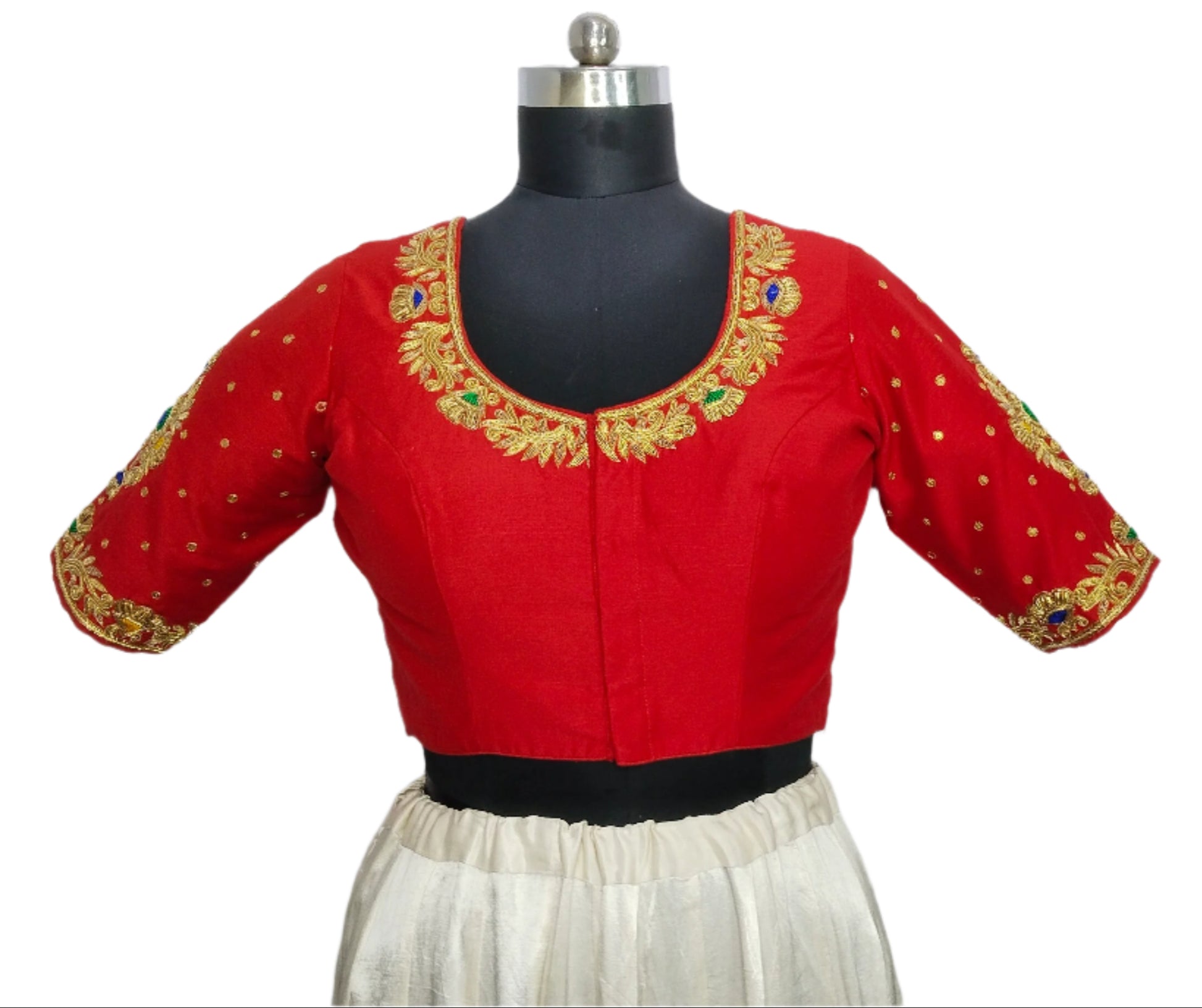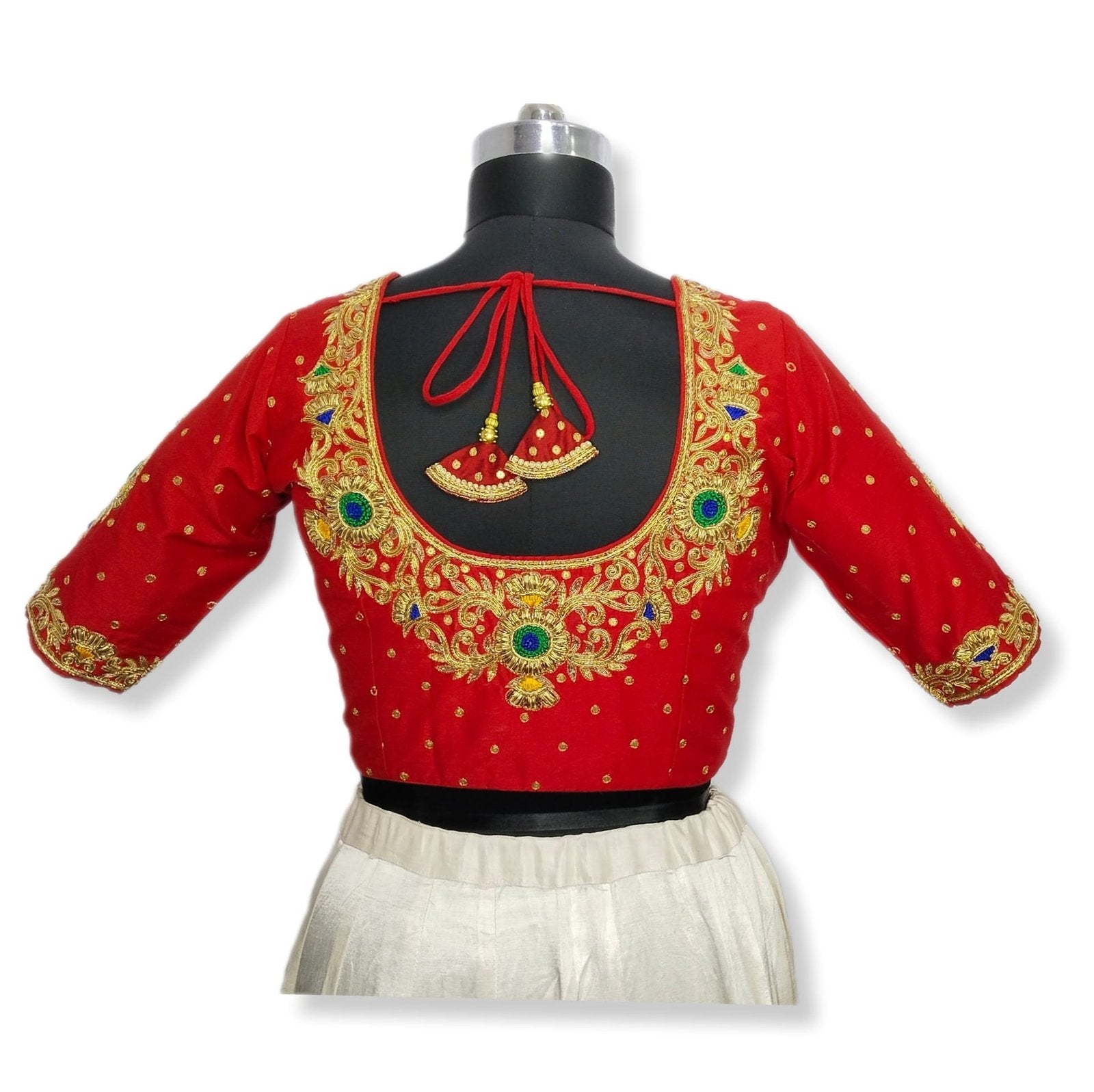 Embrace regal elegance with the Zardozi Bloom Designer Blouse. Adorned with intricate zardozi embroidery and floral motifs, this blouse exudes luxury and timeless beauty. Perfect for weddings and festive celebrations, it pairs beautifully with sarees or lehengas, adding a touch of opulence to your traditional ensemble.