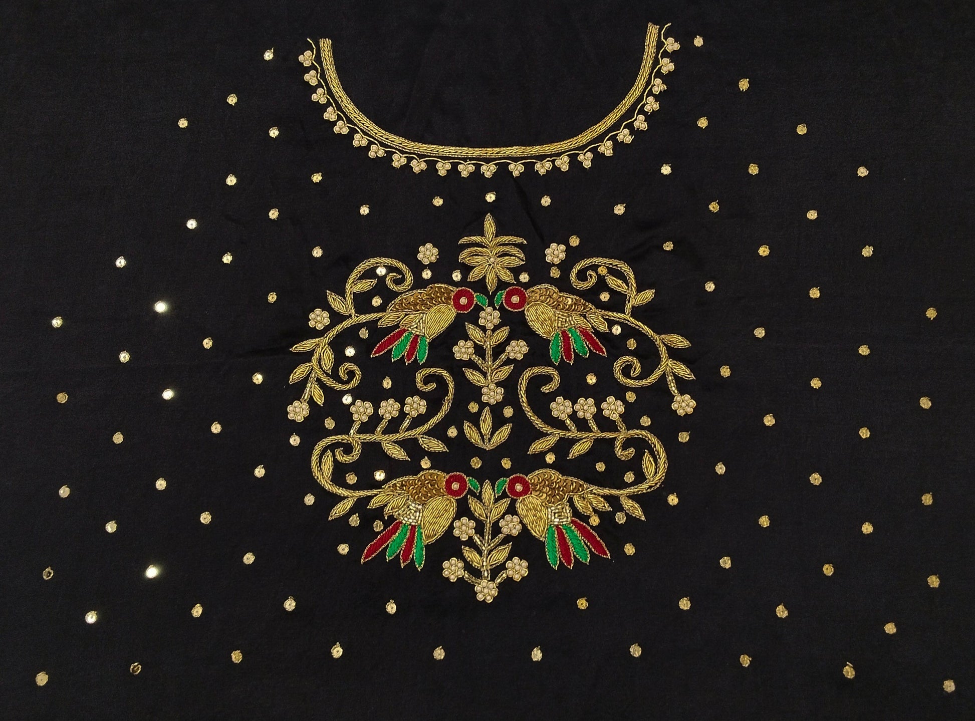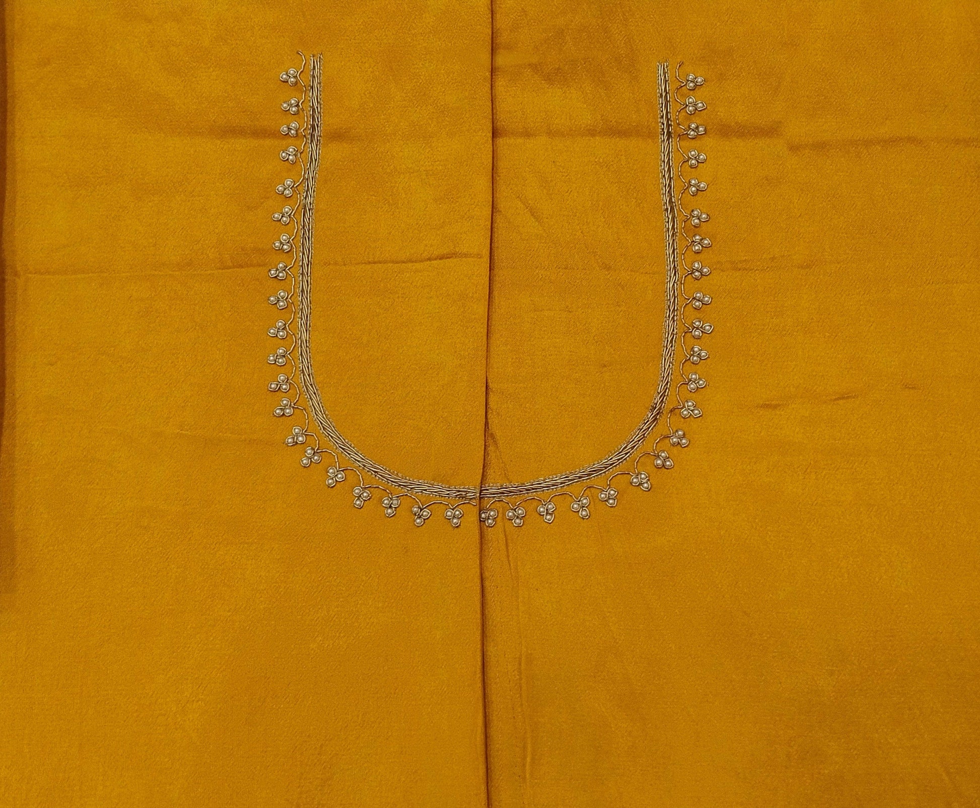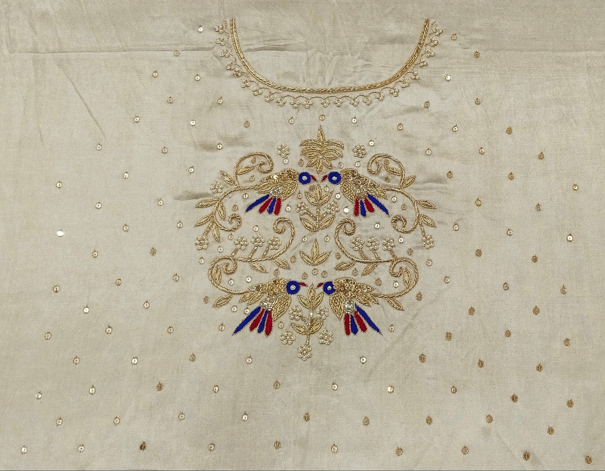 This unstitched blouse piece is crafted from luxurious Gaji silk, known for its rich texture and graceful drape. The design features intricate zari embroidery with vibrant parrots perched amidst delicate floral vines, creating a stunning traditional motif. Embellished with fine detailing and an ornate neckline pattern, this piece brings elegance and cultural charm to any ethnic ensemble. Ideal for pairing with sarees or lehengas, it’s perfect for festive occasions and special celebrations.