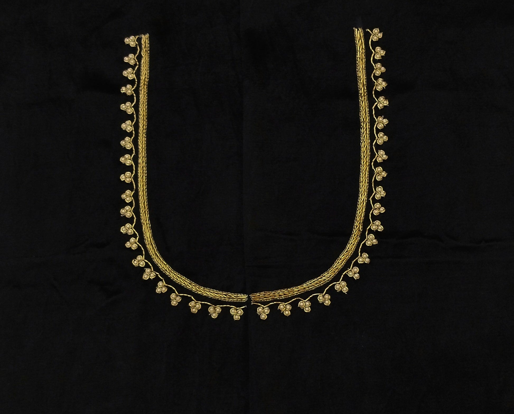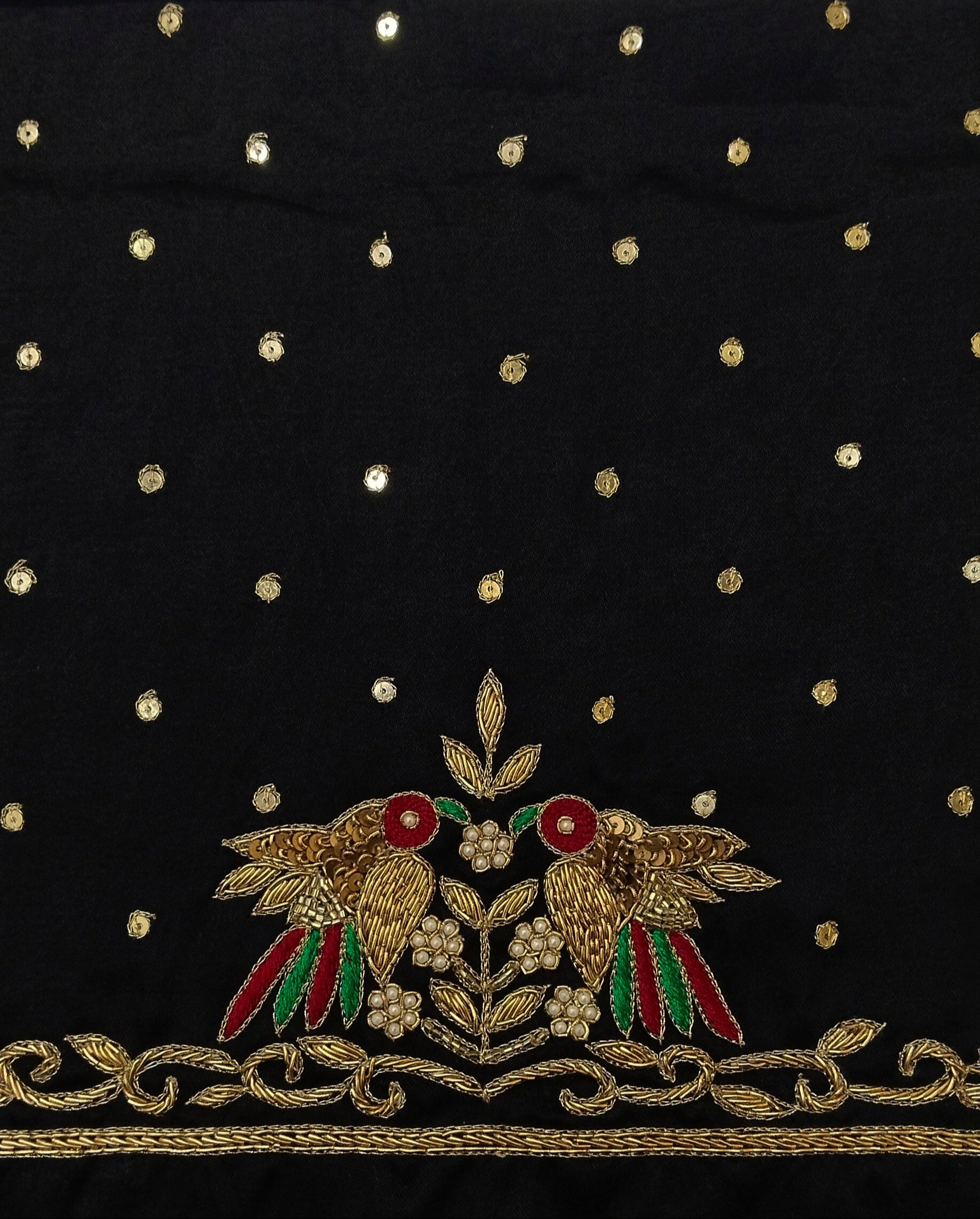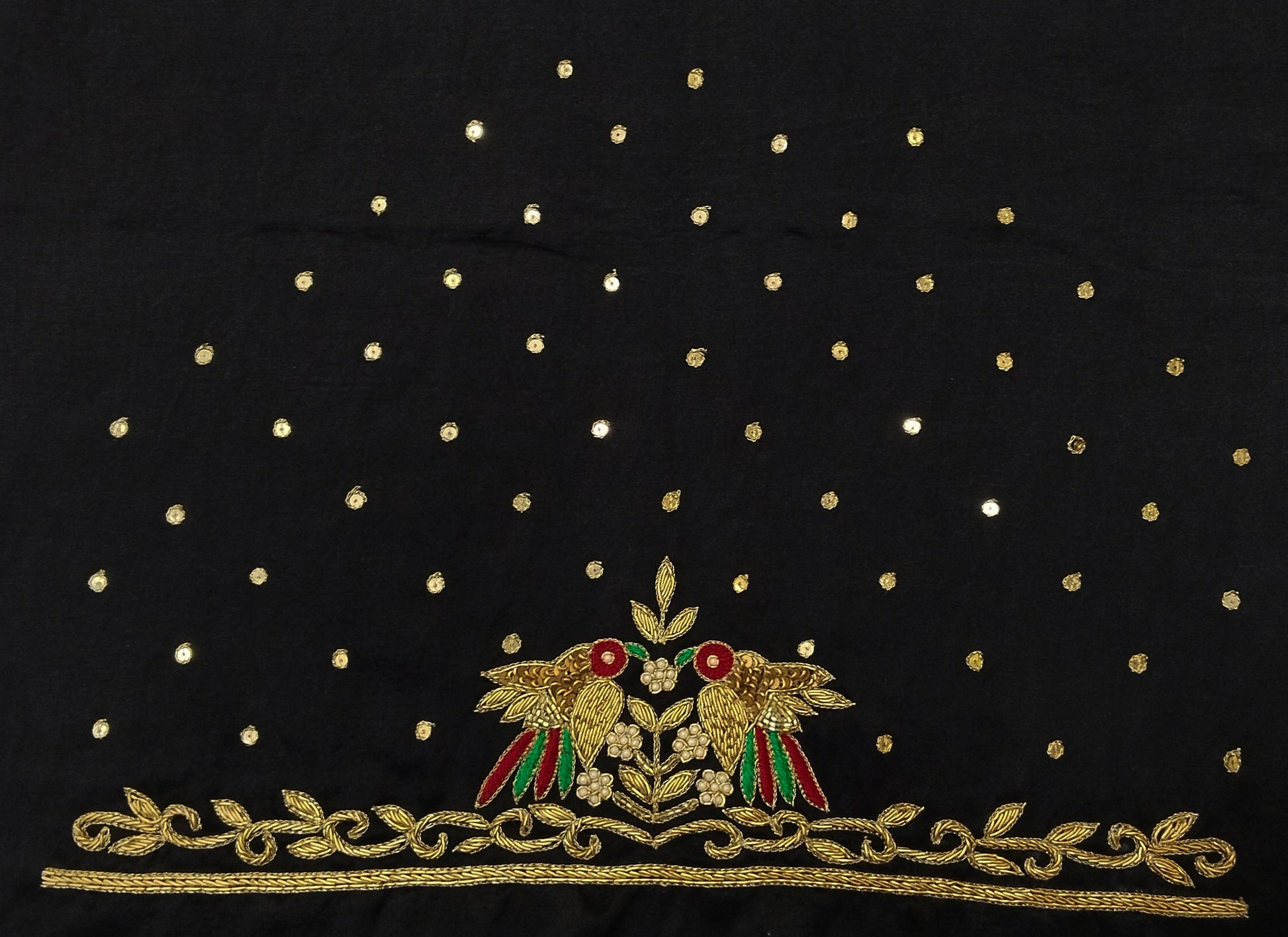 This unstitched blouse piece is crafted from luxurious Gaji silk, known for its rich texture and graceful drape. The design features intricate zari embroidery with vibrant parrots perched amidst delicate floral vines, creating a stunning traditional motif. Embellished with fine detailing and an ornate neckline pattern, this piece brings elegance and cultural charm to any ethnic ensemble. Ideal for pairing with sarees or lehengas, it’s perfect for festive occasions and special celebrations.