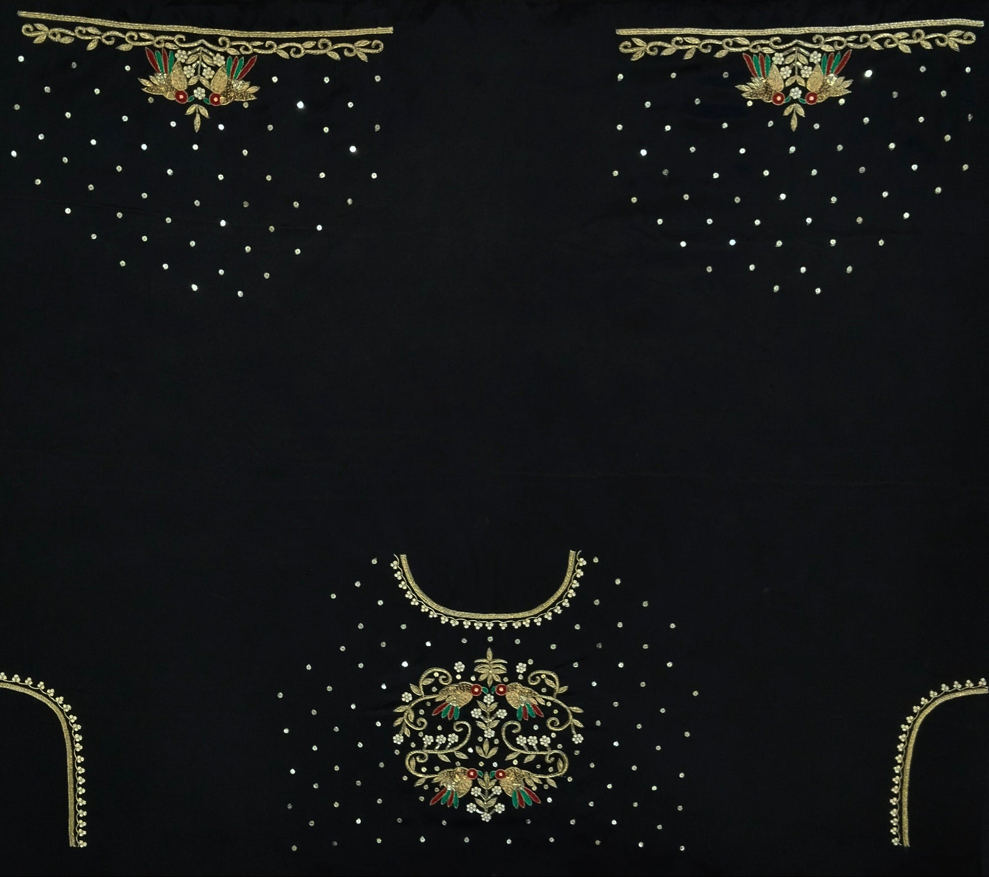 This unstitched blouse piece is crafted from luxurious Gaji silk, known for its rich texture and graceful drape. The design features intricate zari embroidery with vibrant parrots perched amidst delicate floral vines, creating a stunning traditional motif. Embellished with fine detailing and an ornate neckline pattern, this piece brings elegance and cultural charm to any ethnic ensemble. Ideal for pairing with sarees or lehengas, it’s perfect for festive occasions and special celebrations.