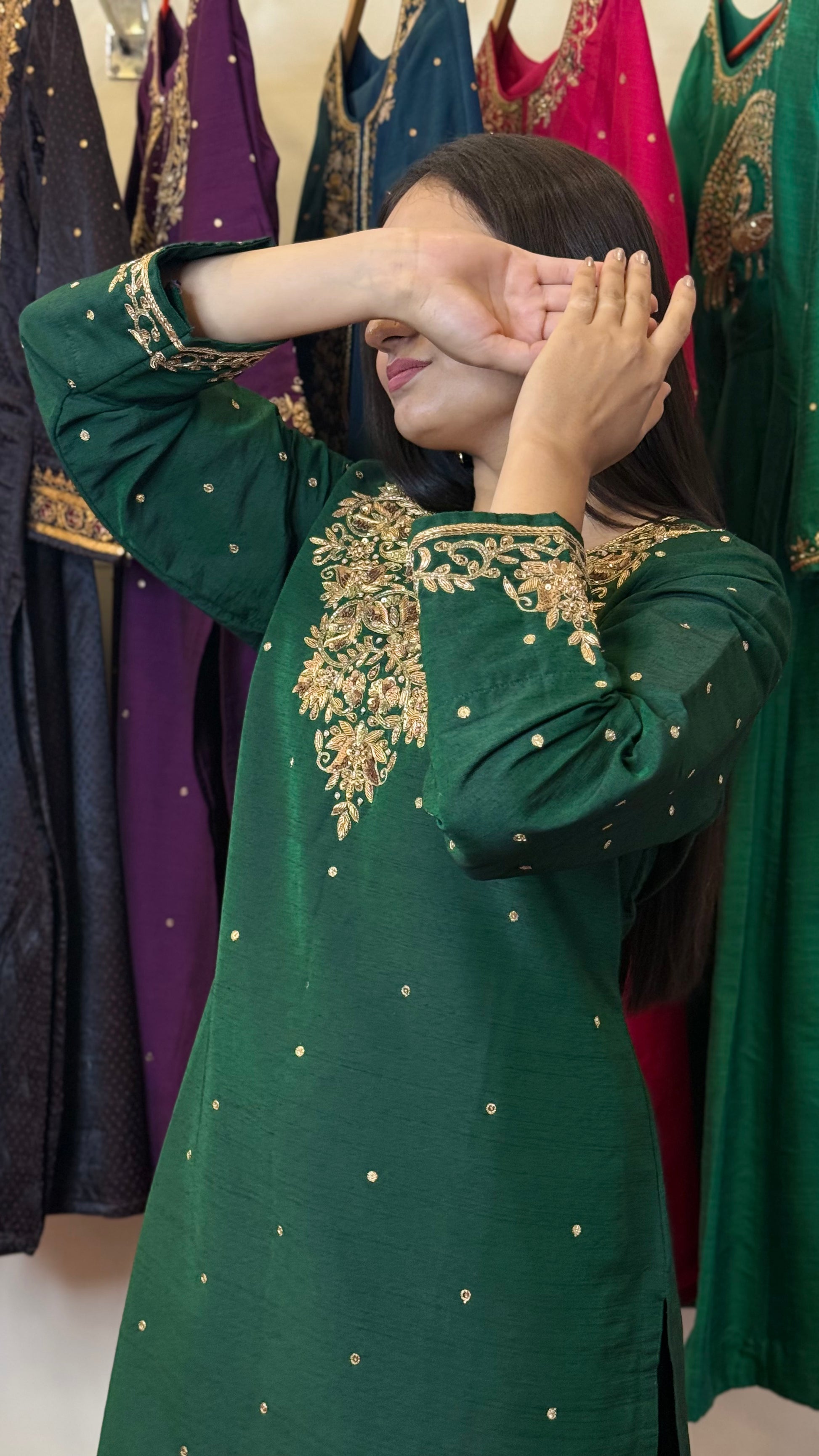 Unveil timeless charm with the Zarqa Elegance Kurta Set, crafted from luxurious Gaji silk. Adorned with delicate golden embroidery on the neckline and sleeves, this rich green ensemble offers a regal touch for festive gatherings, weddings, or special evenings. The soft, luminous texture of Gaji silk ensures unmatched comfort while exuding graceful sophistication.