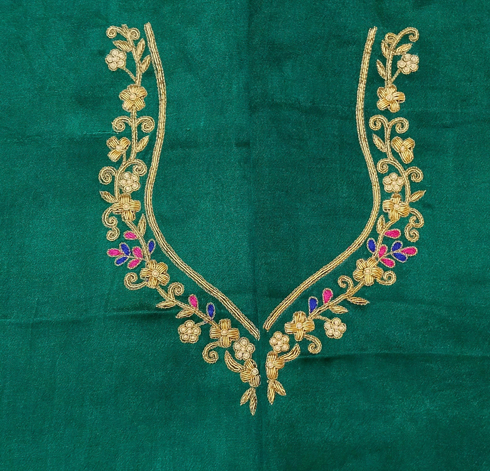 This unstitched blouse piece is crafted from premium Gaji silk, known for its rich texture and graceful drape. Intricately detailed with fine thread embroidery, it reflects a poetic blend of tradition and artistry. The ornate neckline and sleeve patterns lend an air of quiet sophistication, perfect for enhancing festive and ethnic ensembles with timeless elegance.