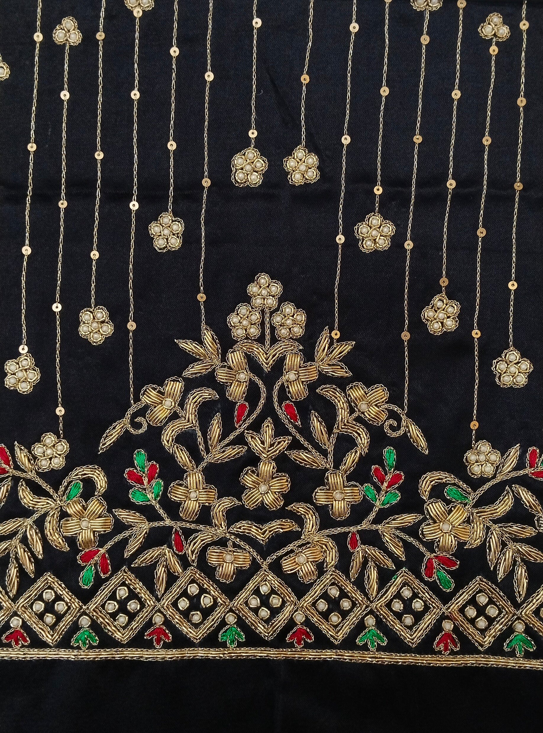 This unstitched blouse piece is crafted from premium Gaji silk, known for its rich texture and graceful drape. Intricately detailed with fine thread embroidery, it reflects a poetic blend of tradition and artistry. The ornate neckline and sleeve patterns lend an air of quiet sophistication, perfect for enhancing festive and ethnic ensembles with timeless elegance.