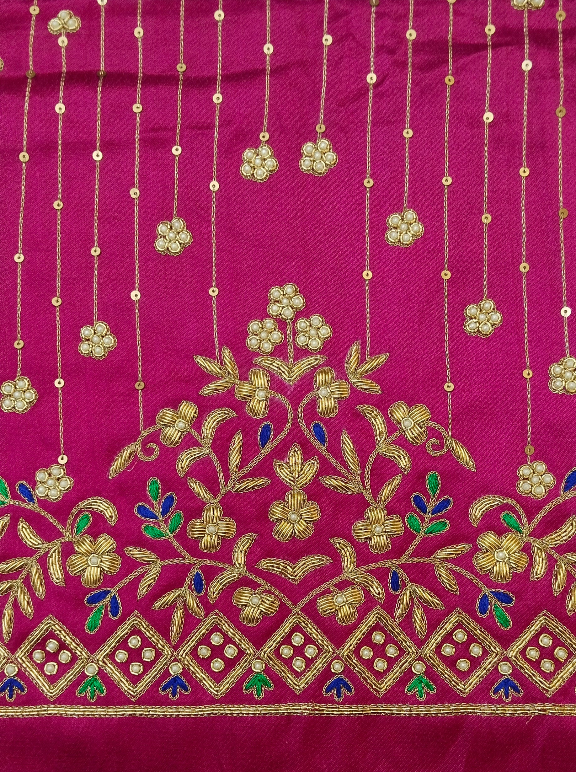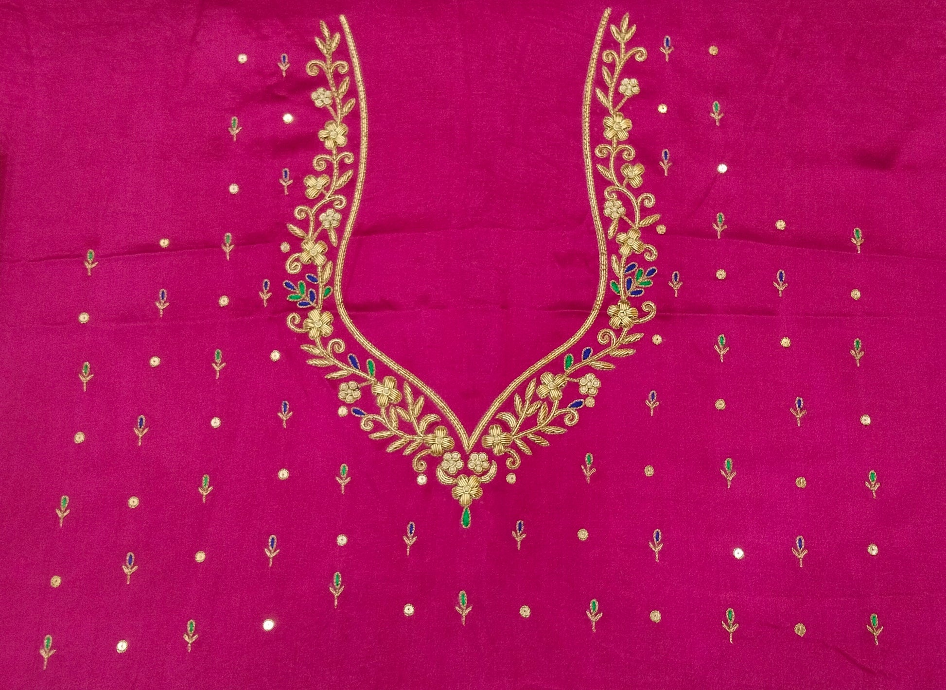 This unstitched blouse piece is crafted from premium Gaji silk, known for its rich texture and graceful drape. Intricately detailed with fine thread embroidery, it reflects a poetic blend of tradition and artistry. The ornate neckline and sleeve patterns lend an air of quiet sophistication, perfect for enhancing festive and ethnic ensembles with timeless elegance.